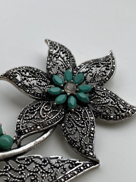 Vintage Silver Tone Filigree Flower Brooch with Green Stones – Ornate Floral Statement Pin
