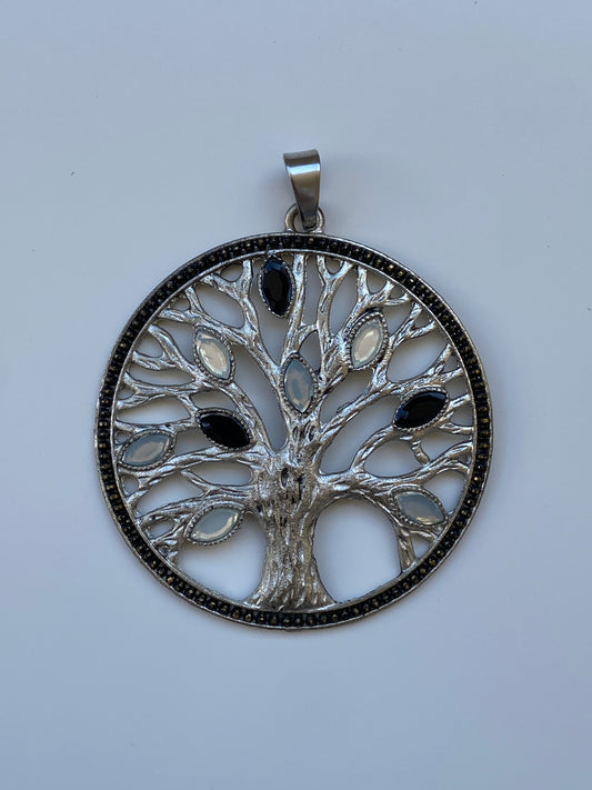 Vintage Silver Tone Tree of Life Pendant with Black & White Stones – Statement Necklace Charm
