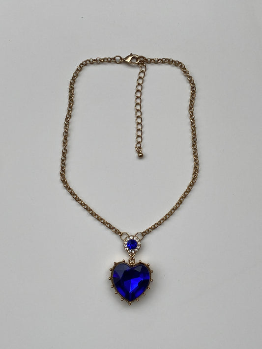 Vintage Gold Tone Royal Blue Heart Pendant Necklace with Rhinestones – Statement Charm