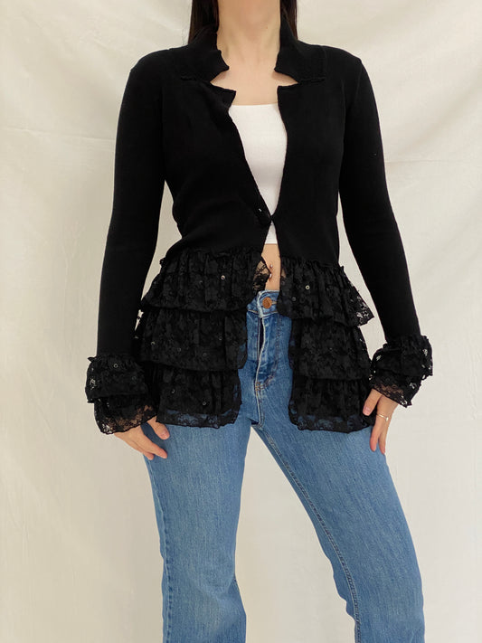 00s Jacqueline Riu Brown Ruffled Trim Tie Front Cropped Cardigan - L