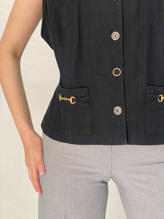 Vintage 1990s Robbie Bee Black Cotton Linen Blend Vest Gold Hardware Detail - XL