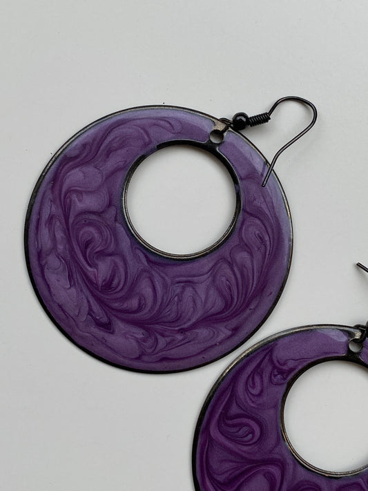 Vintage 70s Style Purple Marbled Resin Hoop Earrings Mod Disc Dangles