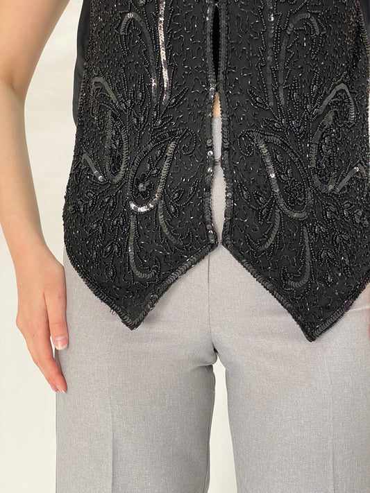 Vintage 90s Diamond Collection Black Beaded & Sequined Evening Silk Vest Art Deco Glam - L
