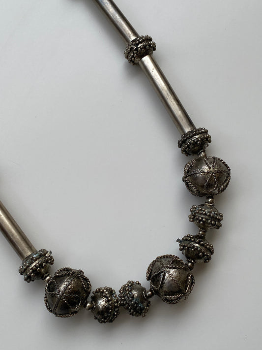 Vintage Tribal-Inspired Silver Tone Beaded Statement Necklace – Textured Metal & Bar Link Design