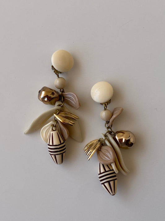 Vintage 1980s Ivory Cream Multi-Charm Cluster Clip-On Drop Earrings – Botanical Boho Statement