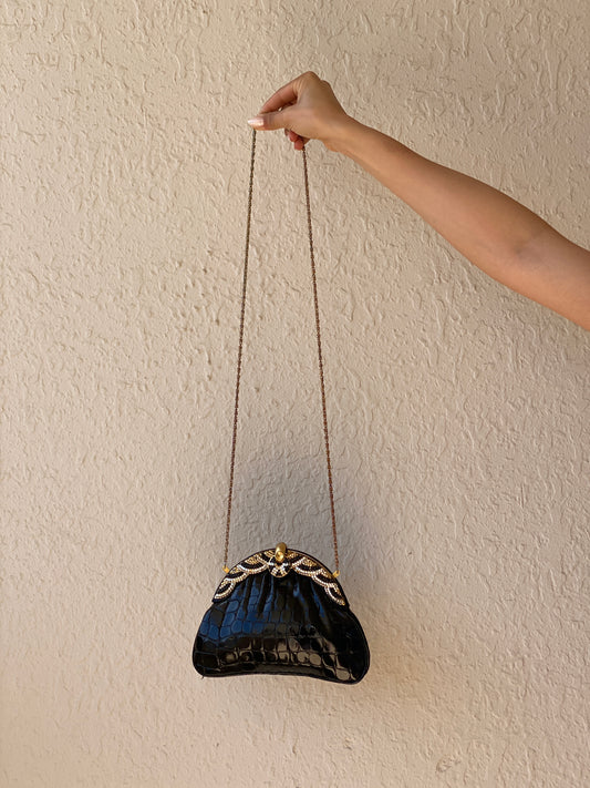 Vintage 1980s Black Croc Embossed Patent Rhinestone Bow Frame Gold Chain Evening Bag
