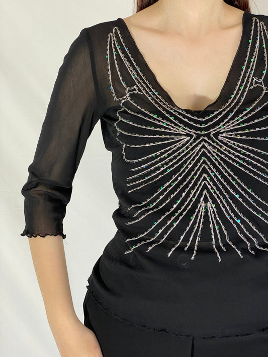 Vintage Y2K Jennifer Taylor Sheer Beaded Butterfly Mesh Top - L