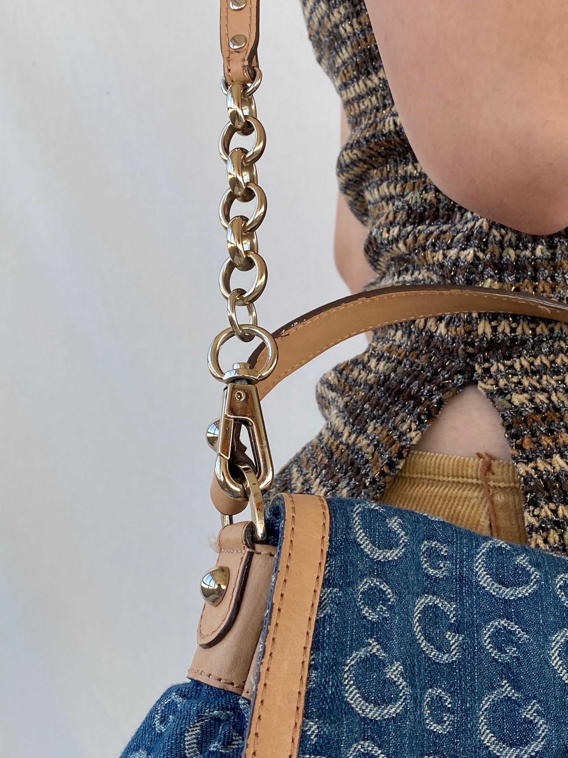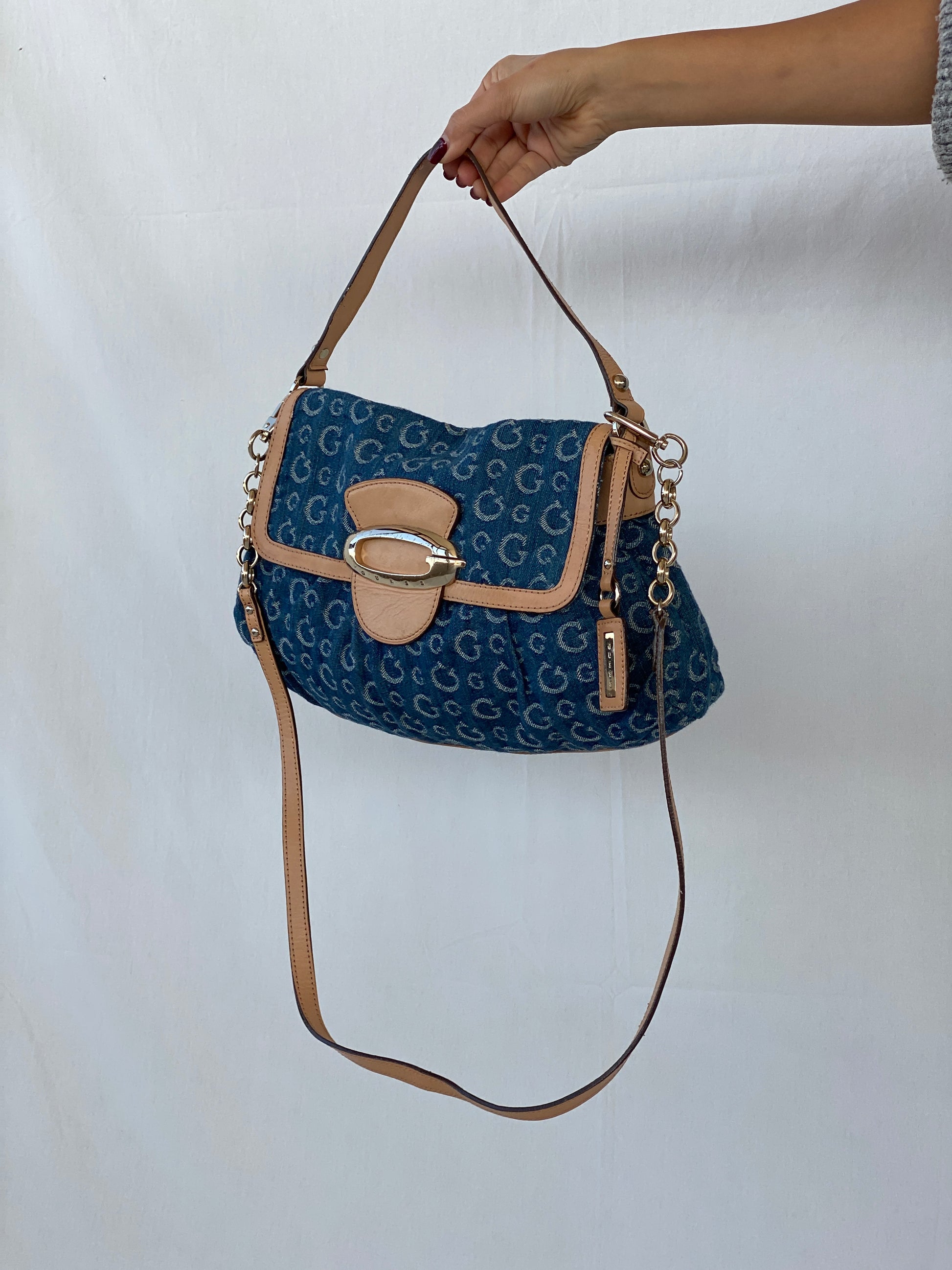 تتميز هذه الحقيبة بطباعة الأحرف الأولى من Guess G على الجينز، وأشرطة من الجلد البني وسلسلة ذهبية وحزام طويل قابل للإزالة حتى يمكن ارتداؤها إما كحقيبة كروس أو حقيبة كتف.