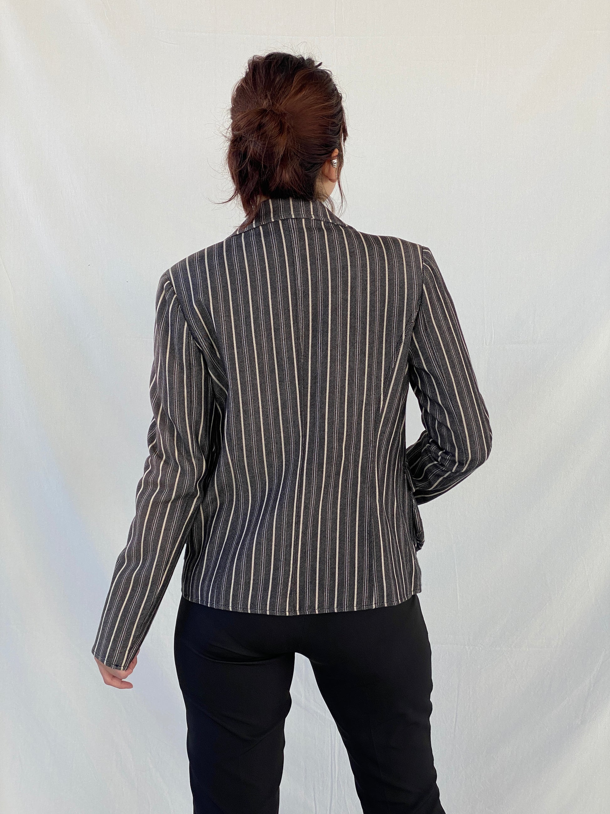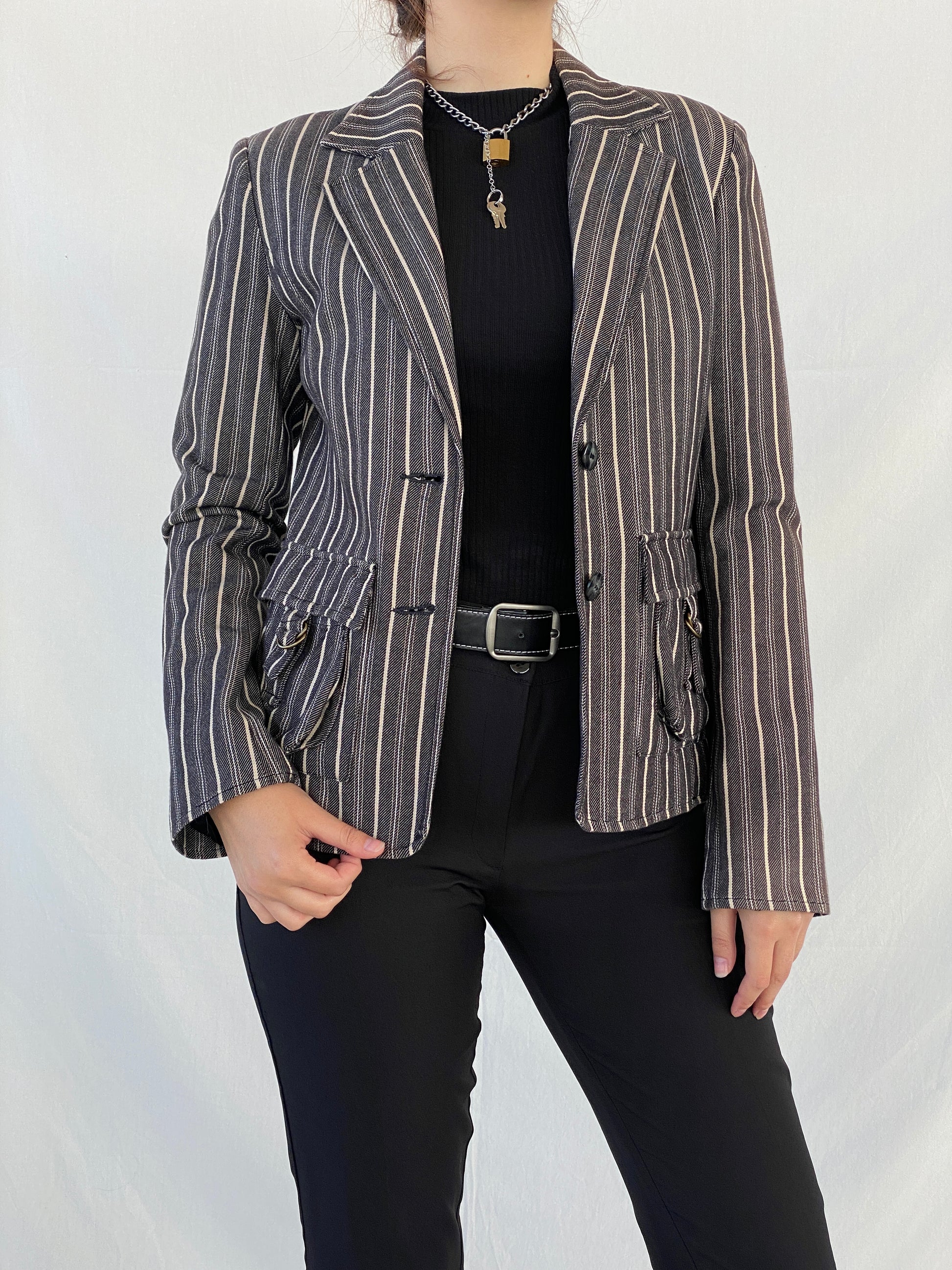 حسّني أناقتكِ الشتوية مع بليزر قطني نسائي مخطط باللونين الأبيض والأسود من مجموعة فيلا كلوز، طراز العقد الأول من القرن الحادي والعشرين. مصنوع من قماش عالي الجودة يشبه الدنيم، وهو إضافة مثالية لخزانة ملابسكِ الشتوية.