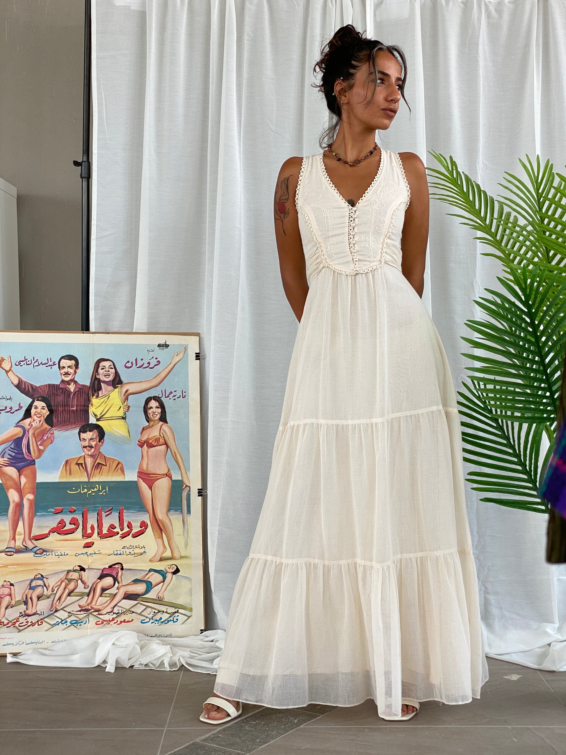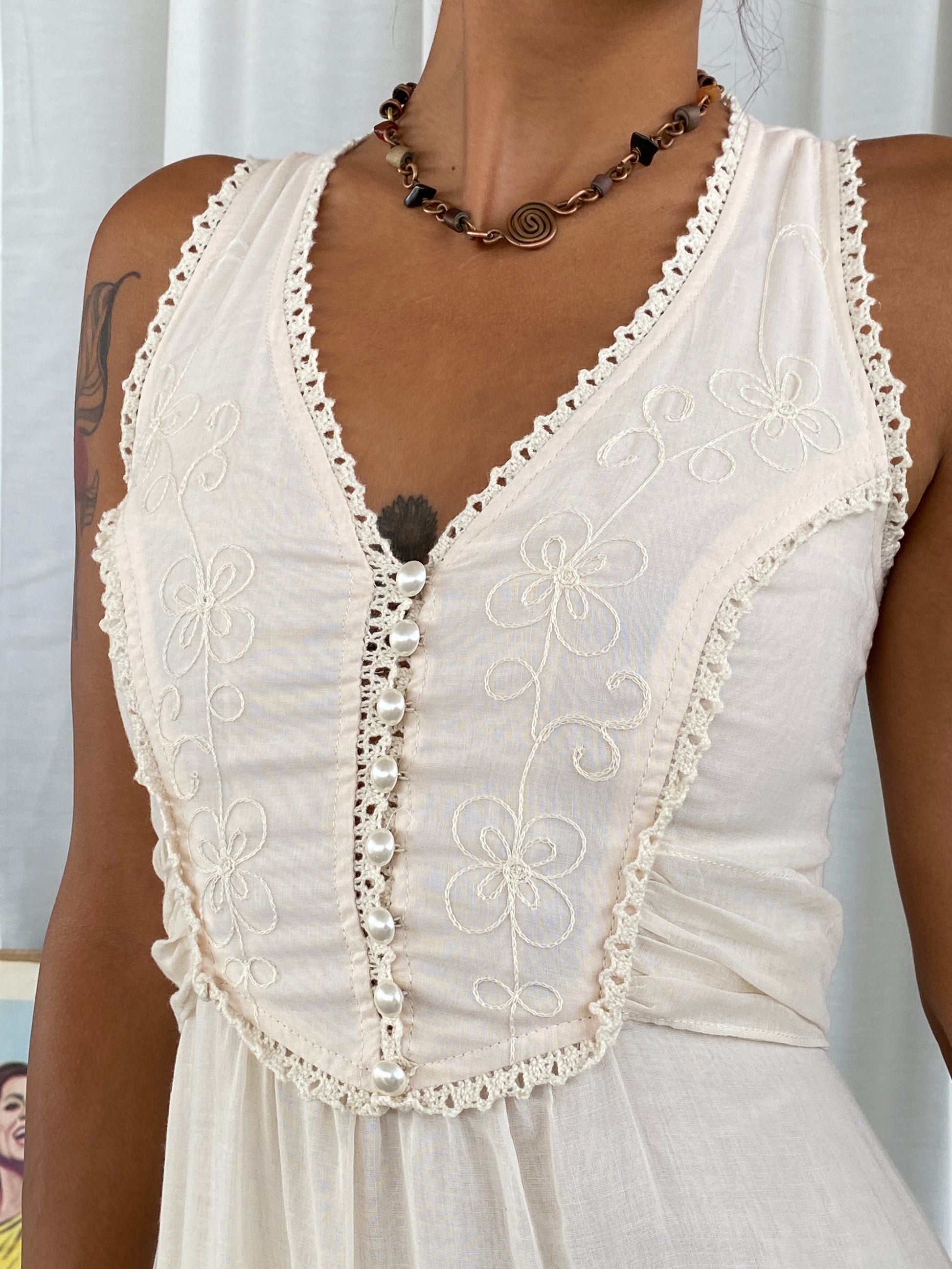 استمتعي بأجواء السبعينيات الحالمة مع فستاننا الطويل "كاليفورنيا بيج كوتيدج كور" من "فيز 2". مثالي لإطلالة ريفية رومانسية، يتميز هذا الفستان الطويل بجزء علوي جميل على شكل كورسيه مع تفاصيل كروشيه رقيقة وتطريز زهري، وأزرار لؤلؤية. نسقيه مع حذاء رعاة البقر لإطلالة ساحرة.
