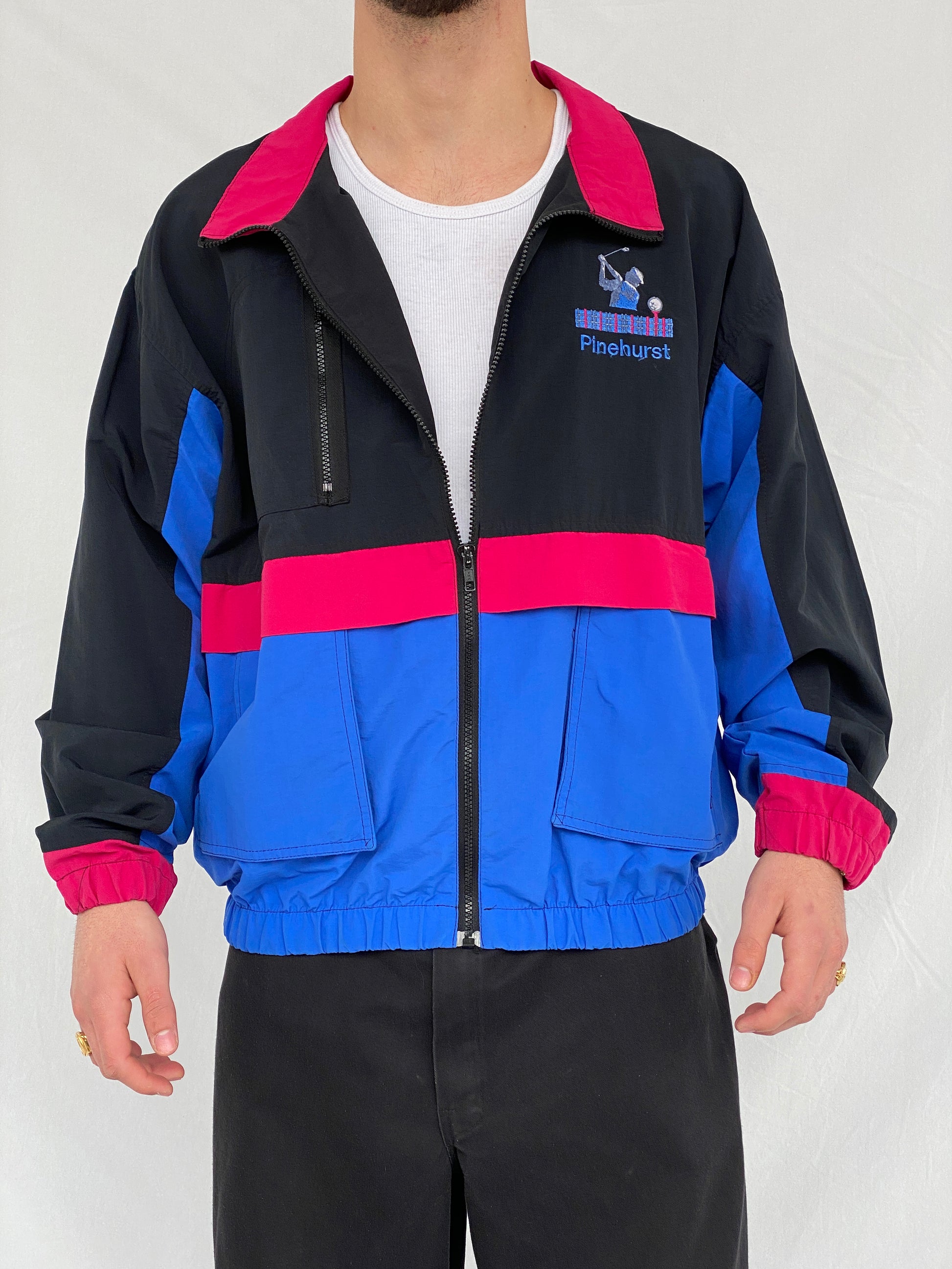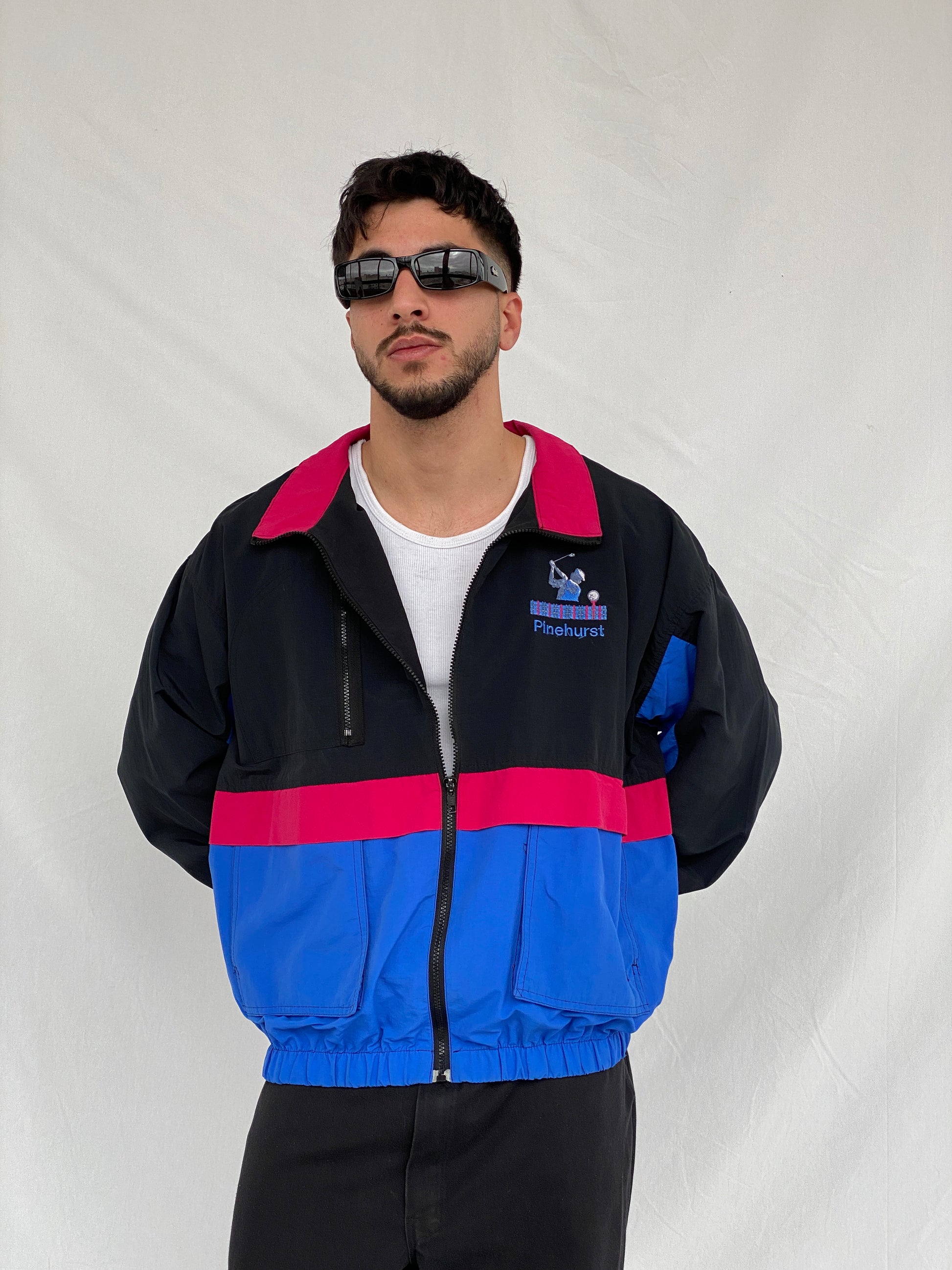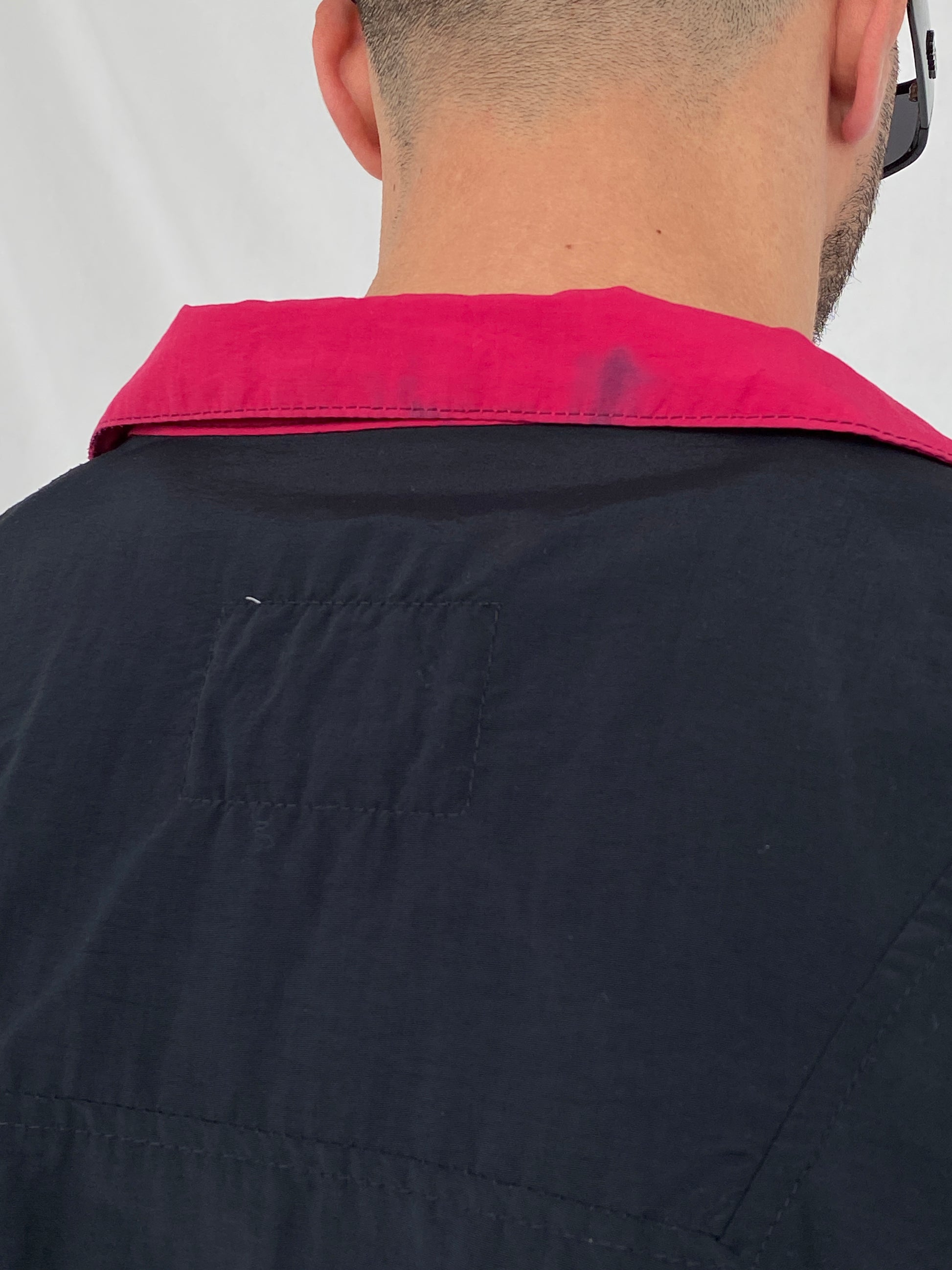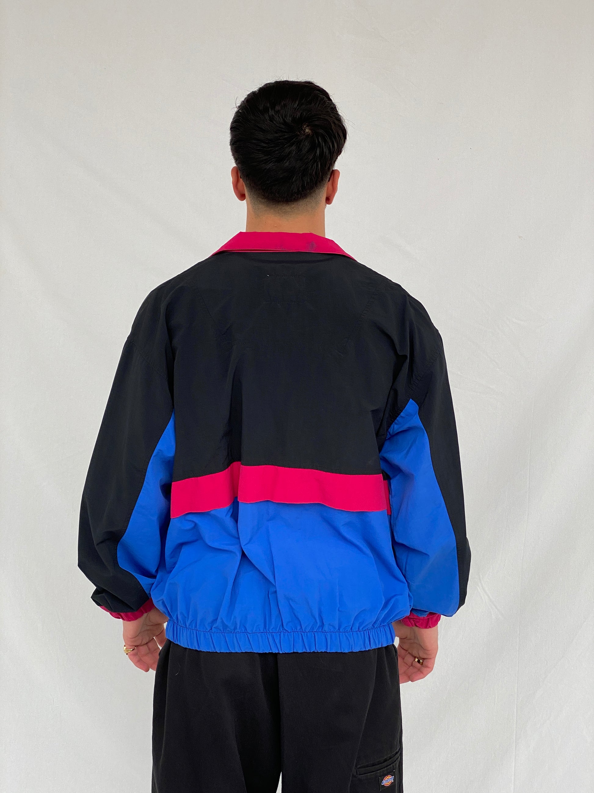 نقدم لكم جاكيت ستاربس الرياضي الأسود المقاوم للرياح، بتصميم كلاسيكي من الثمانينيات والتسعينيات. يتميز هذا الجاكيت بتفاصيل وردية وزرقاء على خامات الجاكيت/الجاكيت الرياضي. حافظوا على أناقتكم ودفئكم مع هذه القطعة الفريدة.