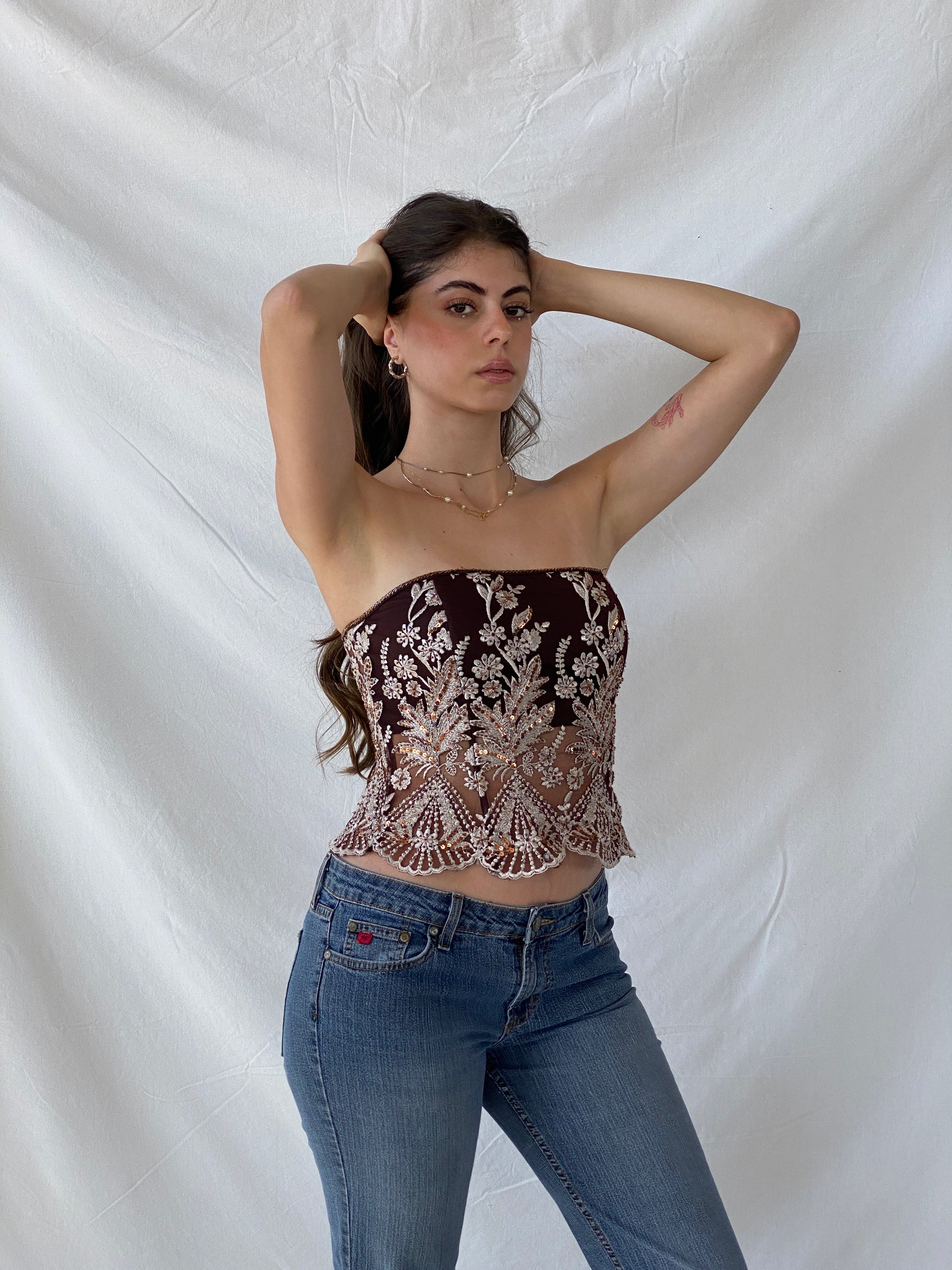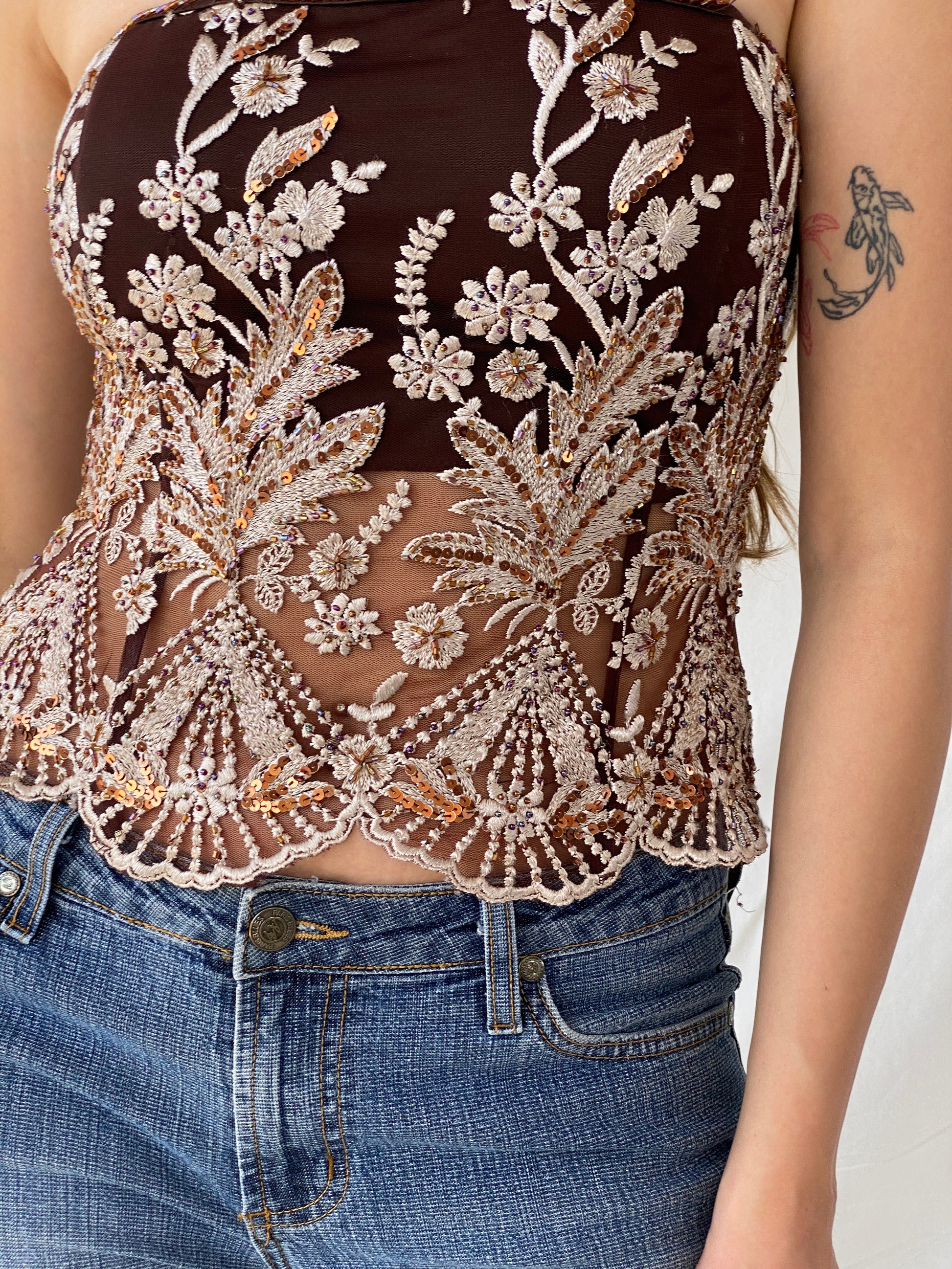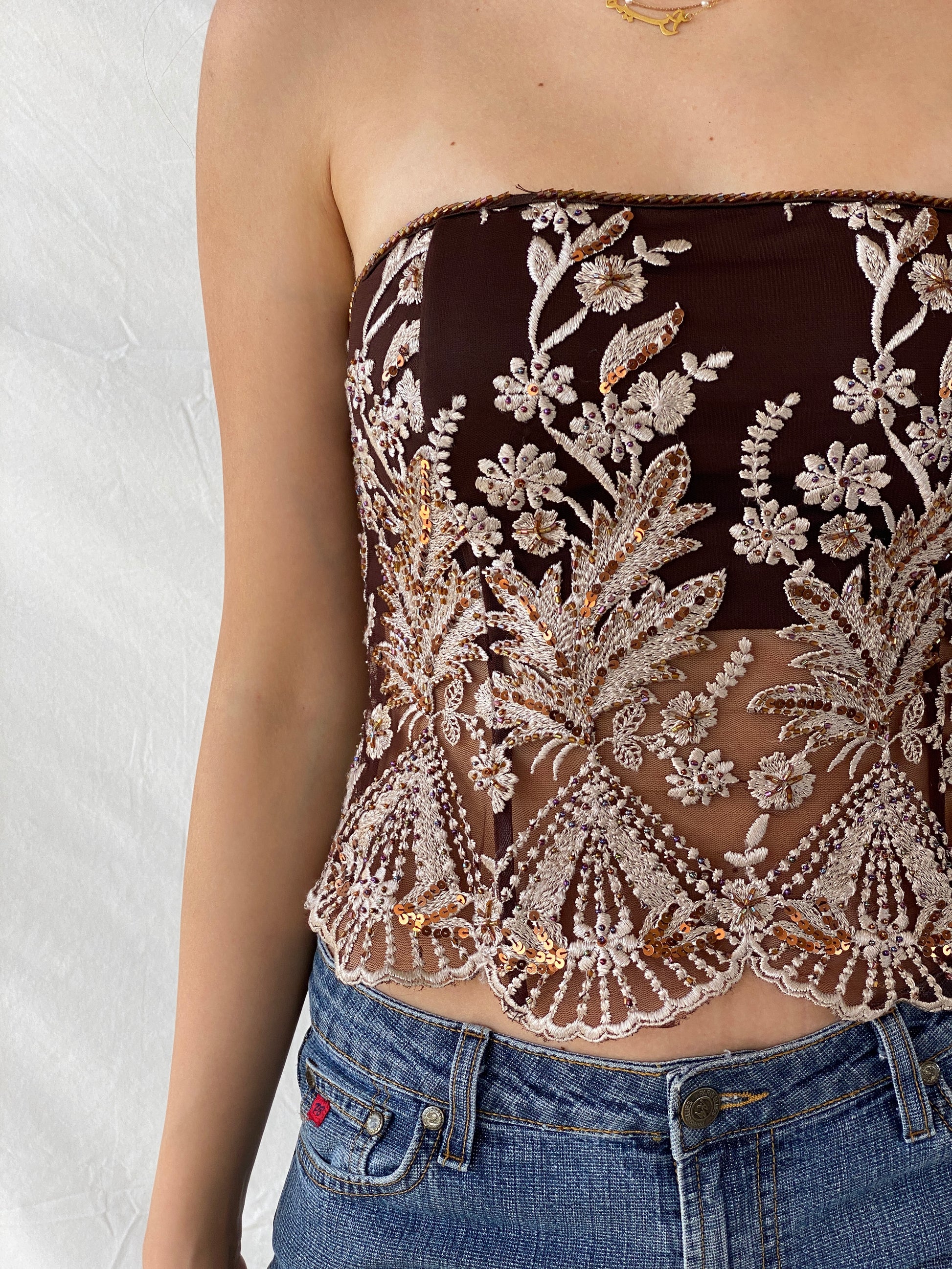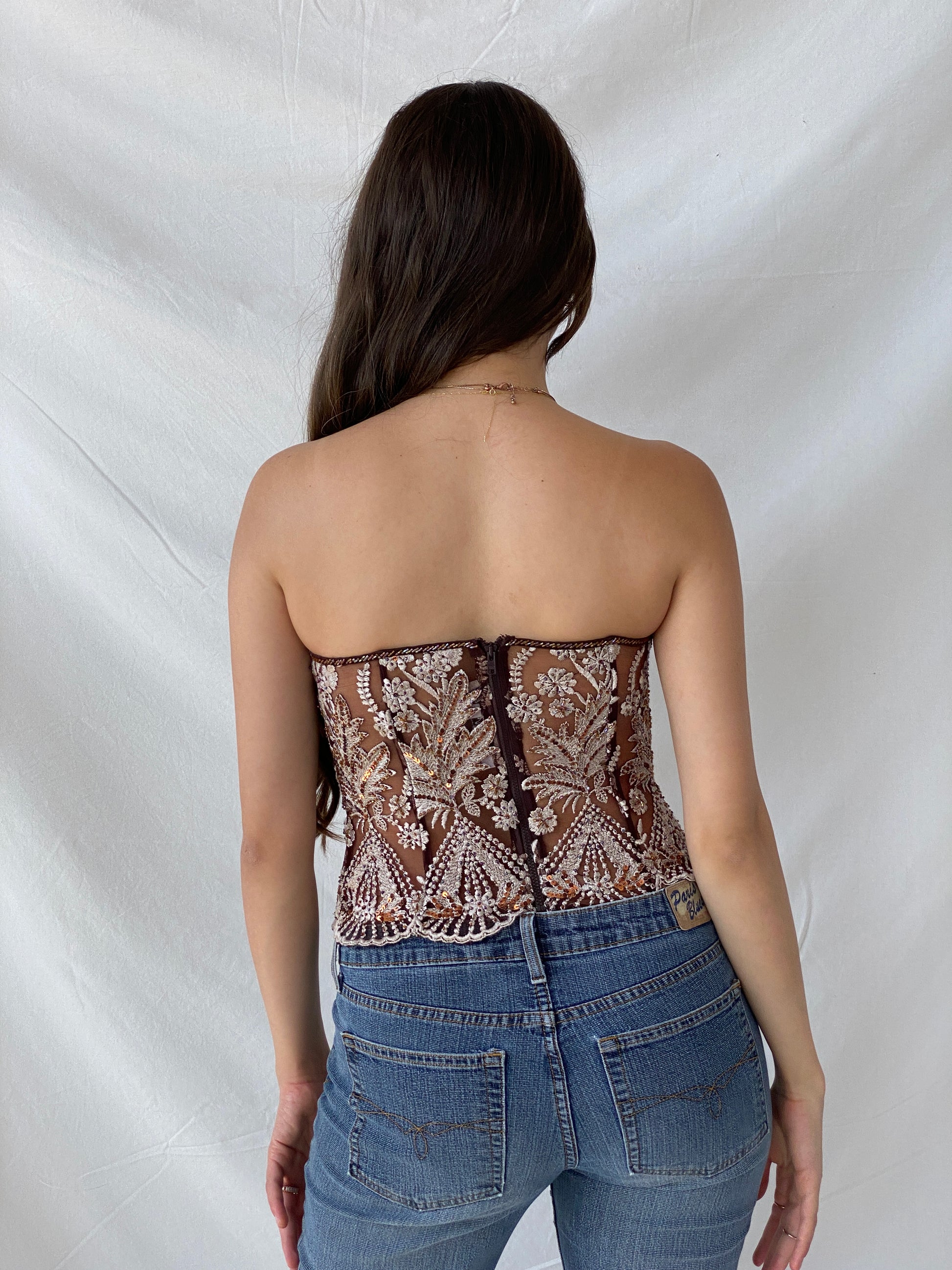 كورسيه حفلات من قماش شبكي مطرز بالترتر من التسعينيات - مقاس صغير