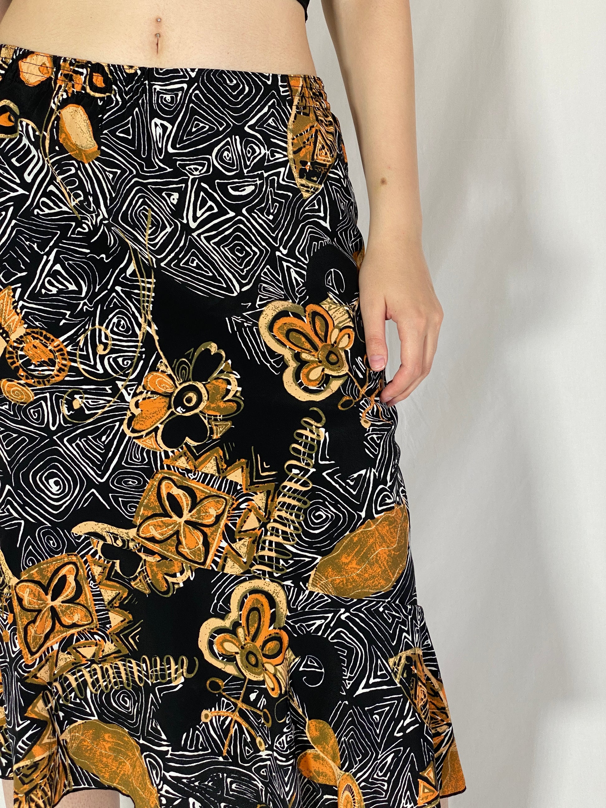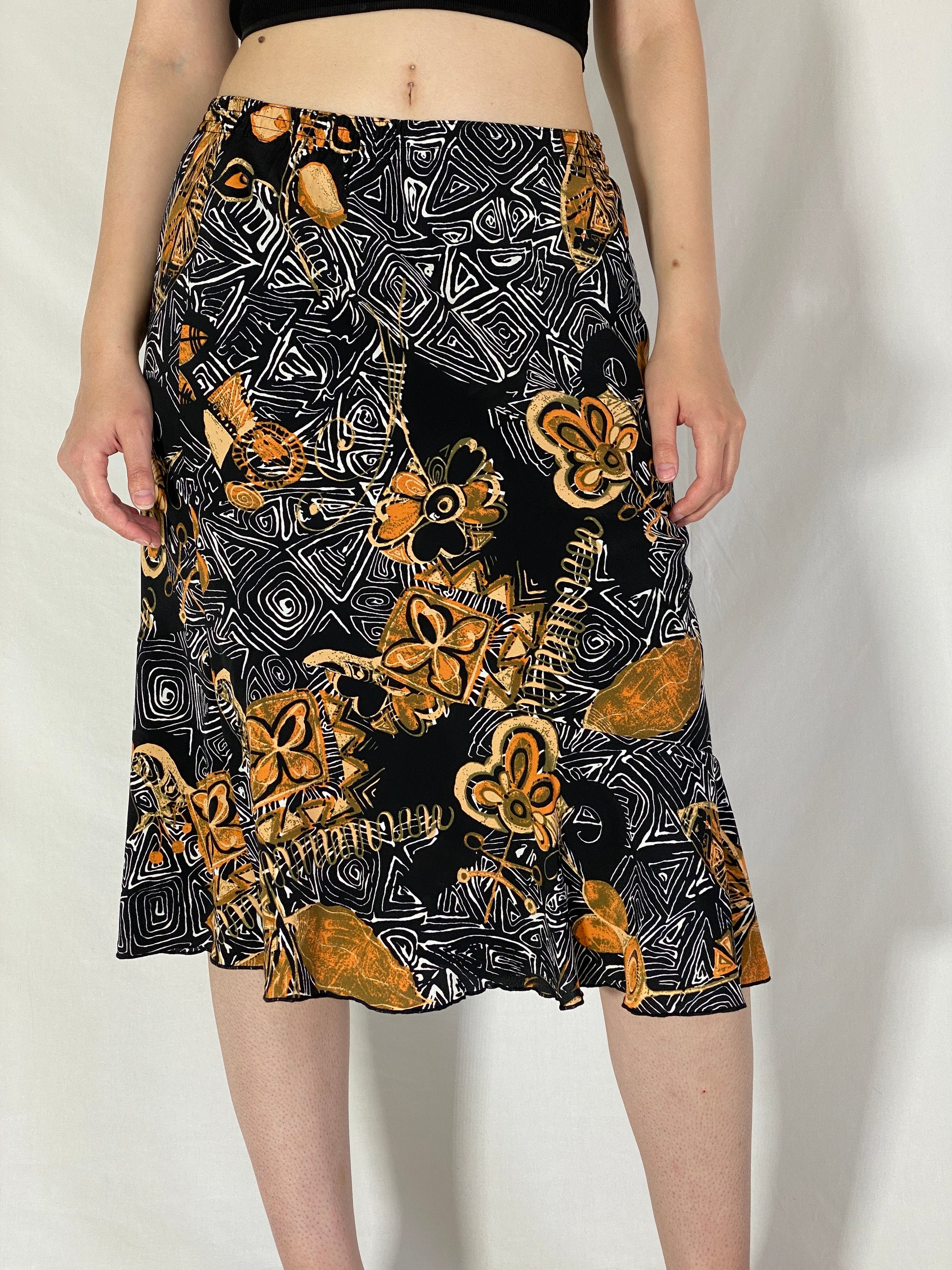 تنورة ميدي بطبعة زهور تجريدية باللونين الأسود والذهبي من التسعينيات - مقاس متوسط