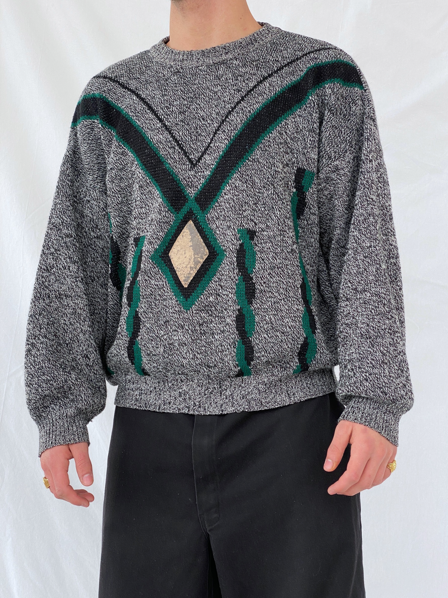 سترة رجالية محبوكة برقبة دائرية من مزيج الصوف الإيطالي من التسعينيات باللون الرمادي والأخضر - مقاس متوسط