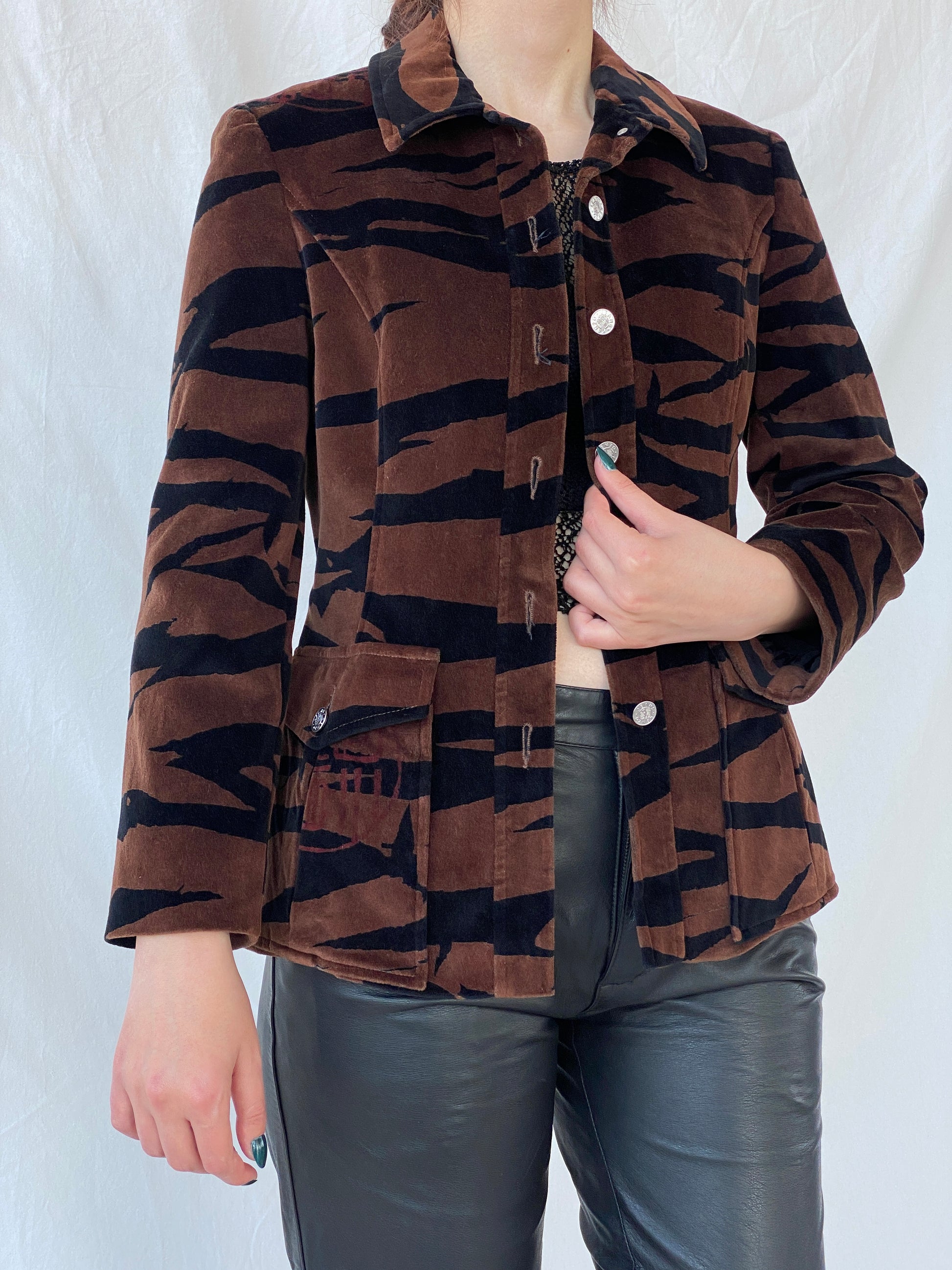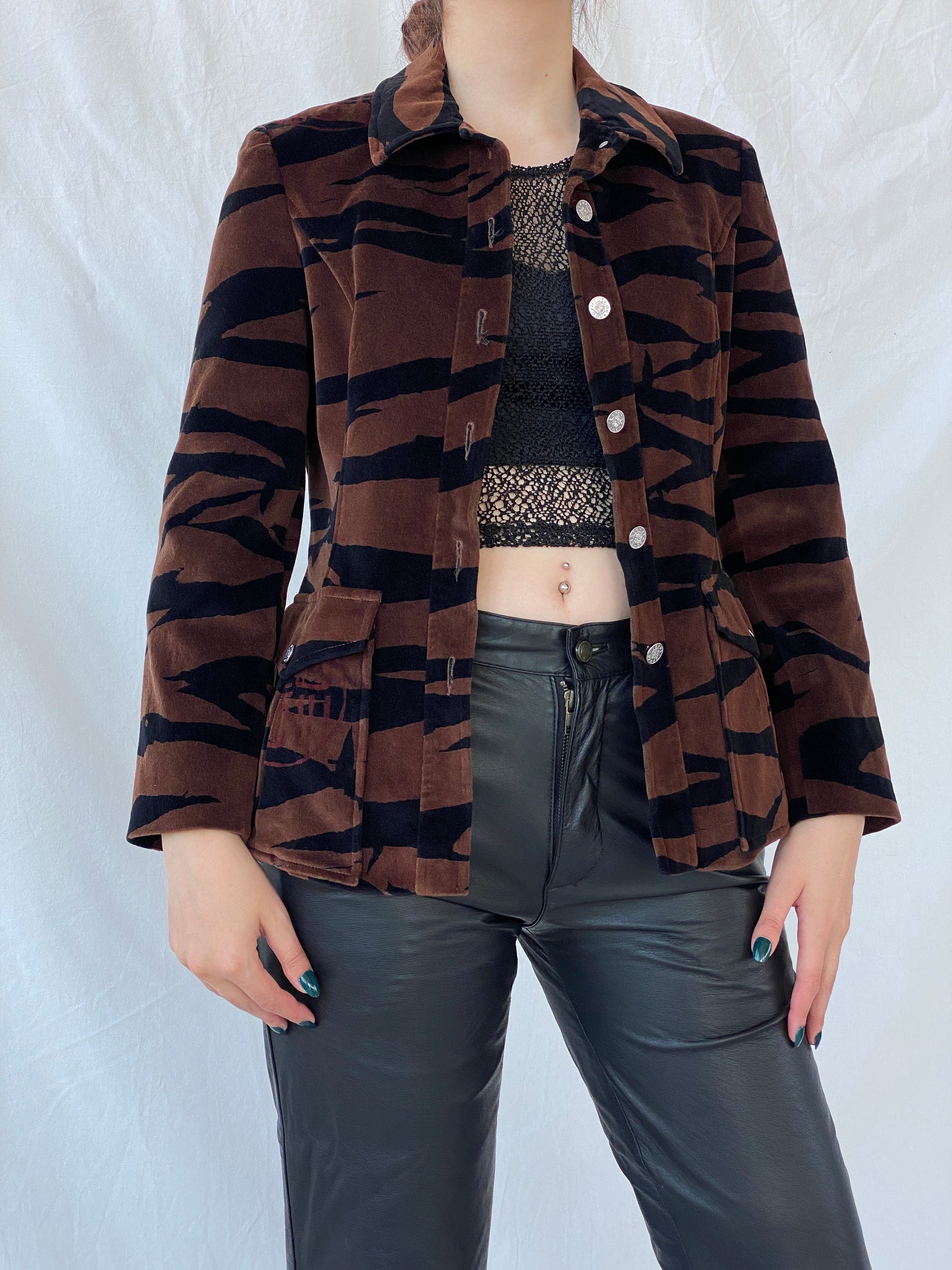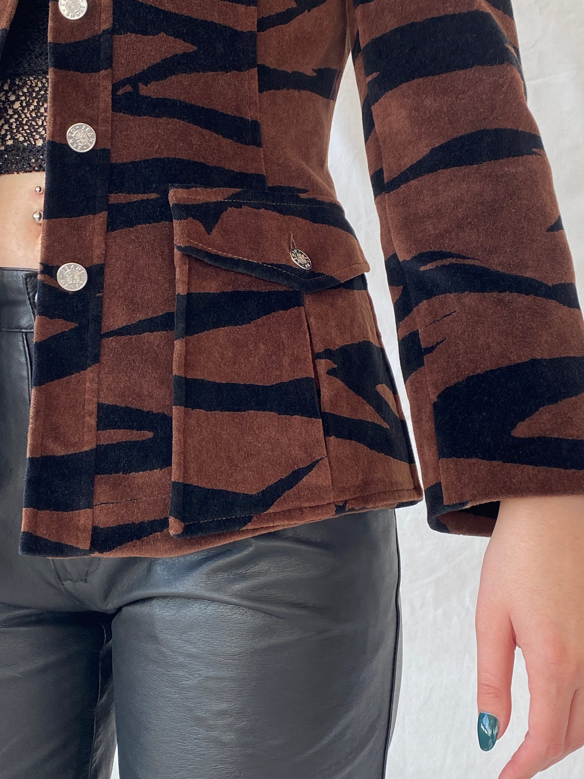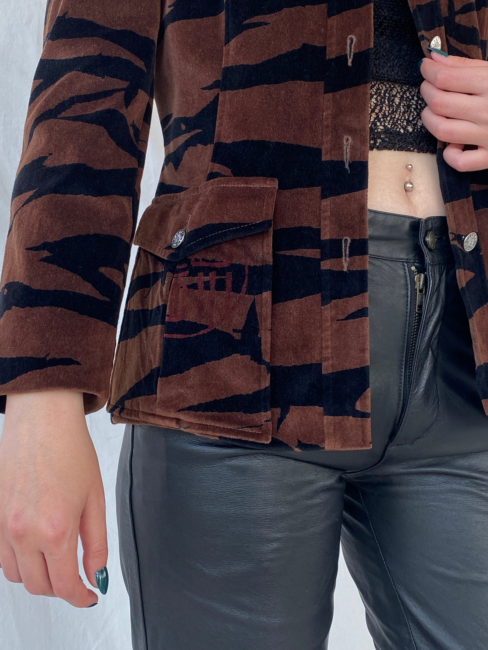 بليزر ثقيل من المخمل بطبعة نمر بني وأسود من كينزو جينز، بتصميم عتيق رائع من التسعينيات - مقاس متوسط