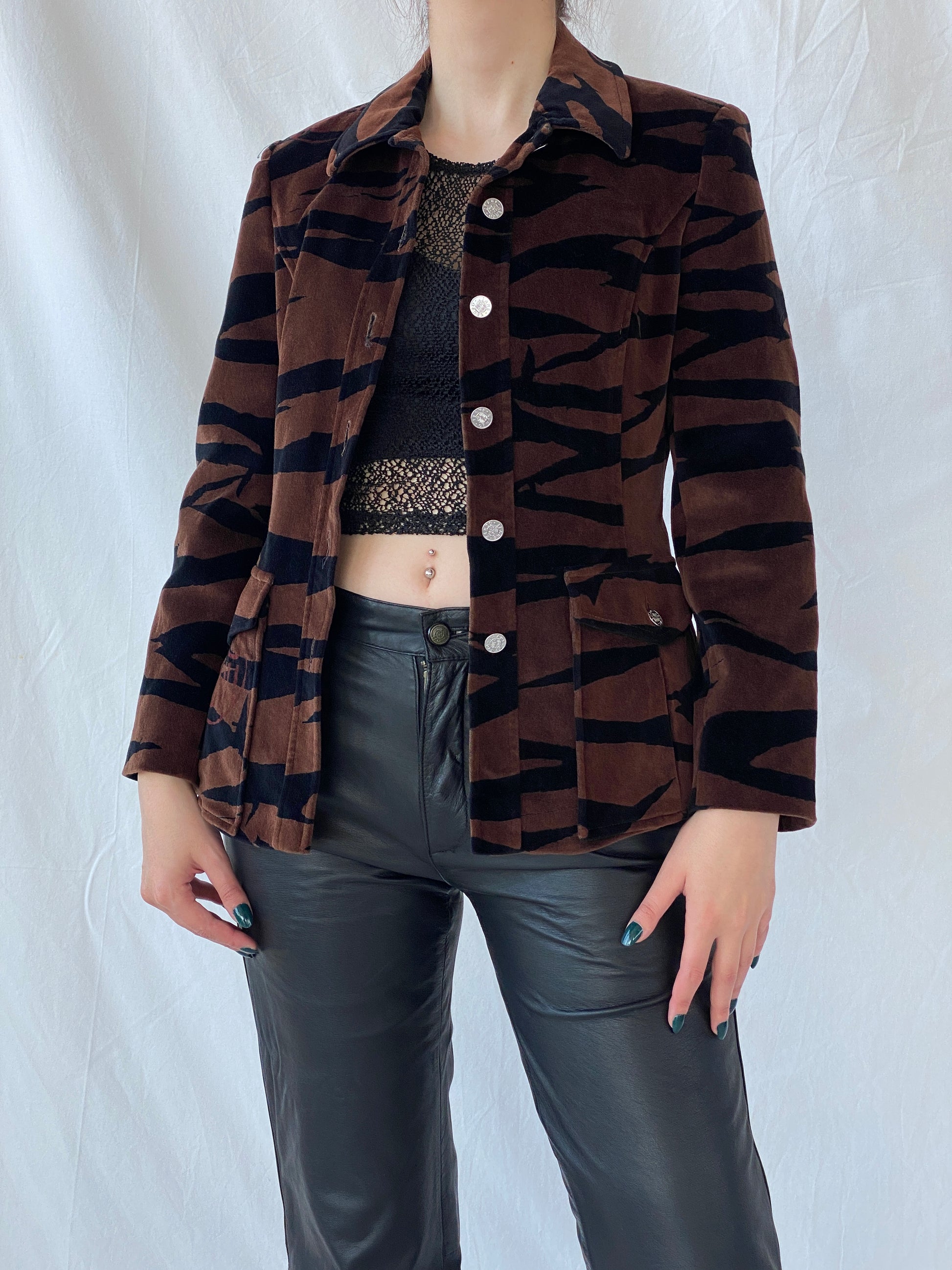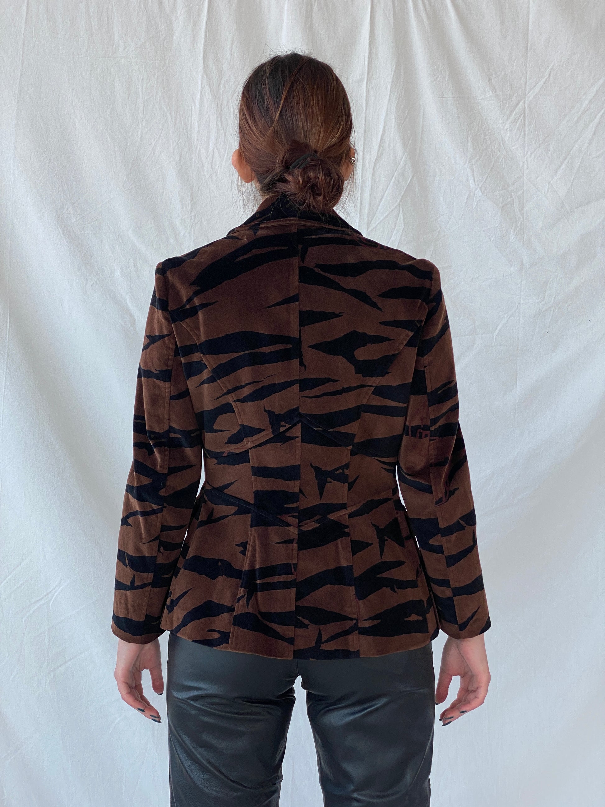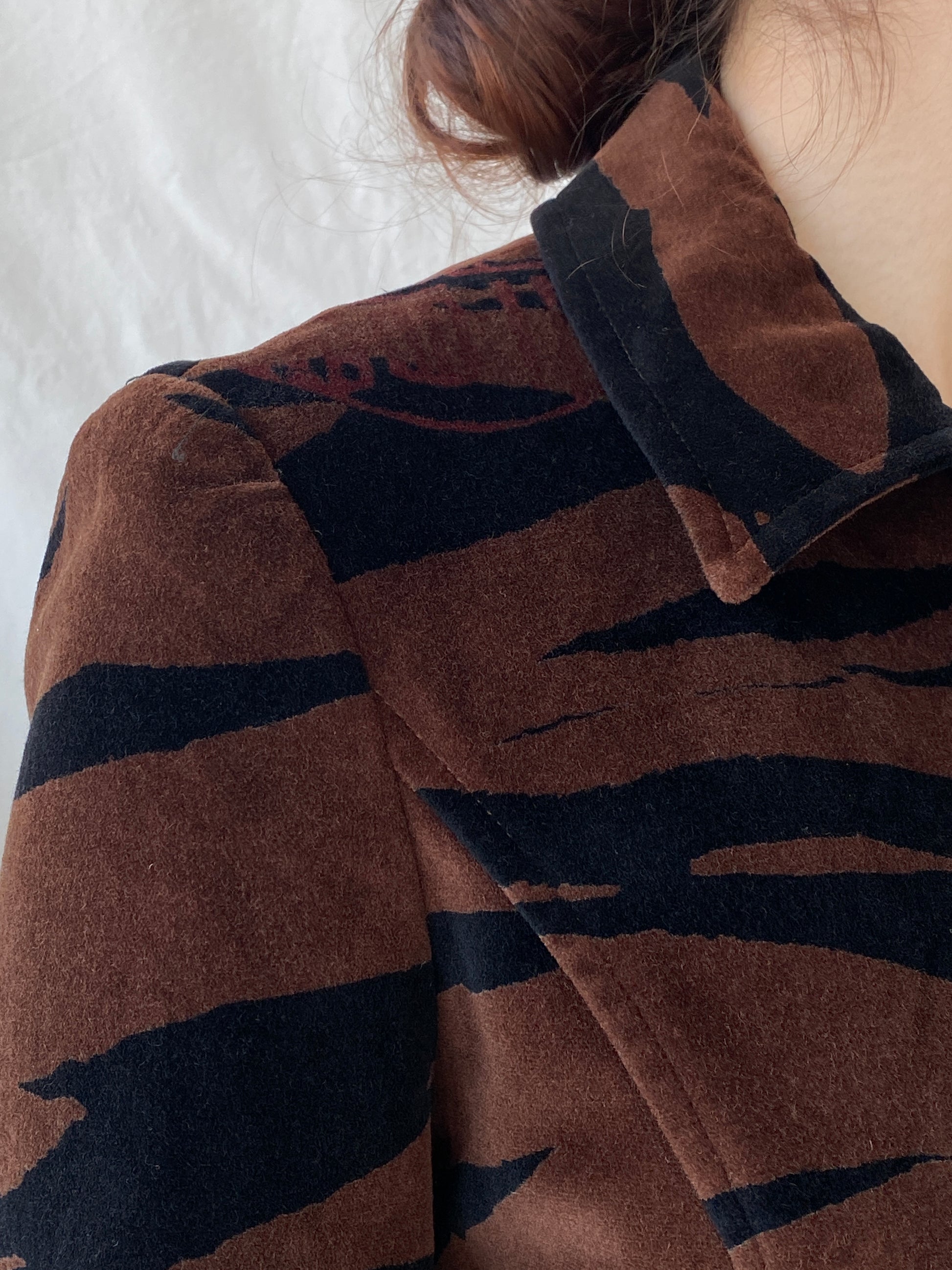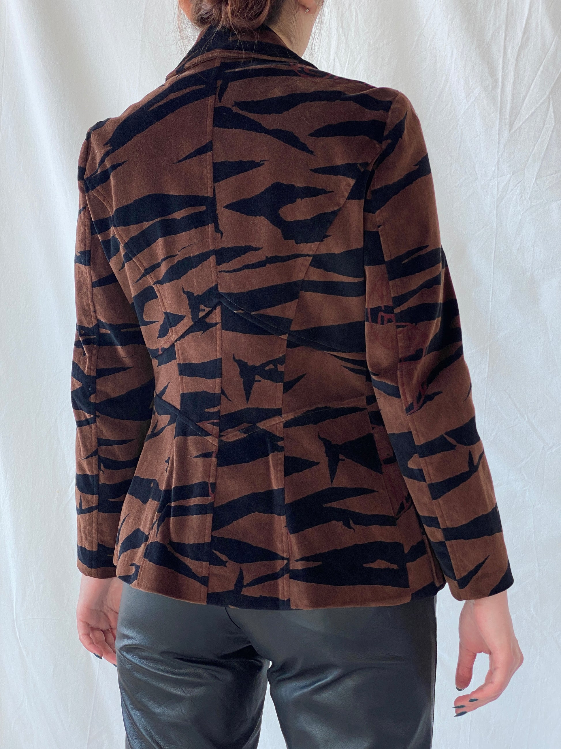 بليزر ثقيل من المخمل بطبعة نمر بني وأسود من كينزو جينز، بتصميم عتيق رائع من التسعينيات - مقاس متوسط