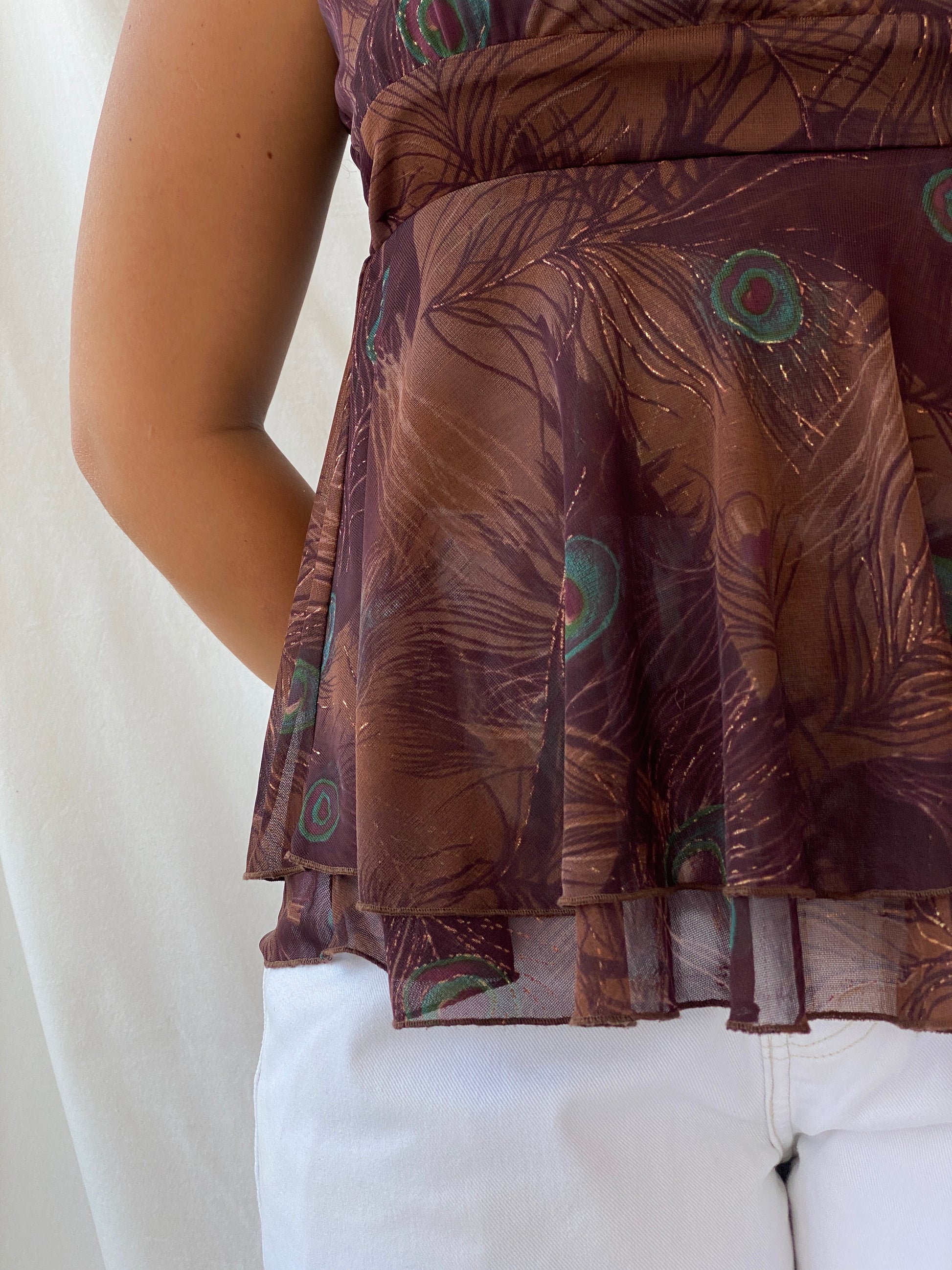 قميص داخلي شفاف متعدد الطبقات بني بطبعة طاووس من التسعينيات من ميشيل - مقاس كبير