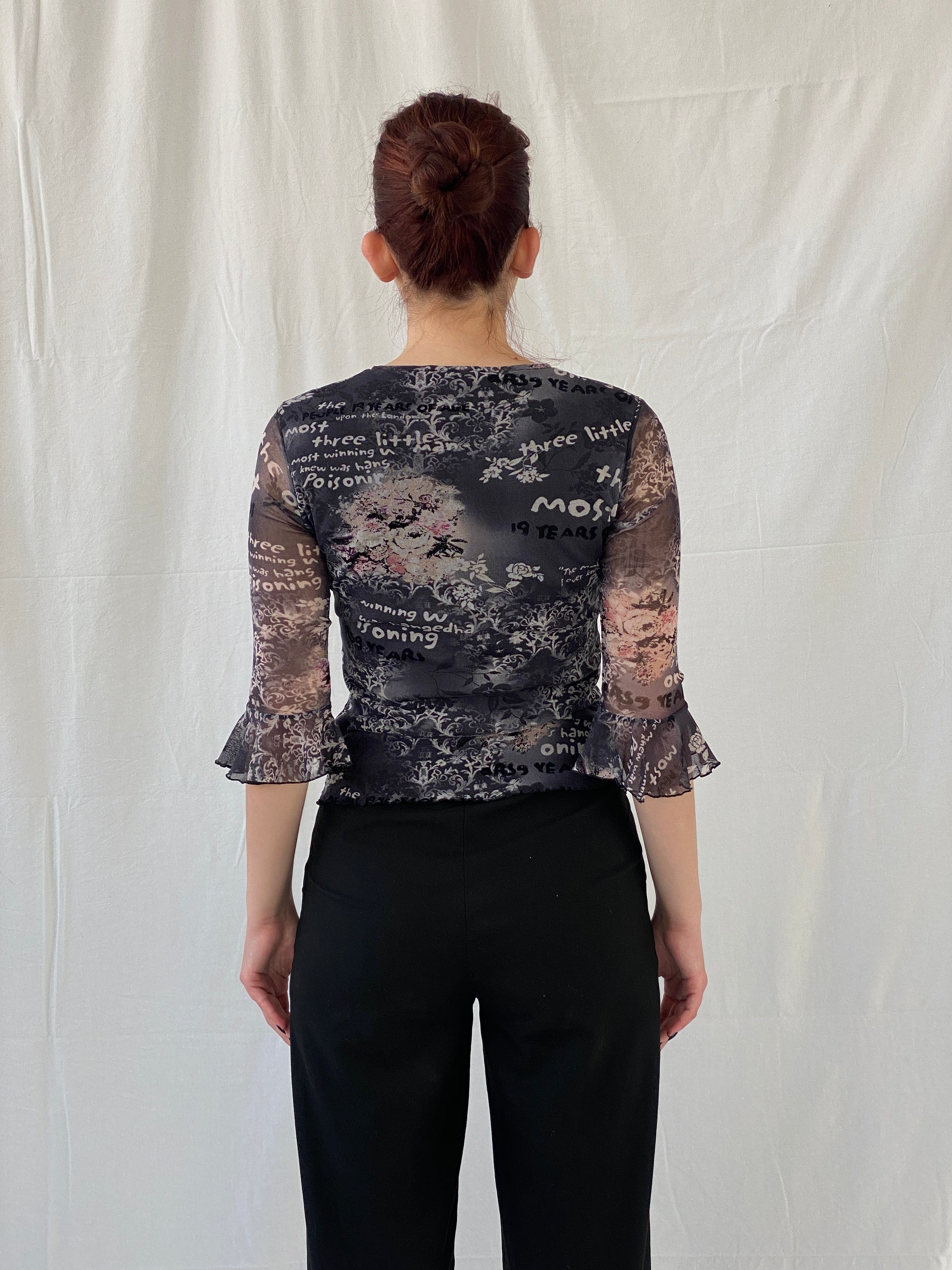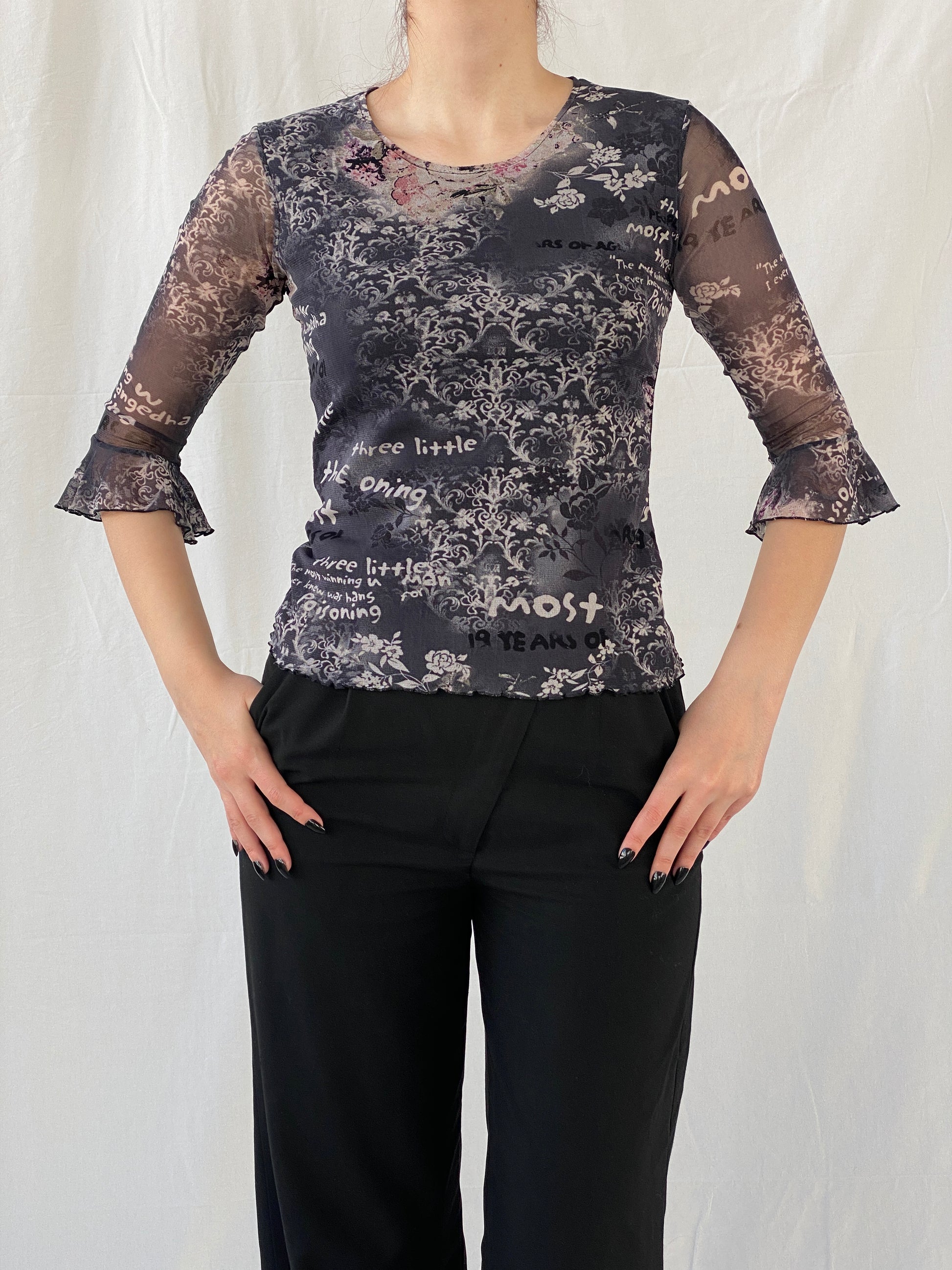 بلوزة شبكية سوداء بسيطة وعصرية من التسعينيات بأكمام 3/4 - مقاس صغير