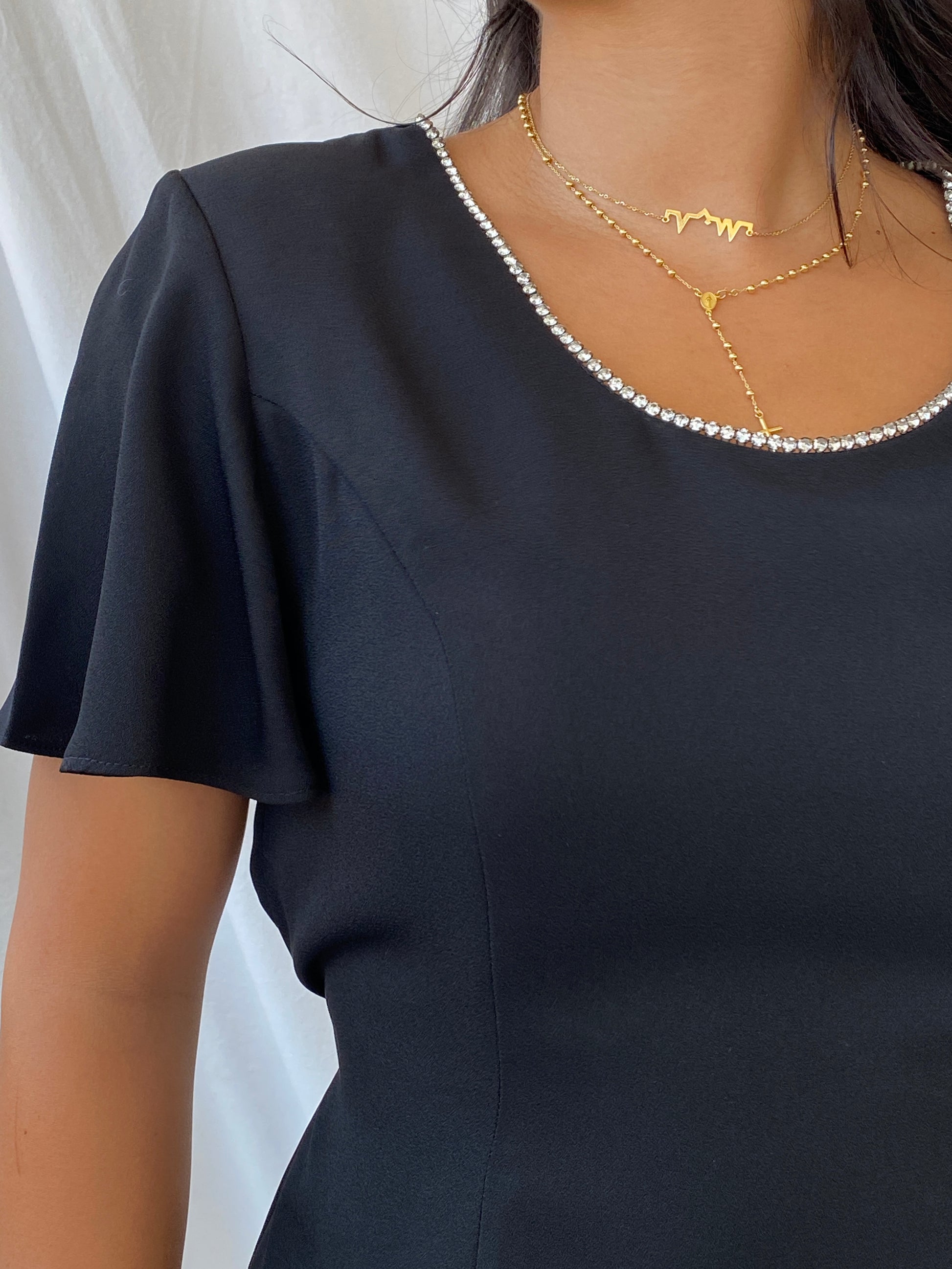 تألقي بأناقة خالدة مع هذا الفستان الأسود القصير من مجموعة راندي ماي التسعينيات. يتميز بأكمام قصيرة وواسعة وفتحة رقبة دائرية مزينة بأحجار الراين البيضاء، وهو الخيار الأمثل لموعد غرامي أو حفل زفاف. تضفي تنورة الأميرة ذات الصفين من القماش وأربطة الخياطة الجانبية لمسة من الأناقة والرقي على إطلالتكِ.