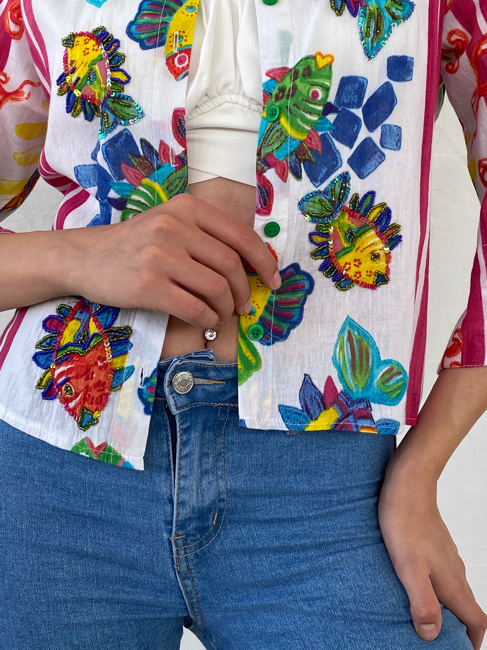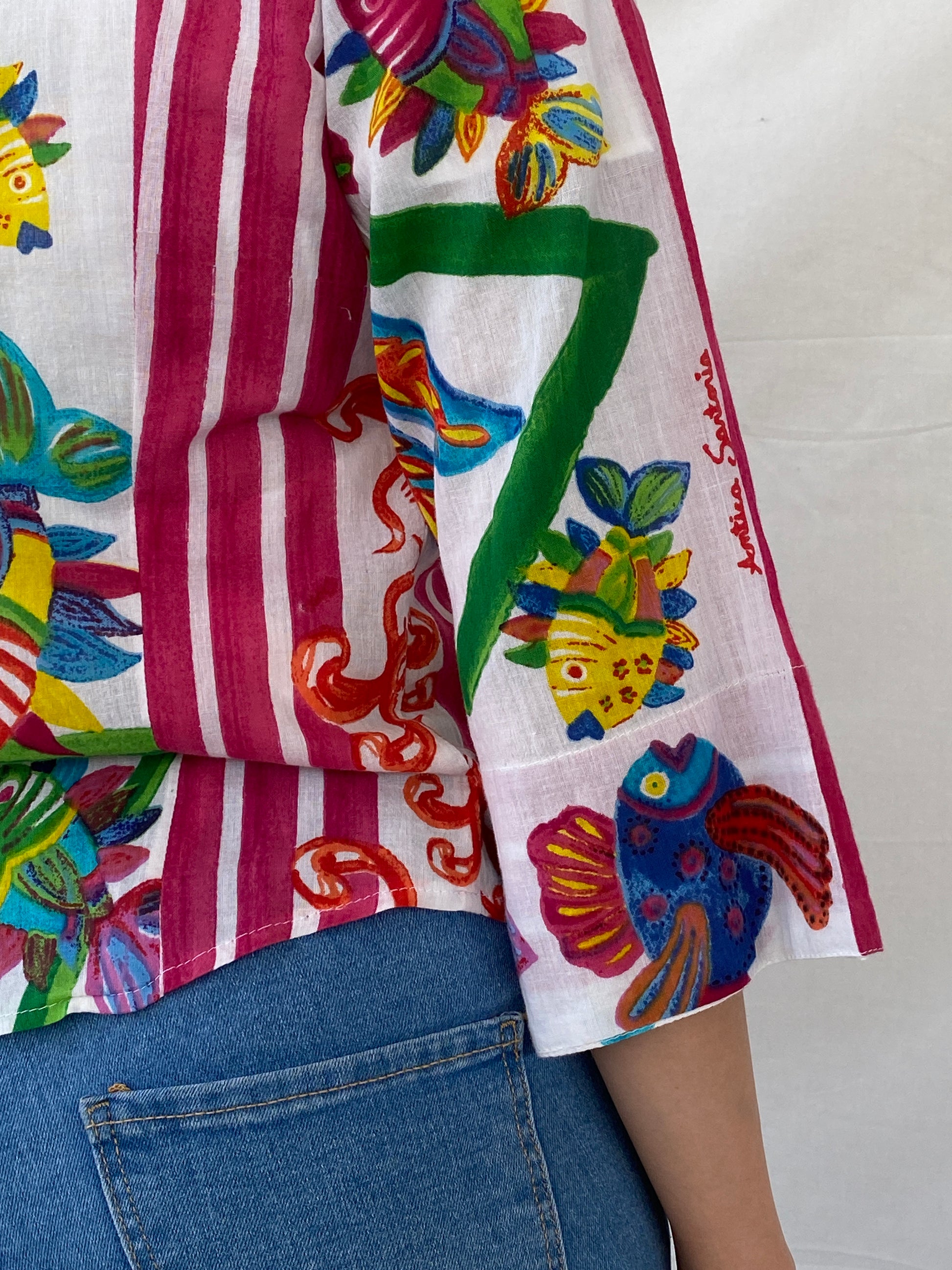 قميص خفيف بأكمام ثلاثة أرباع من تصميم أنتيكا سارتوريا من جياكومو سينك بطبعة سمكة مطرزة بالخرز - مقاس صغير