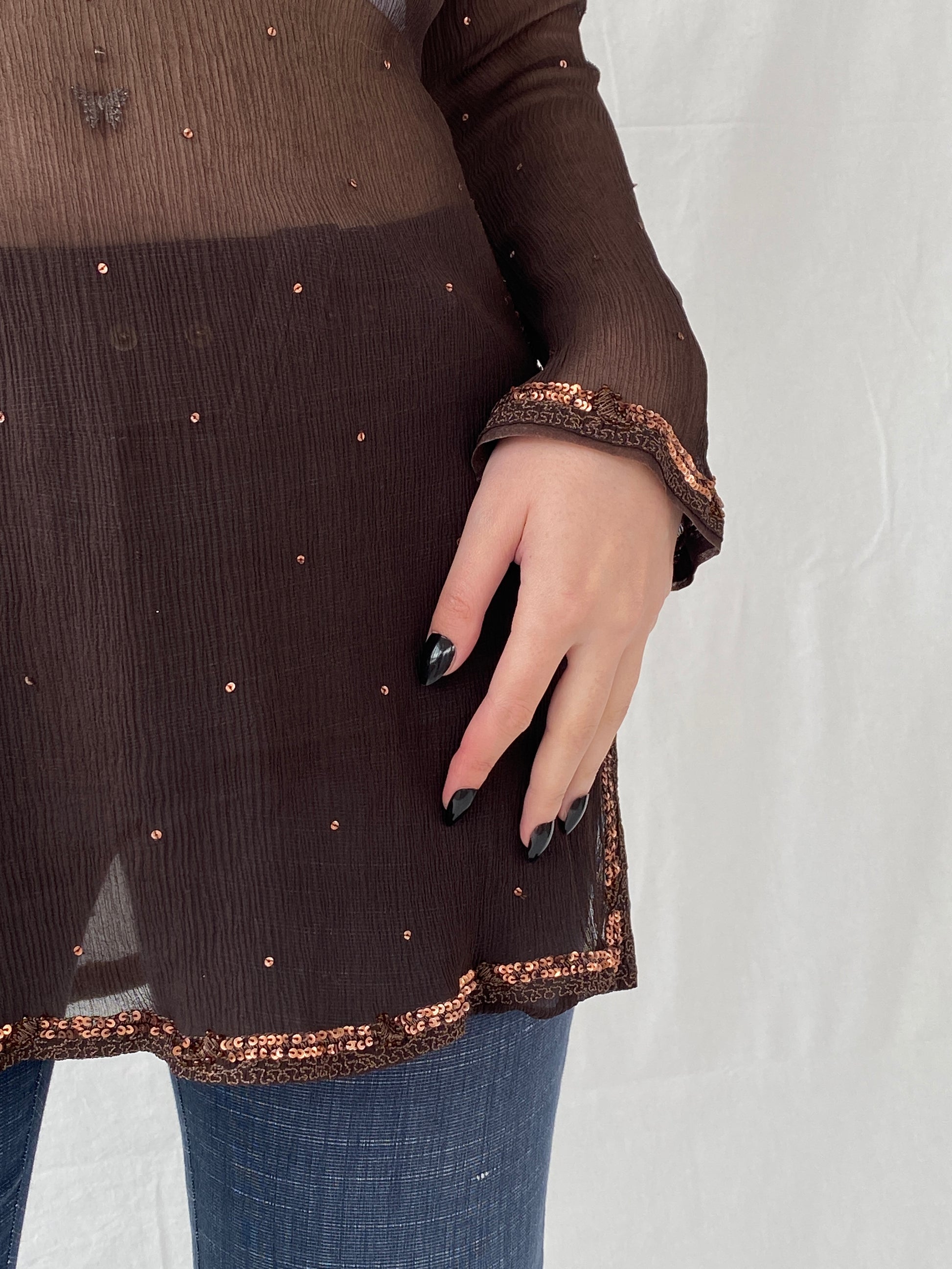 بلوزة تونيك بنية اللون من الحرير الشفاف والترتر من مجموعة أوتوجراف باي ماركس آند سبنسر الفاخرة الرقيقة - مقاس كبير