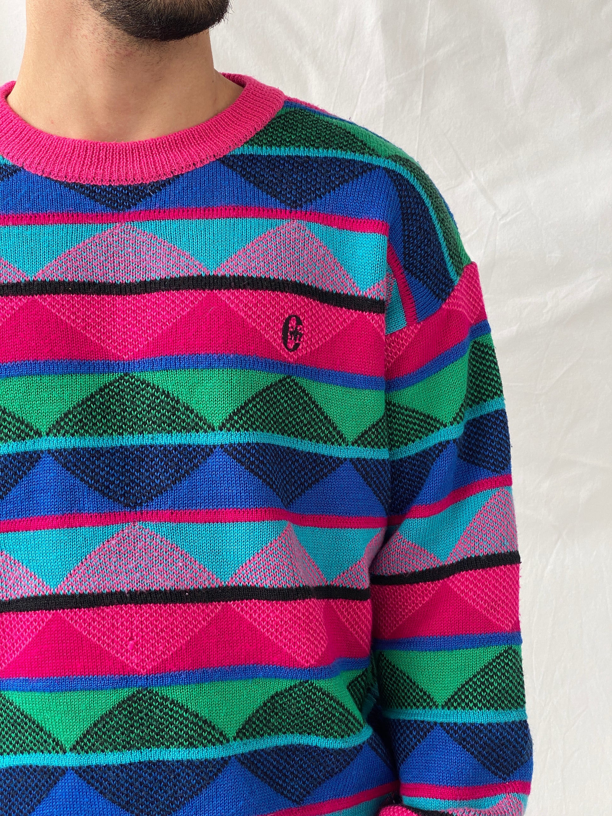 استمتعي بأسلوب التسعينيات النابض بالحياة والرجعي مع سترة كونتي أوف فلورنسا الكلاسيكية! صُنعت هذه السترة الكبيرة جدًا في إيطاليا من مزيج صوف مريح، وتتميز بنقش جريء وملون سيُبرز أناقتكِ. أضيفي لمسة من الحنين والدفء إلى خزانة ملابسكِ اليوم!