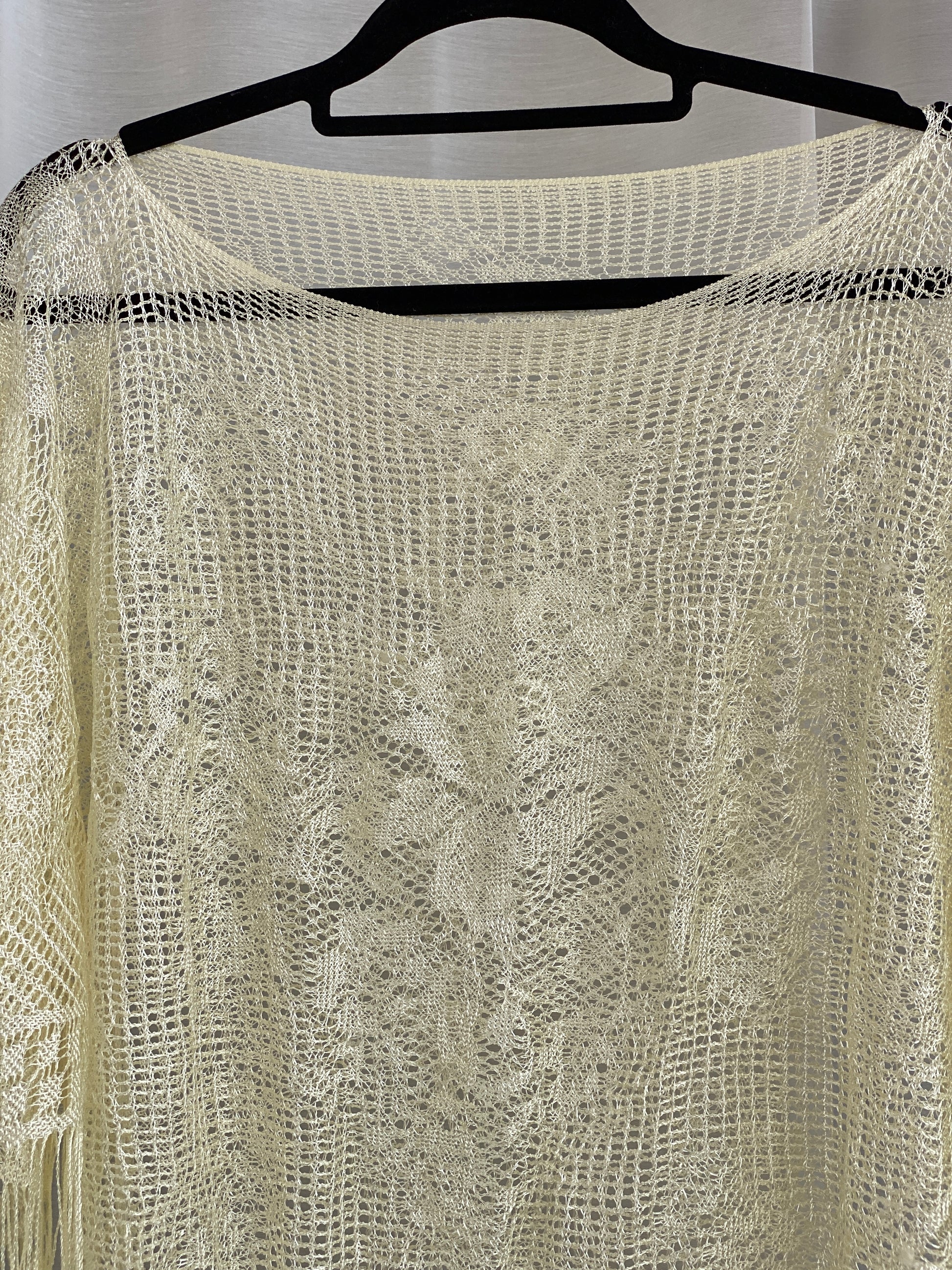 شال كروشيه كريمي بشراشيب – وشاح مفتوح محبوك على طراز البونشو البوهيمي