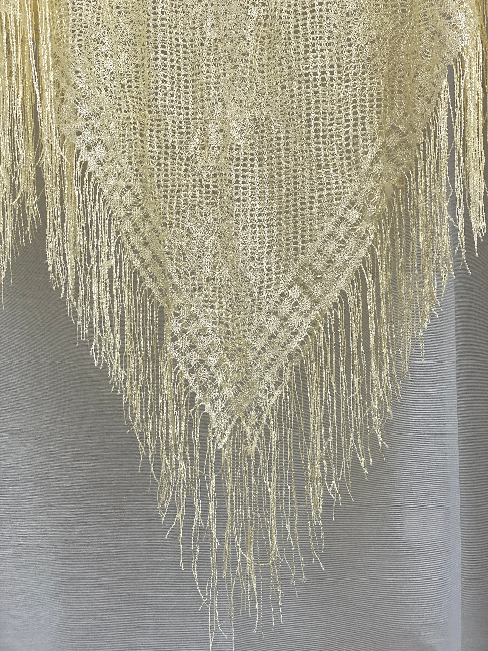 - التصميم: كروشيه مفتوح مع أنماط زهرية، شكل مثلث، حواف هامشية طويلة