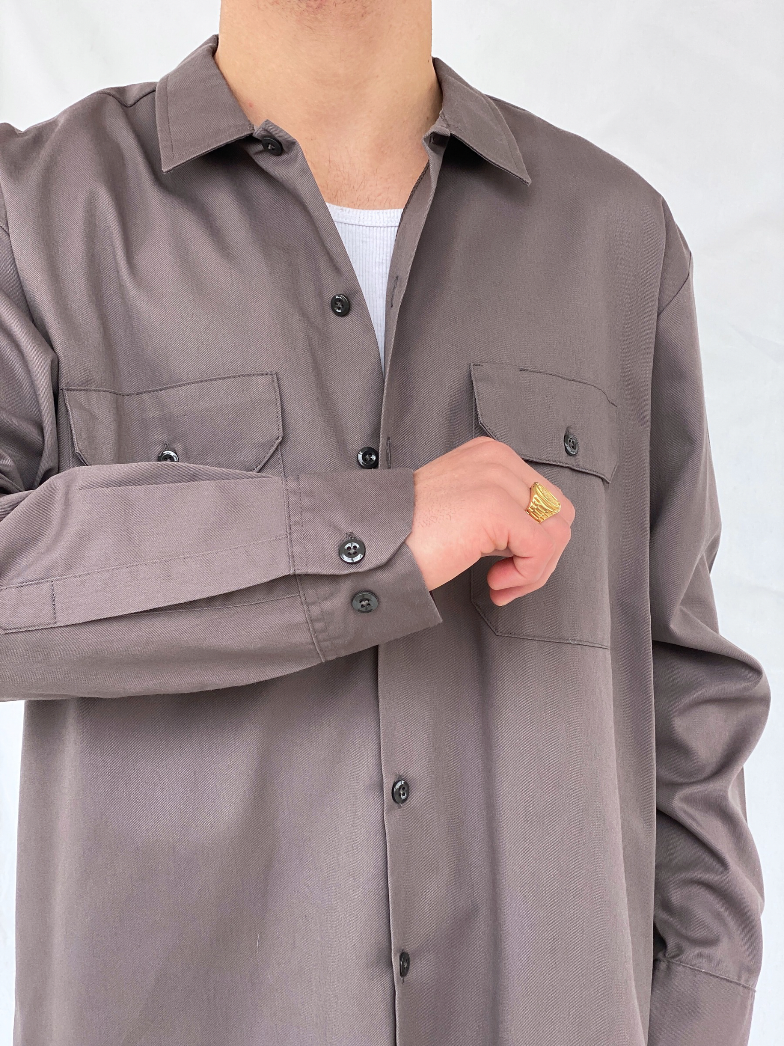 حافظ على راحتك وأناقتك في العمل مع قميص ديكيز الرمادي الرجالي بأكمام طويلة وأزرار. يتناسب هذا القميص تمامًا مع بنطال ديكيز الأسود الفضفاض لإطلالة عملية وعصرية. متوفر بمقاس XL.
