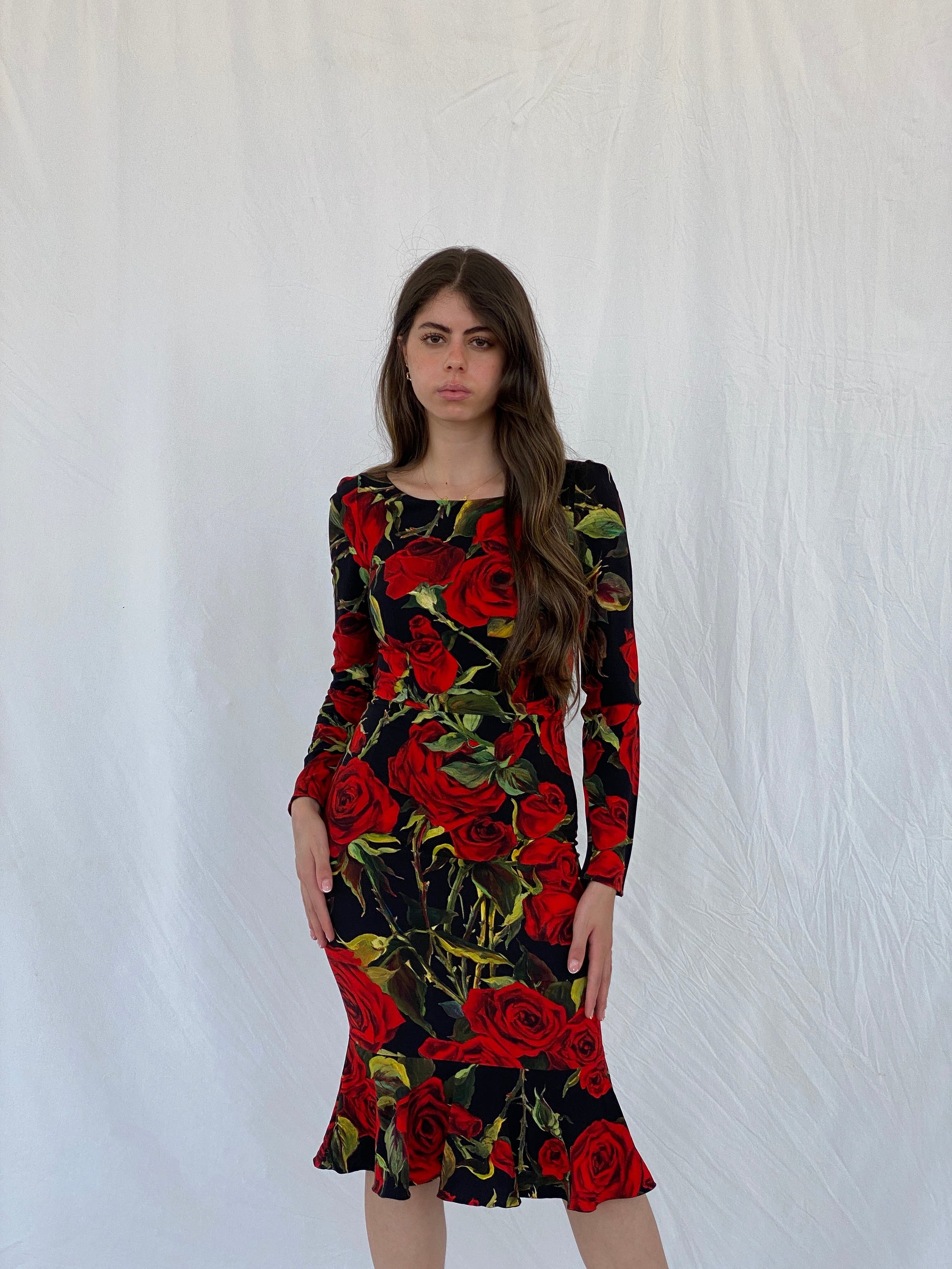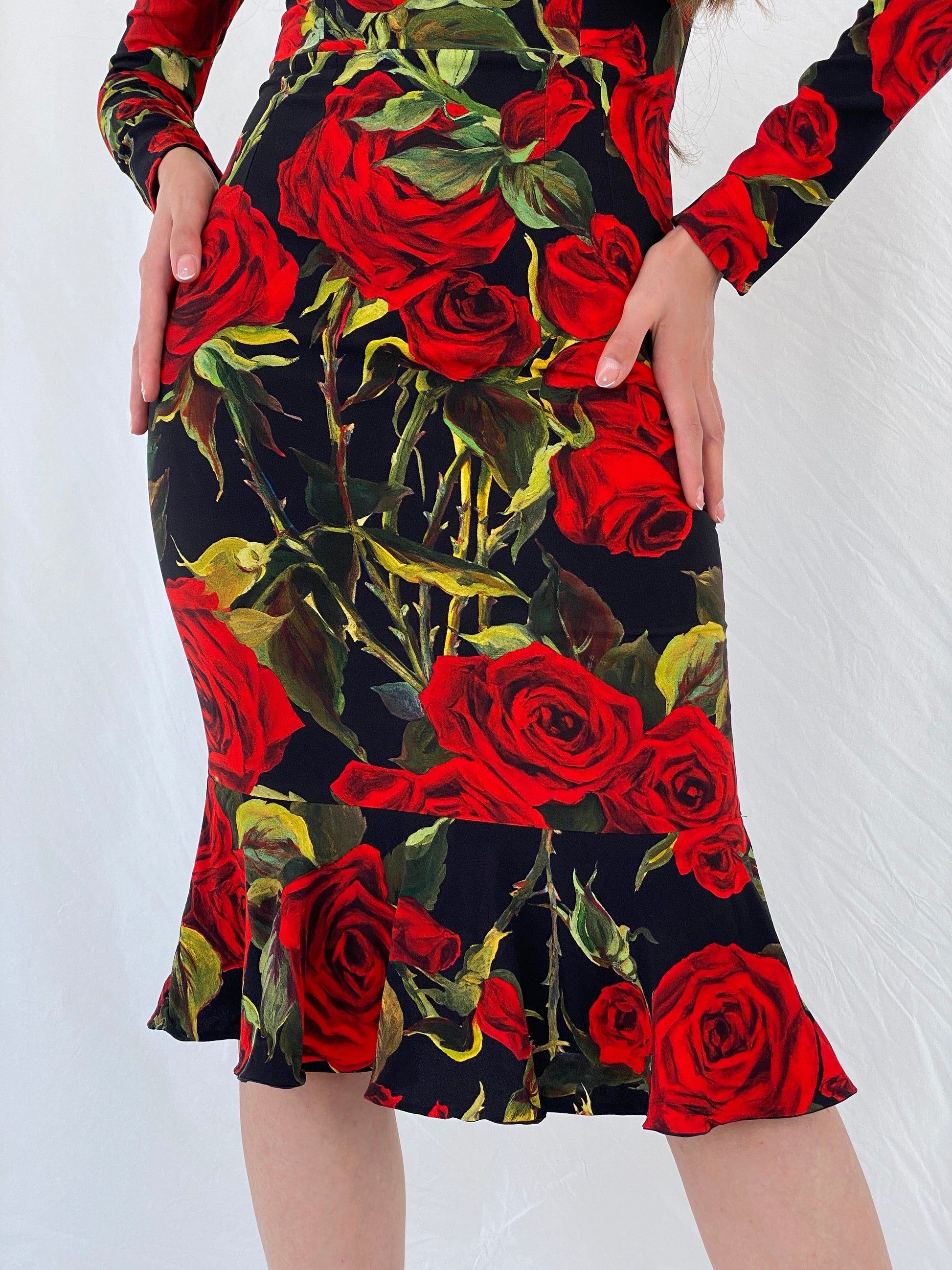 فستان دولتشي آند غابانا الحريري بطبعة الورود الحمراء بطول الركبة - مقاس صغير