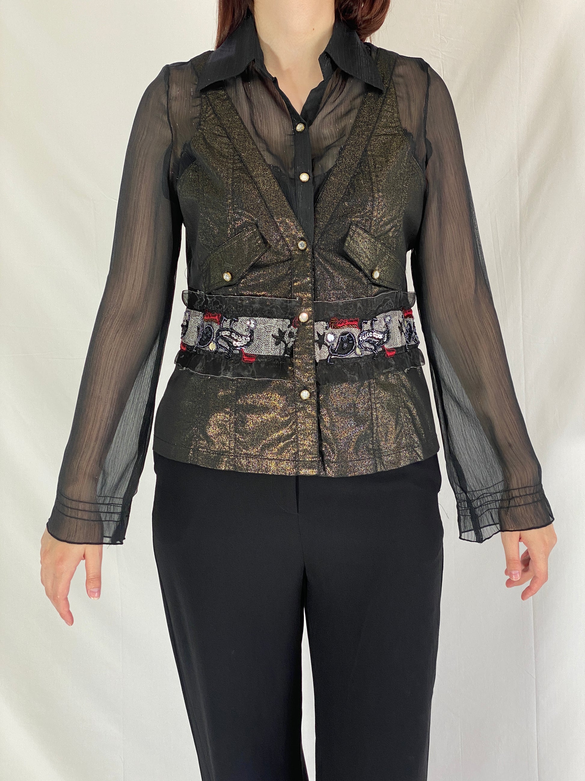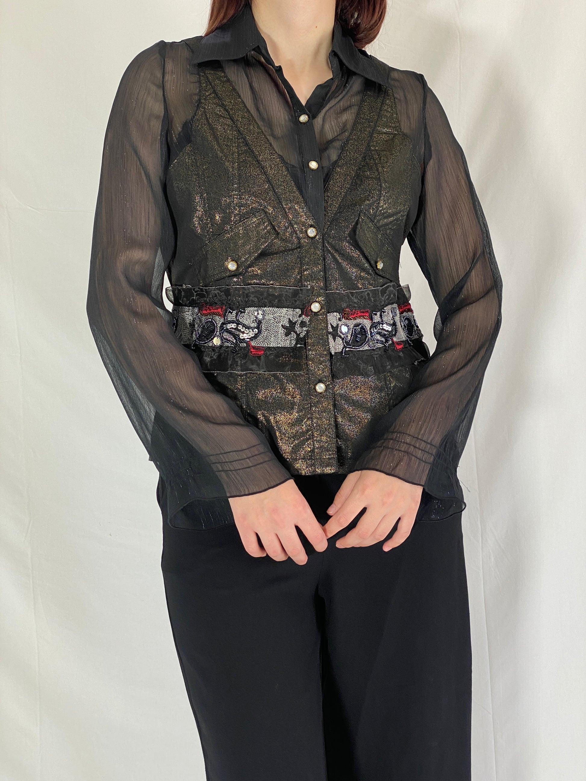 تألقي بإطلالة مميزة مع هذا القميص الكلاسيكي من فارفالا روسو، مزيج ساحر من سحر الطراز القوطي ولمعان عام 2000. صُمم هذا القميص من قماش أسود شفاف مع طبقة ذهبية معدنية، ويتميز بأزرار من اللؤلؤ، وجيوب بغطاء اصطناعي، وحزام خصر مزين بخرز متقن بزخارف نباتية باللون الفضي والأحمر والأسود.