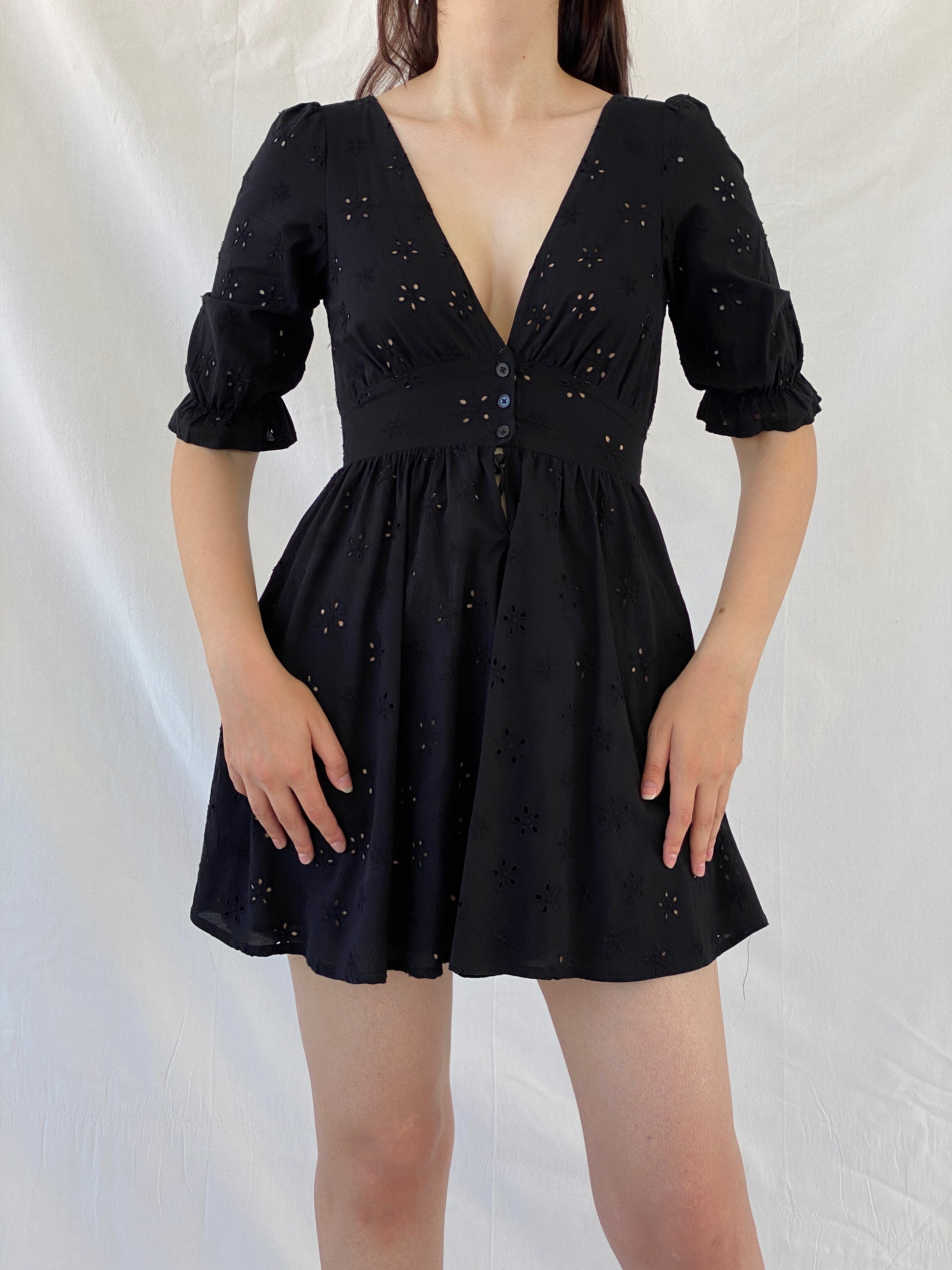 فستان صيفي قصير بأكمام منتفخة ورباط خصر من مجموعة Love & Lemons باللون الأسود - مقاس صغير