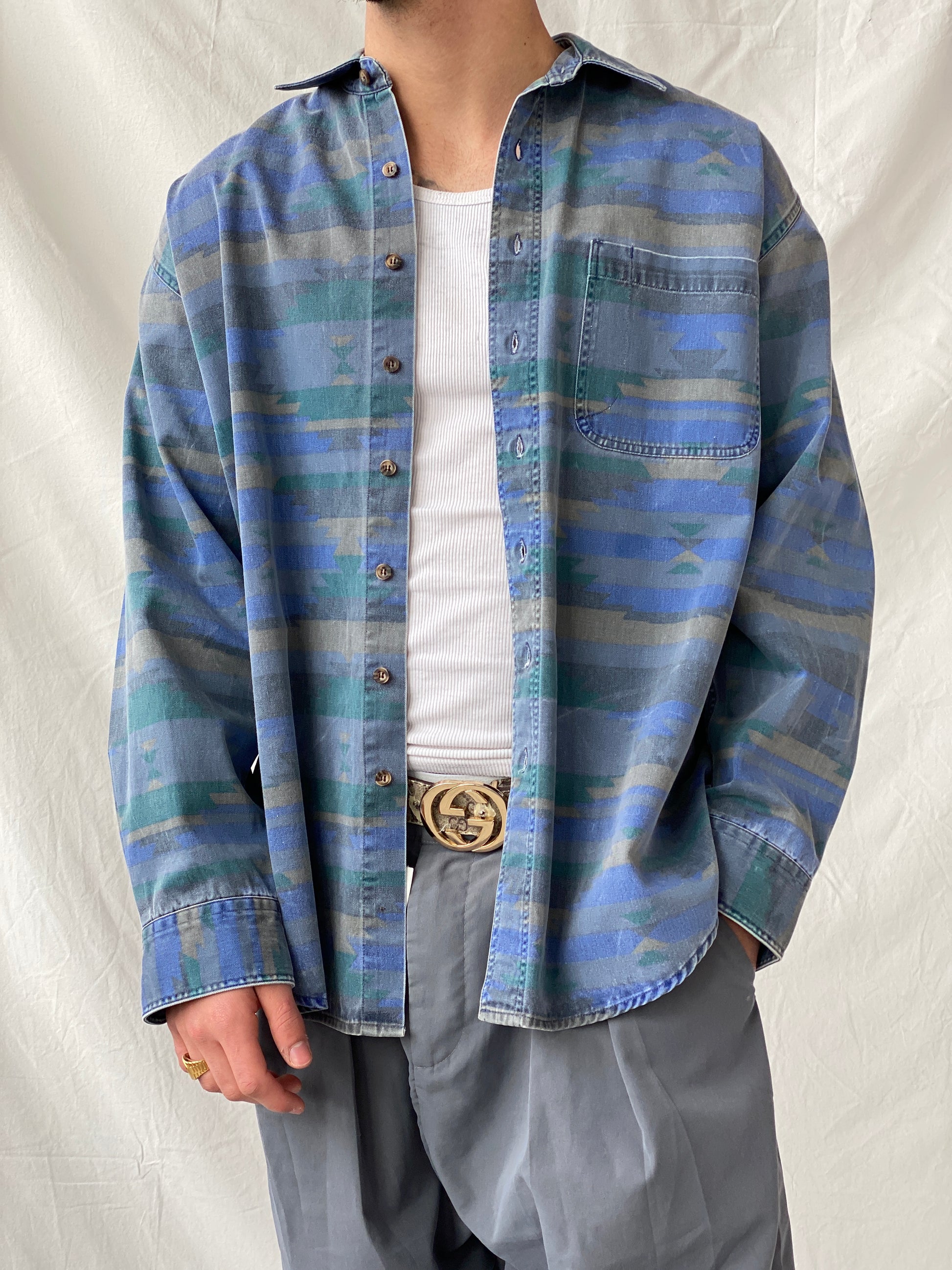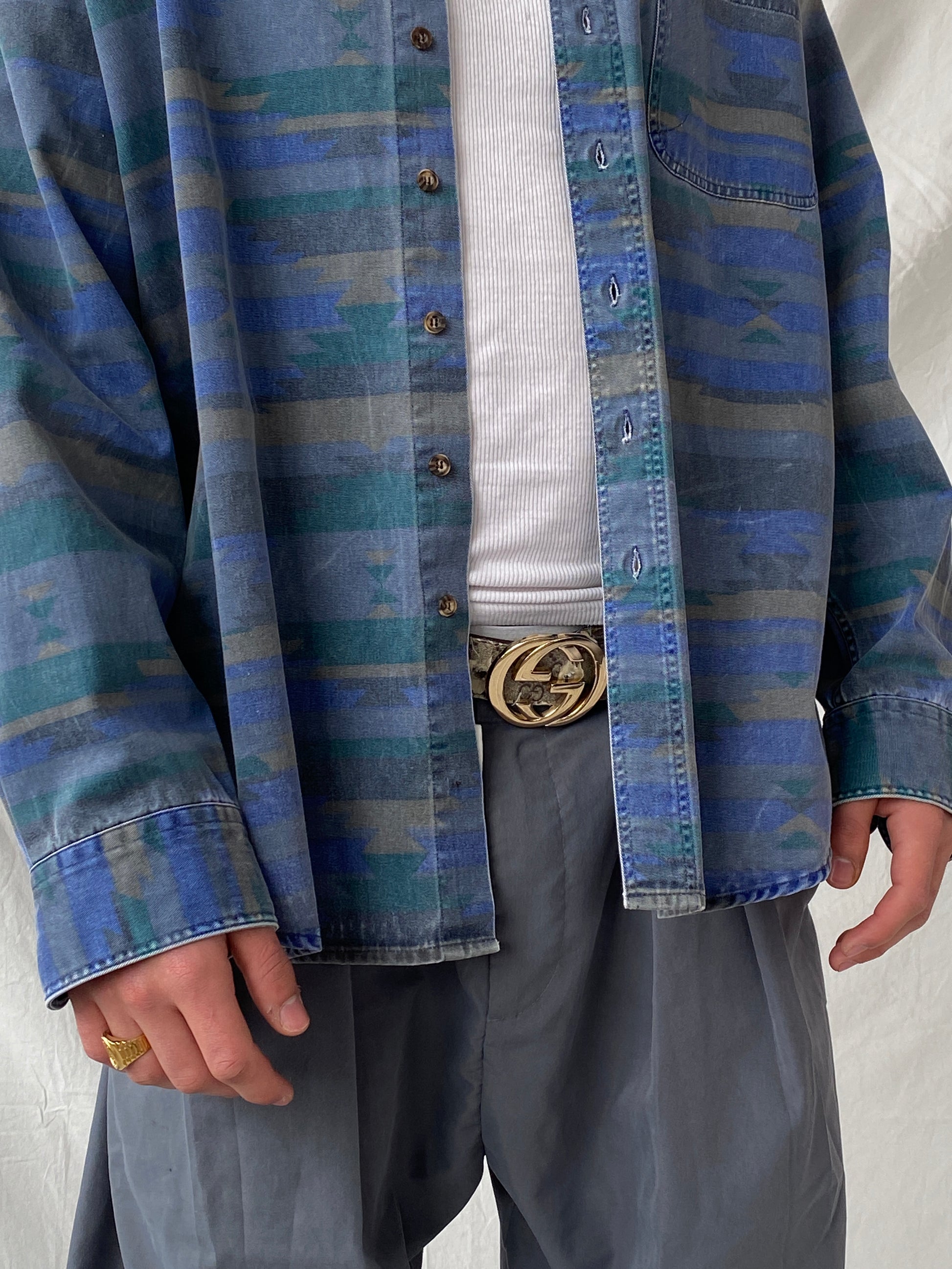 استمتع بأناقة راقية في مكان عملك مع هذا القميص الرجالي من وولريتش، بأكمام طويلة وأزرار من القطن الأزرق، بتصميم كلاسيكي من التسعينيات - مقاس كبير. أكمامه الطويلة تُضفي لمسة من الرقي، بينما تُضفي الطبعة الغربية لمسة جريئة. مثالي للرجل العصري الذي يسعى لترك انطباع يدوم.