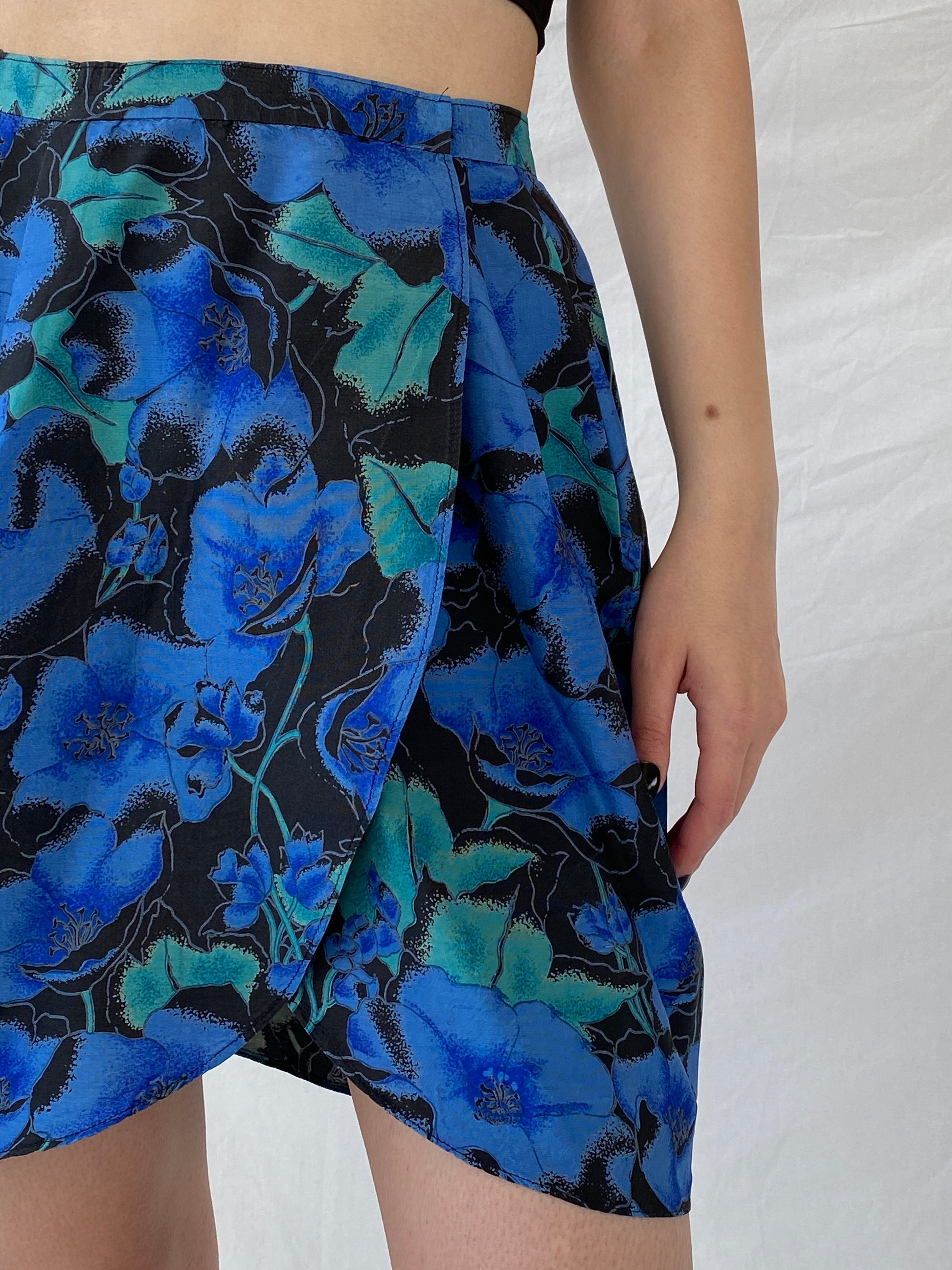 تألقي بأناقة راقية مع تنورتنا الملفوفة القصيرة الزرقاء الجميلة والمزينة بالورود، والمصنوعة يدويًا! مصنوعة من مواد عالية الجودة، وتتميز بتصميم ملفوف فريد، ما يجعلها مثالية لأي إطلالة عصرية.