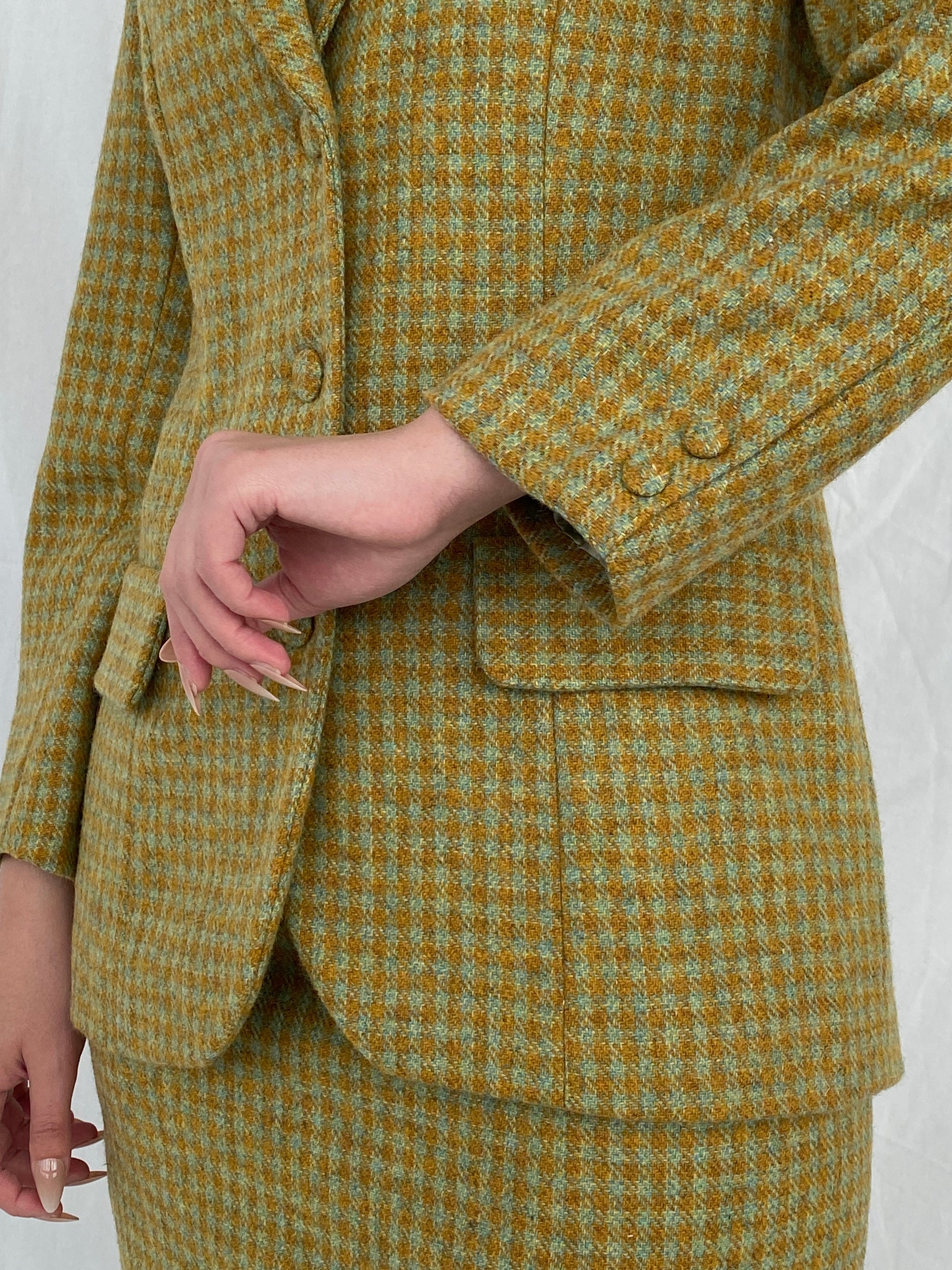 طقم تنورة بليزر من مزيج الصوف الأصفر والأخضر بتصميم مربعات مصنوع يدويًا - مقاس متوسط