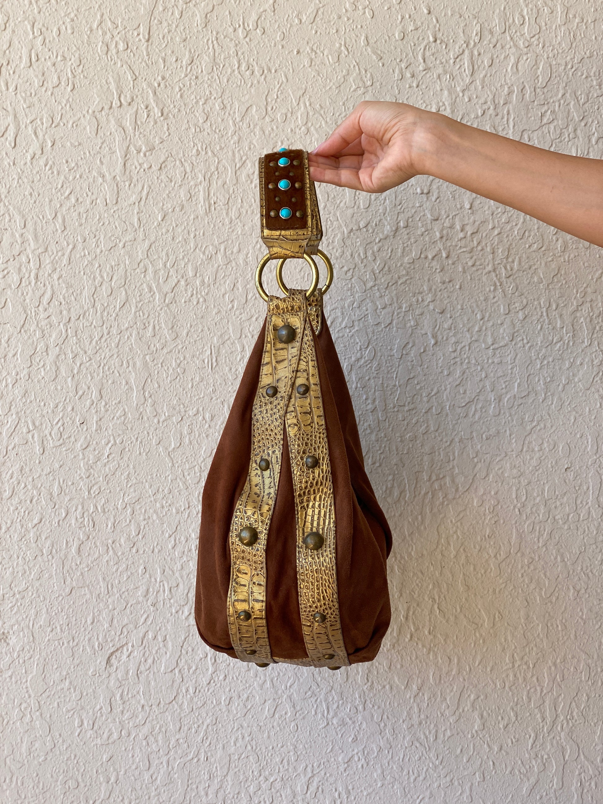 عززي أناقتكِ مع حقيبة الكتف الرائعة من كاثي فان زيلاند، المصنوعة من جلد الغزال البني النباتي، والمزينة بجلد صناعي ذهبي، بتصميم بوهو غربي. تألقي بتصميمها الدائري الرائع المصنوع من الجلد المرصع بأحجار رعاة البقر، والمزين بشعر الخيل والخرز الفيروزي. مثالية لإضفاء لمسة غربية على أي إطلالة.
