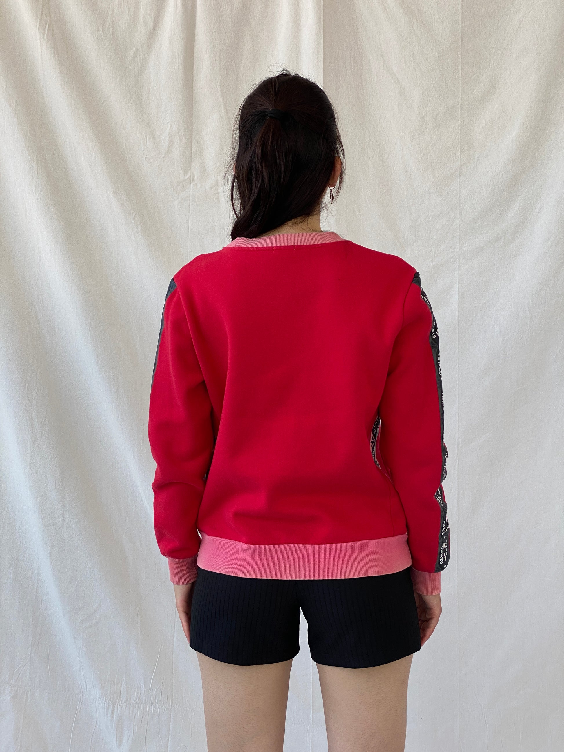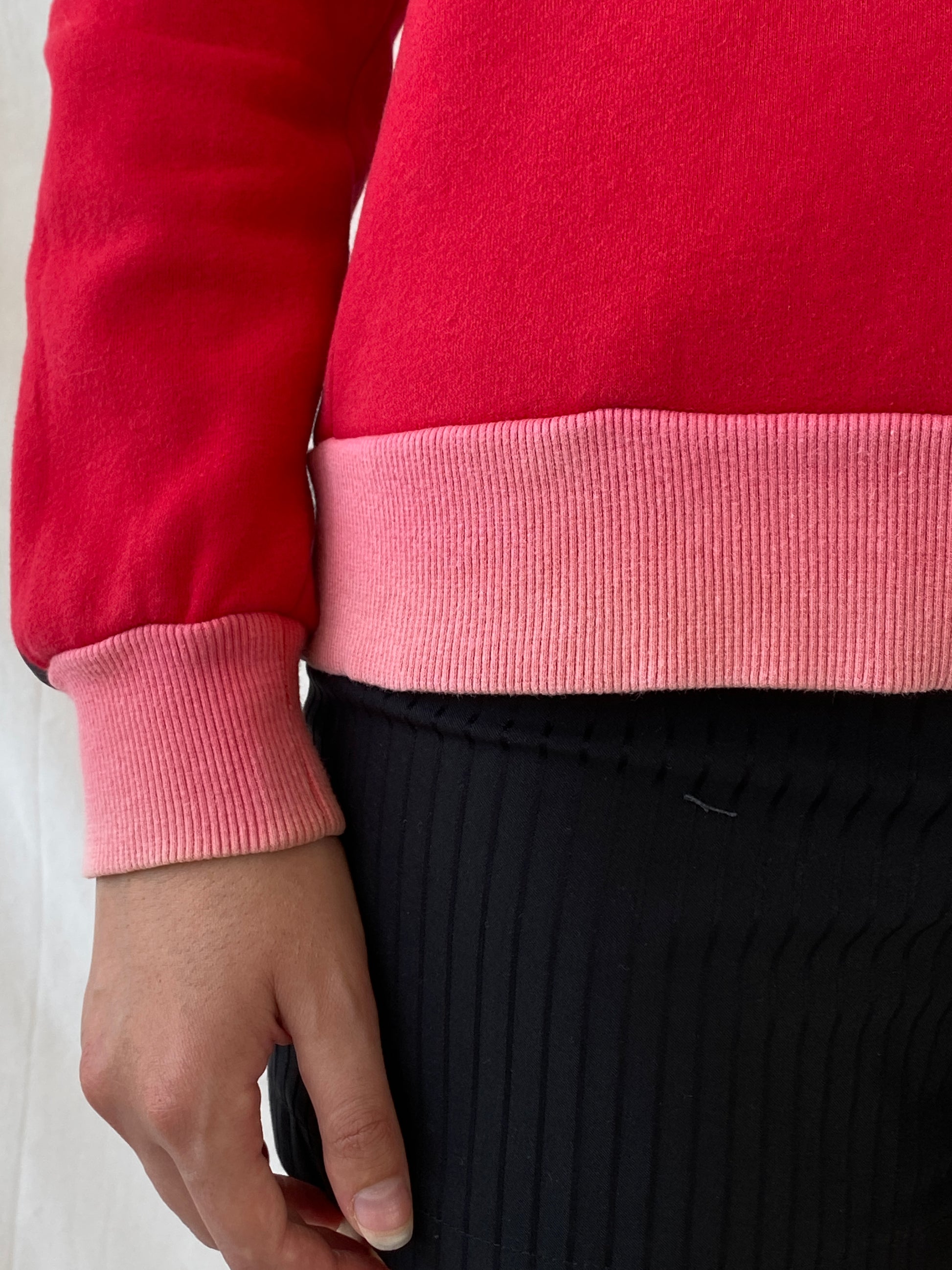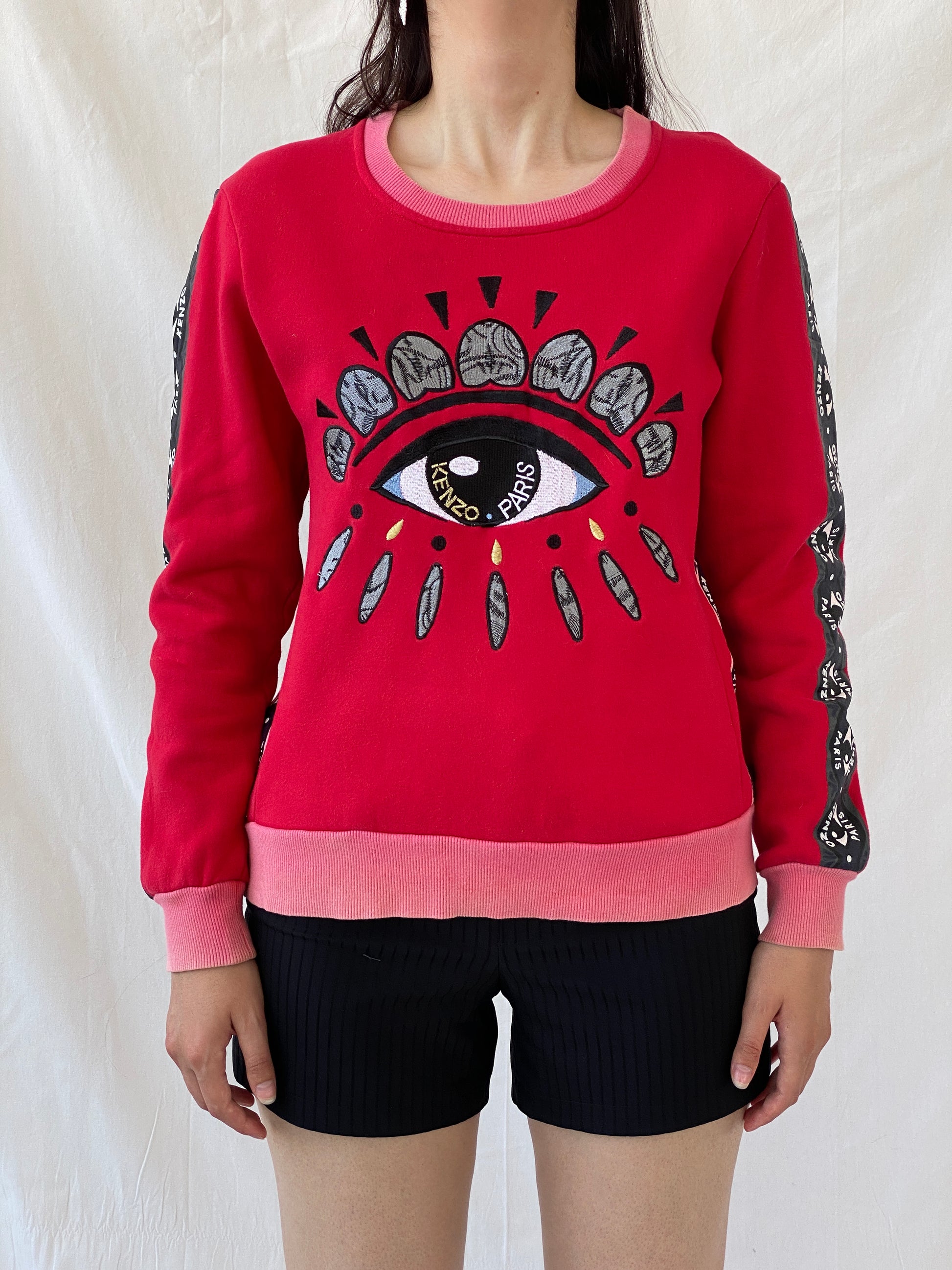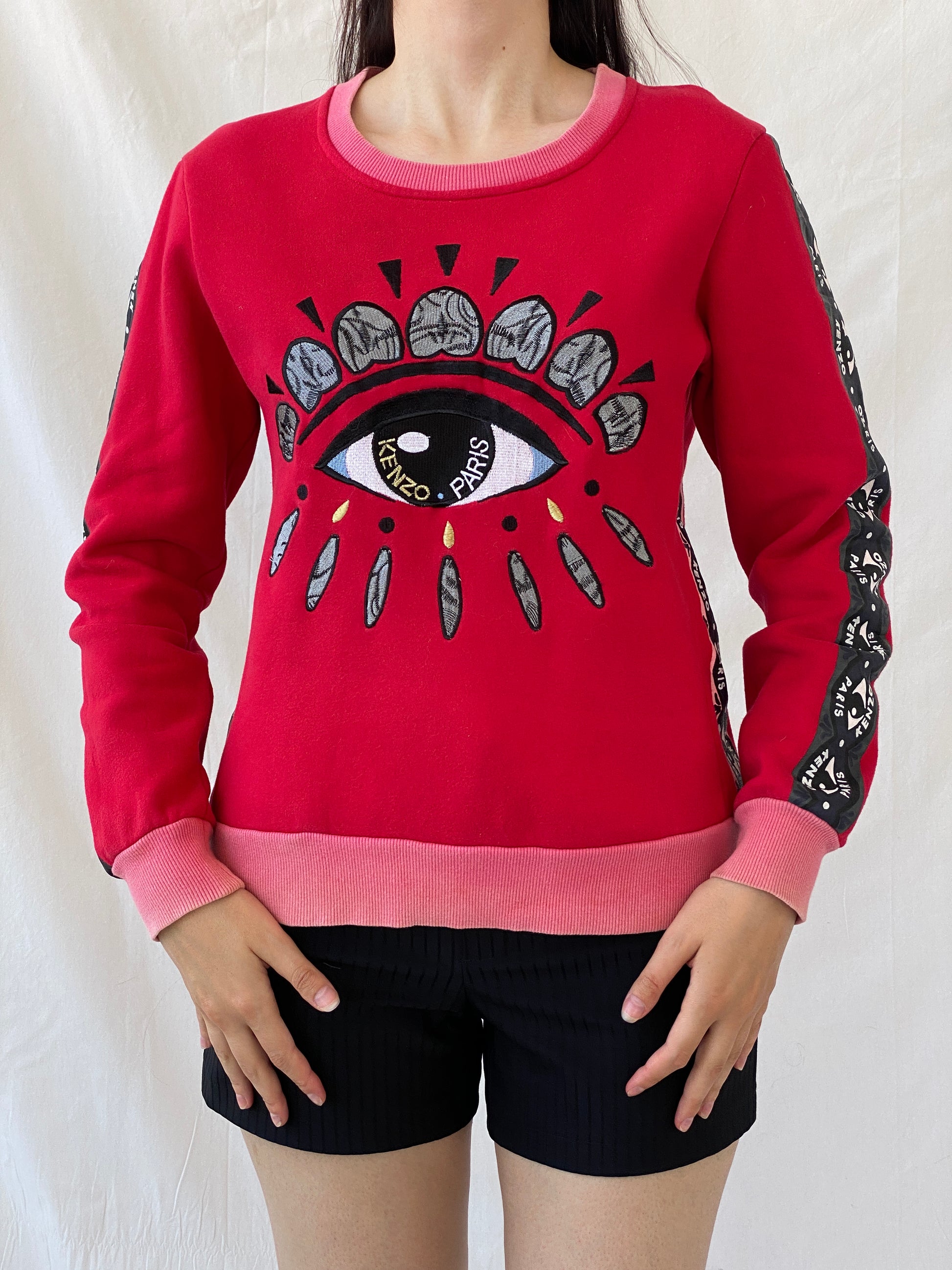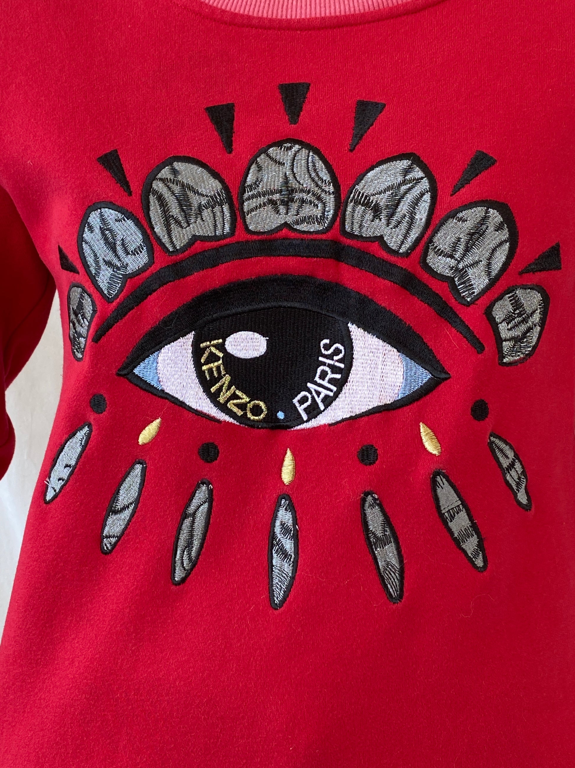 سترة كينزو باريس الحمراء من الصوف بطبعة عين، بياقة دائرية، قطن، مقاس صغير