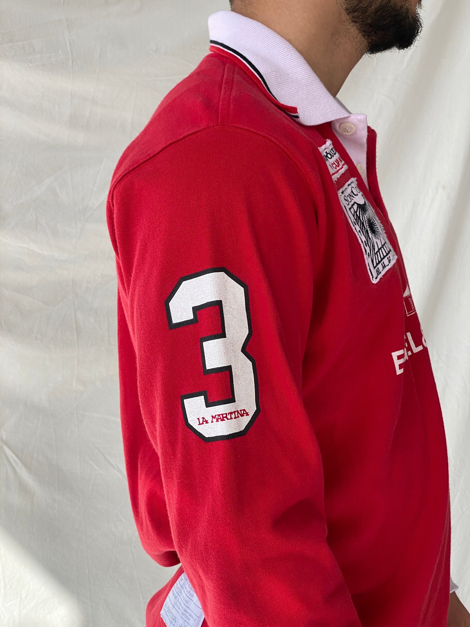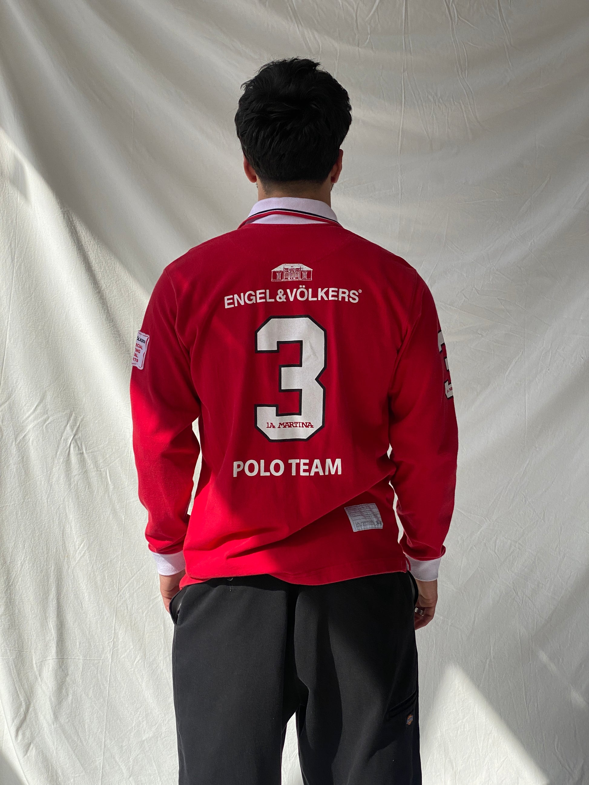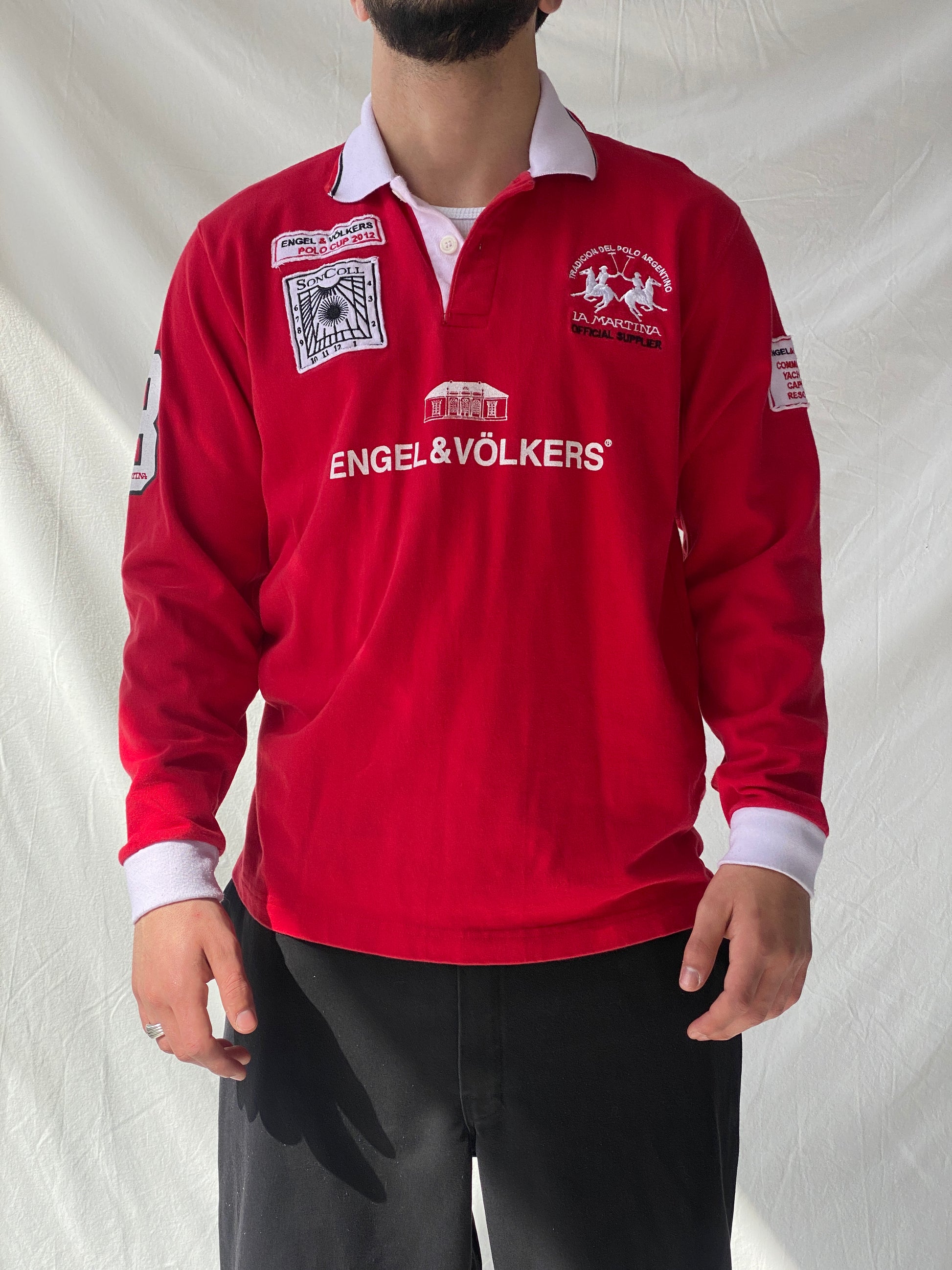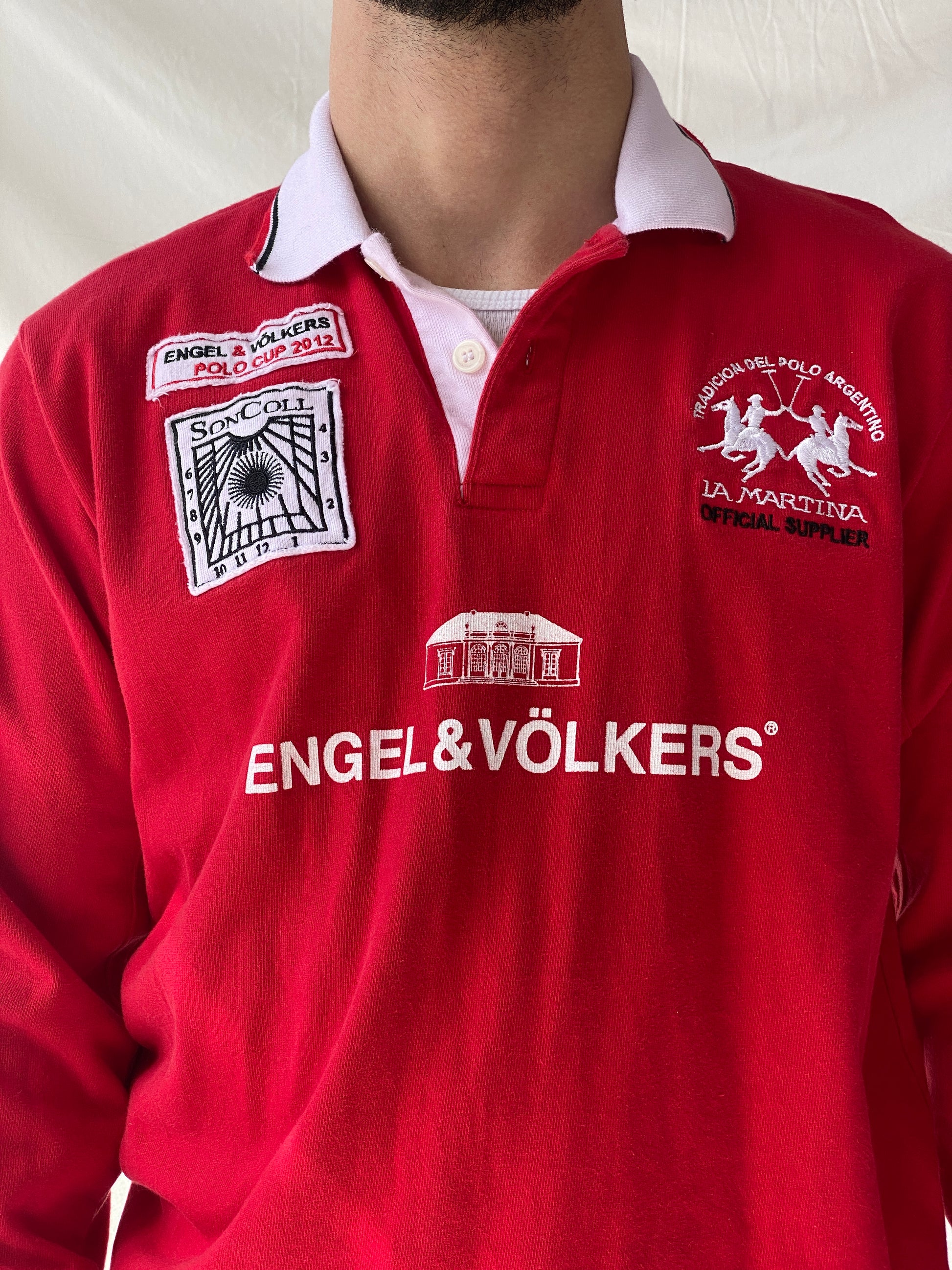 استمتع بأقصى درجات الأناقة في عالم البولو مع قميص بولو إنجل آند فولكرز الأحمر بأكمام طويلة من لا مارتينا سادليري 2012 بولو كاب. مصنوع من قطن عالي الجودة، مثالي للارتداء مع جينز داكن فضفاض وحذاء رياضي أبيض لإطلالة أنيقة ومريحة.