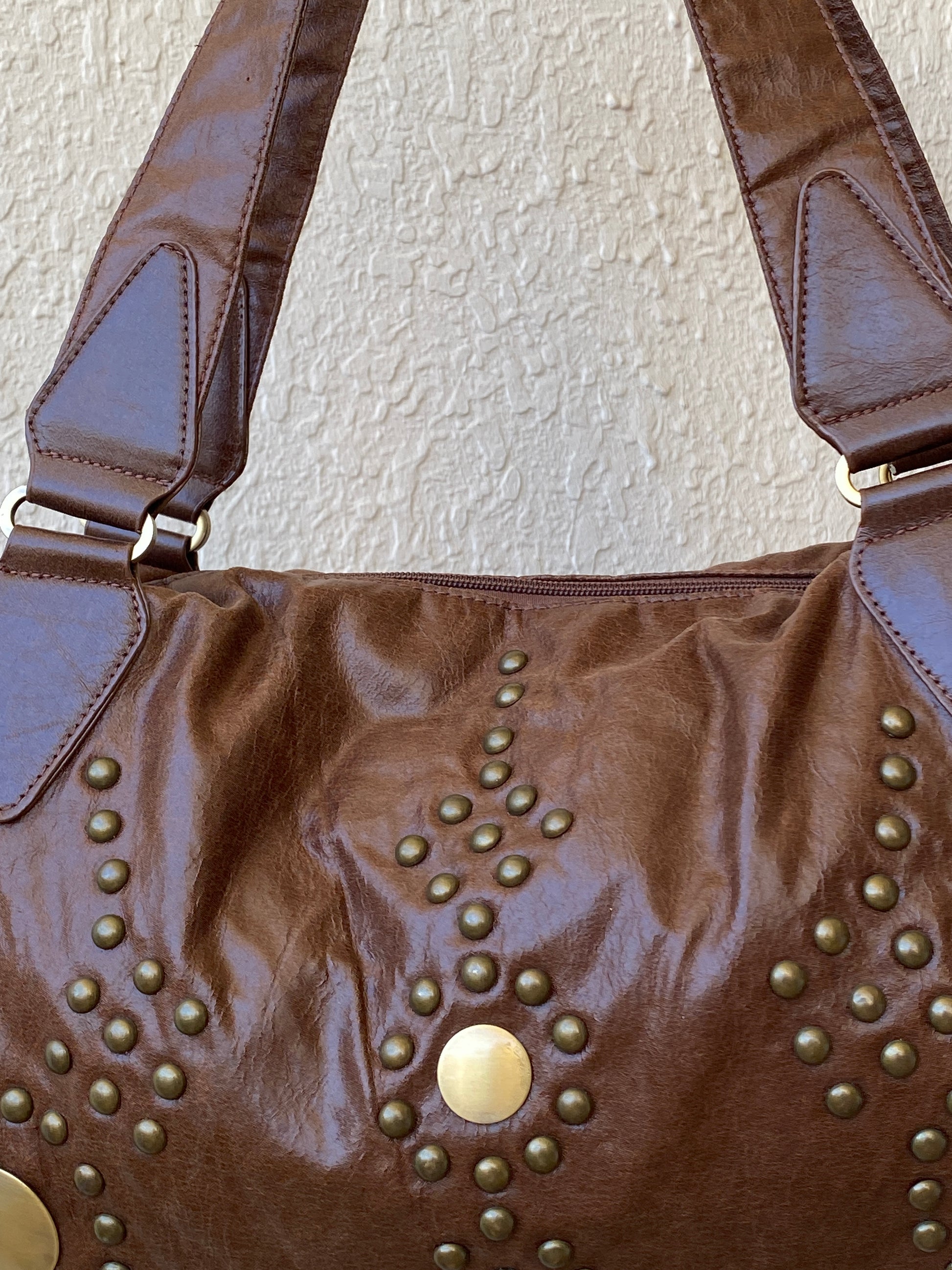 حقيبة كتف مذهلة من مارك بيكارد باللون البني، مرصعة بمسامير برونزية غربية