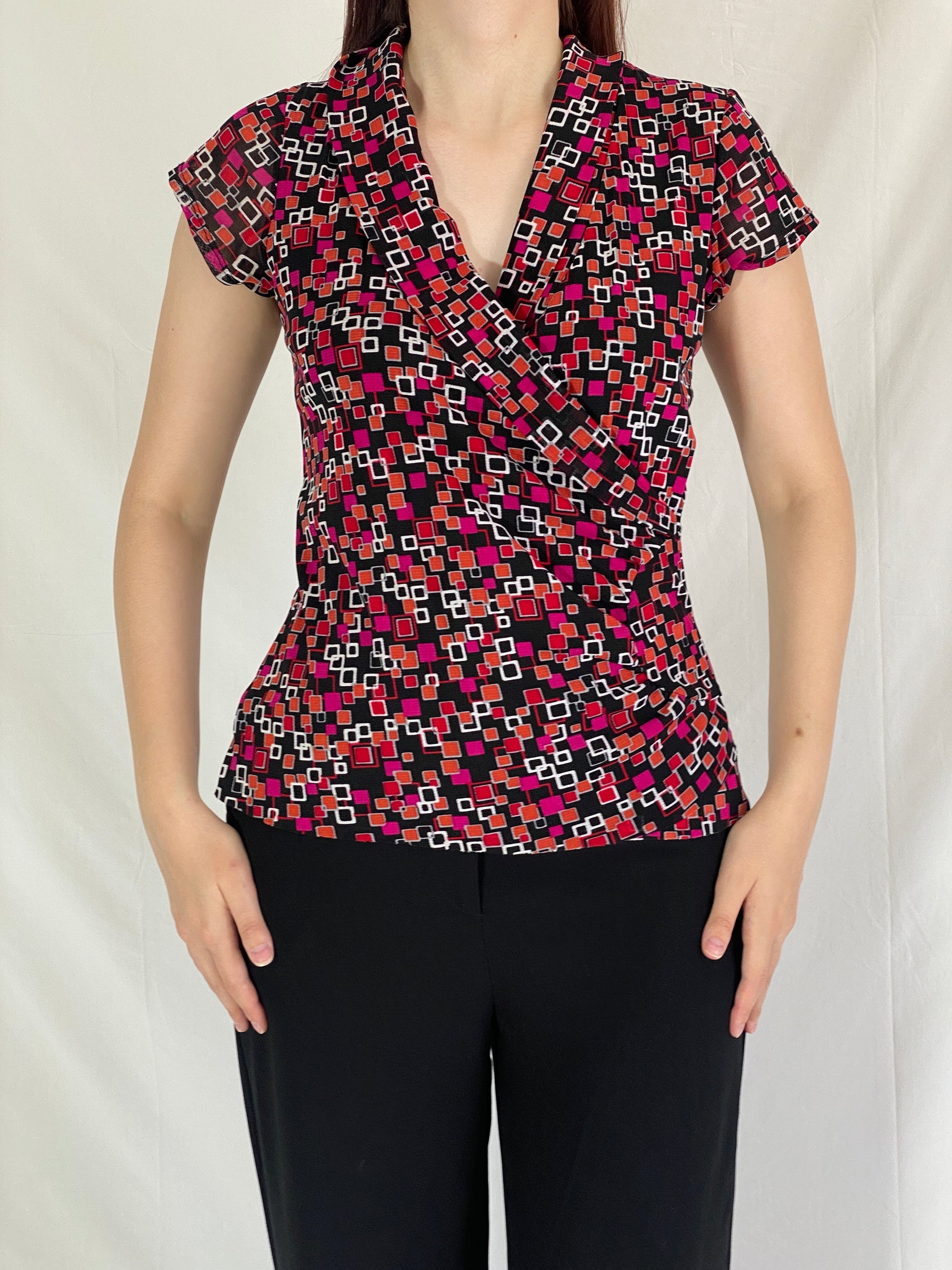 بلوزة ماركو بولو Y2K ذات الخصر الملفوف والمكشكشة ذات الطباعة الهندسية بأكمام قصيرة - مقاس متوسط