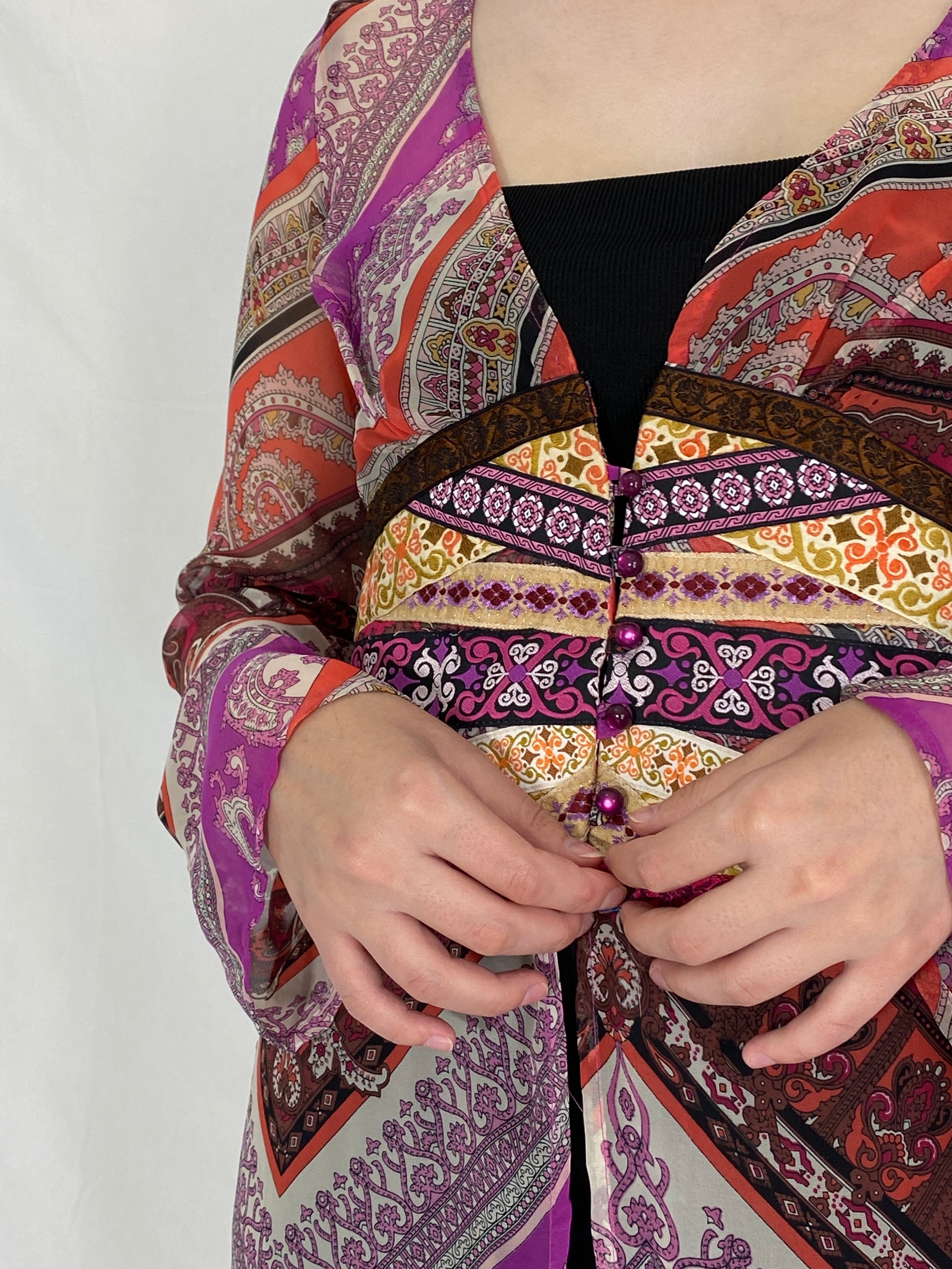 - المميزات: طول كامل مع شقوق جانبية عالية، وأكمام طويلة، وطبعة بوهو نابضة بالحياة