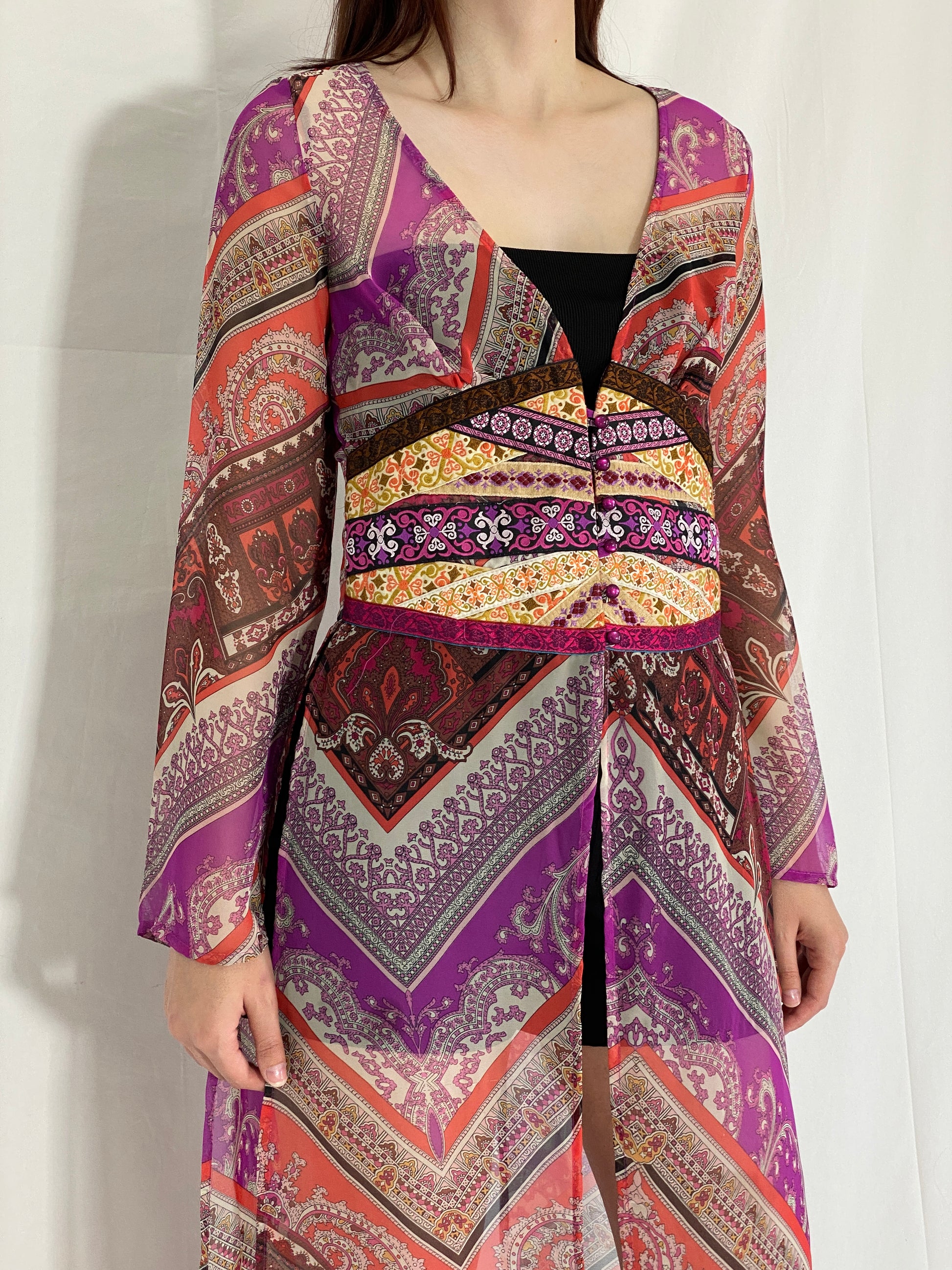 فستان ماكسي شفاف بوهو من تصميم ميغان نولاند، بتصميم فينتاج مازي جولد، مع طبعة احتفالية وفتحات جانبية - مقاس متوسط
