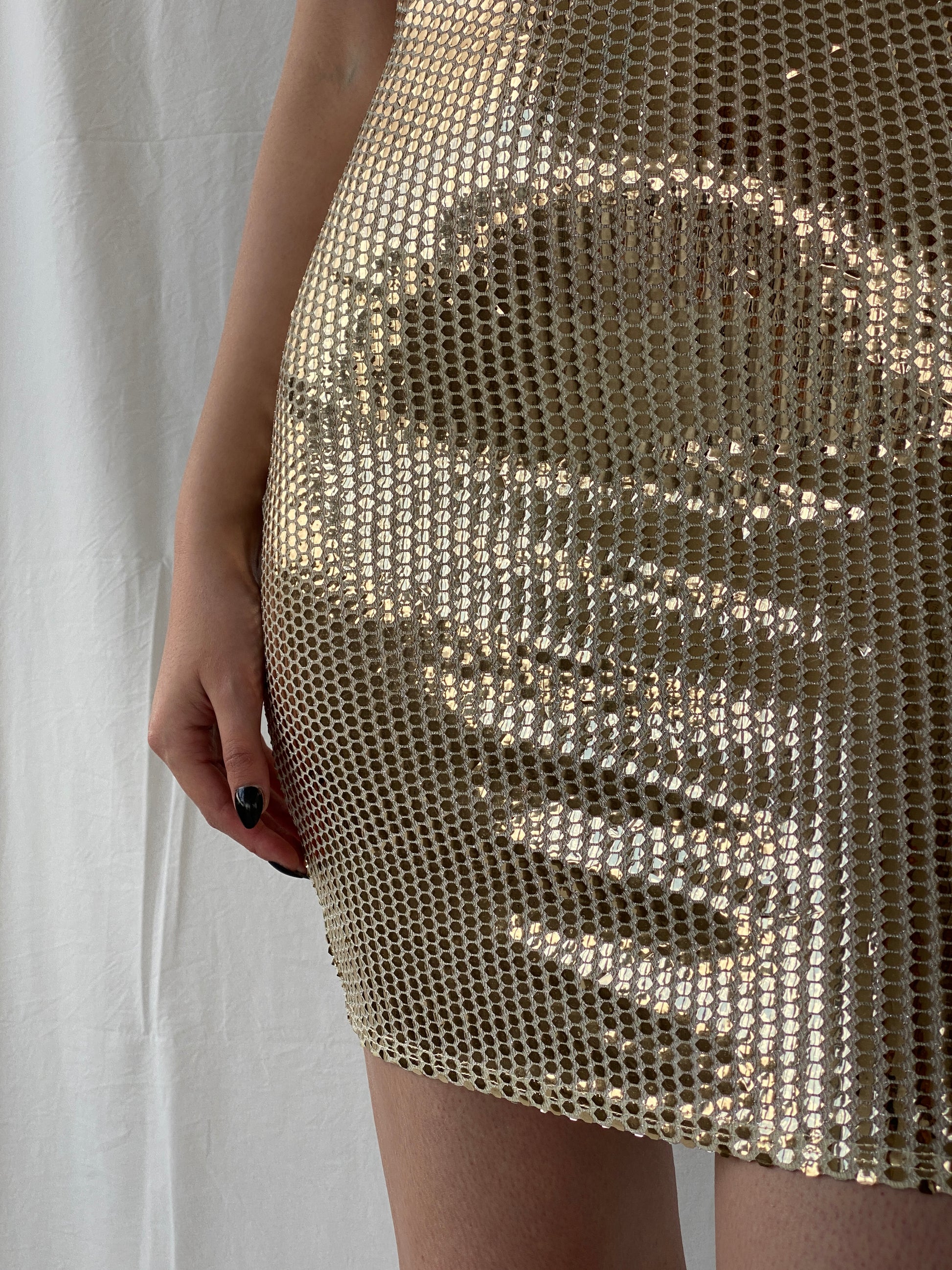 فستان سهرة من Missguided ذهبي مزين بالترتر وفتحة رقبة على شكل هالتر وظهر مفتوح - مقاس صغير