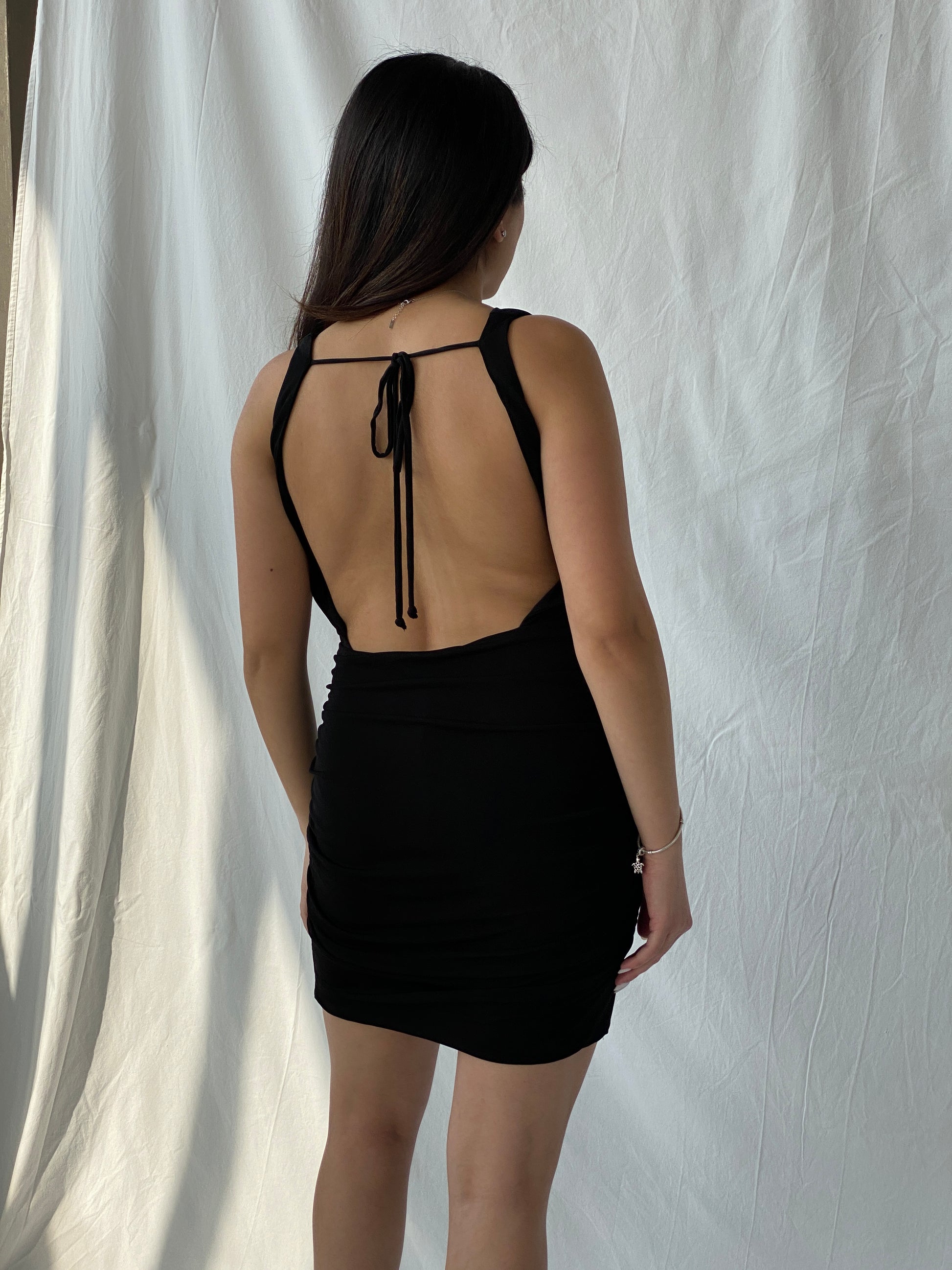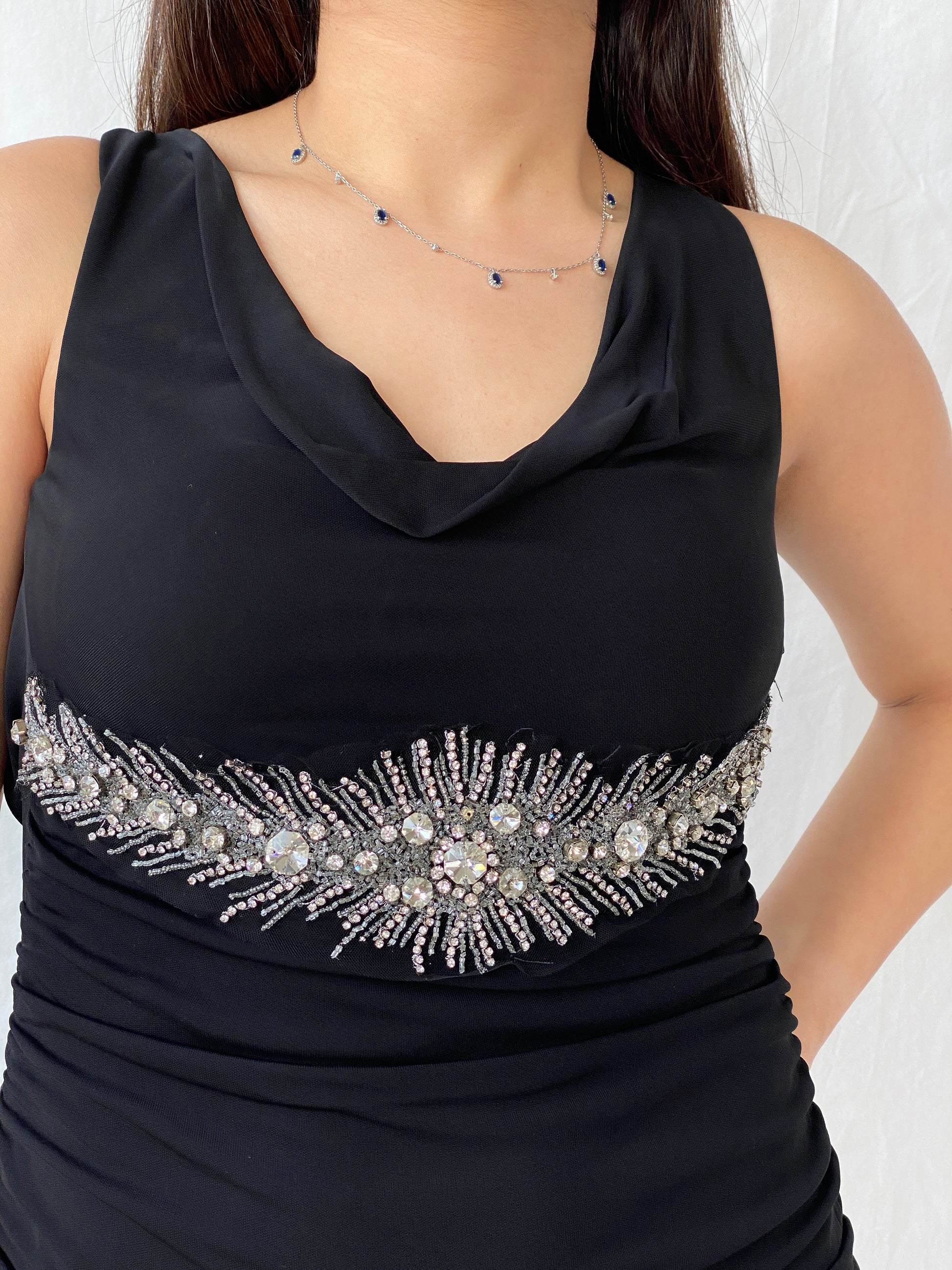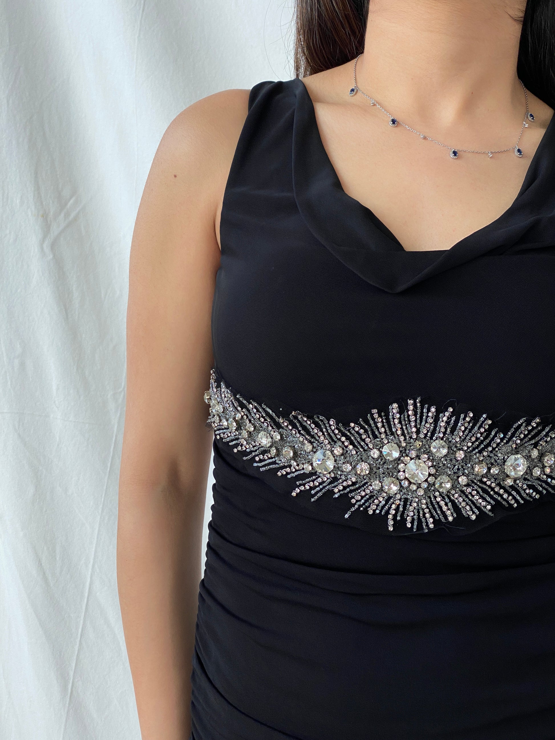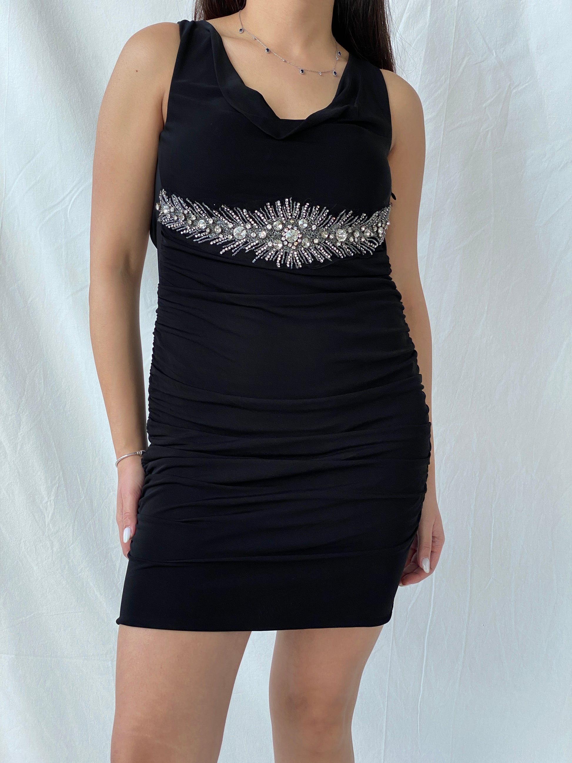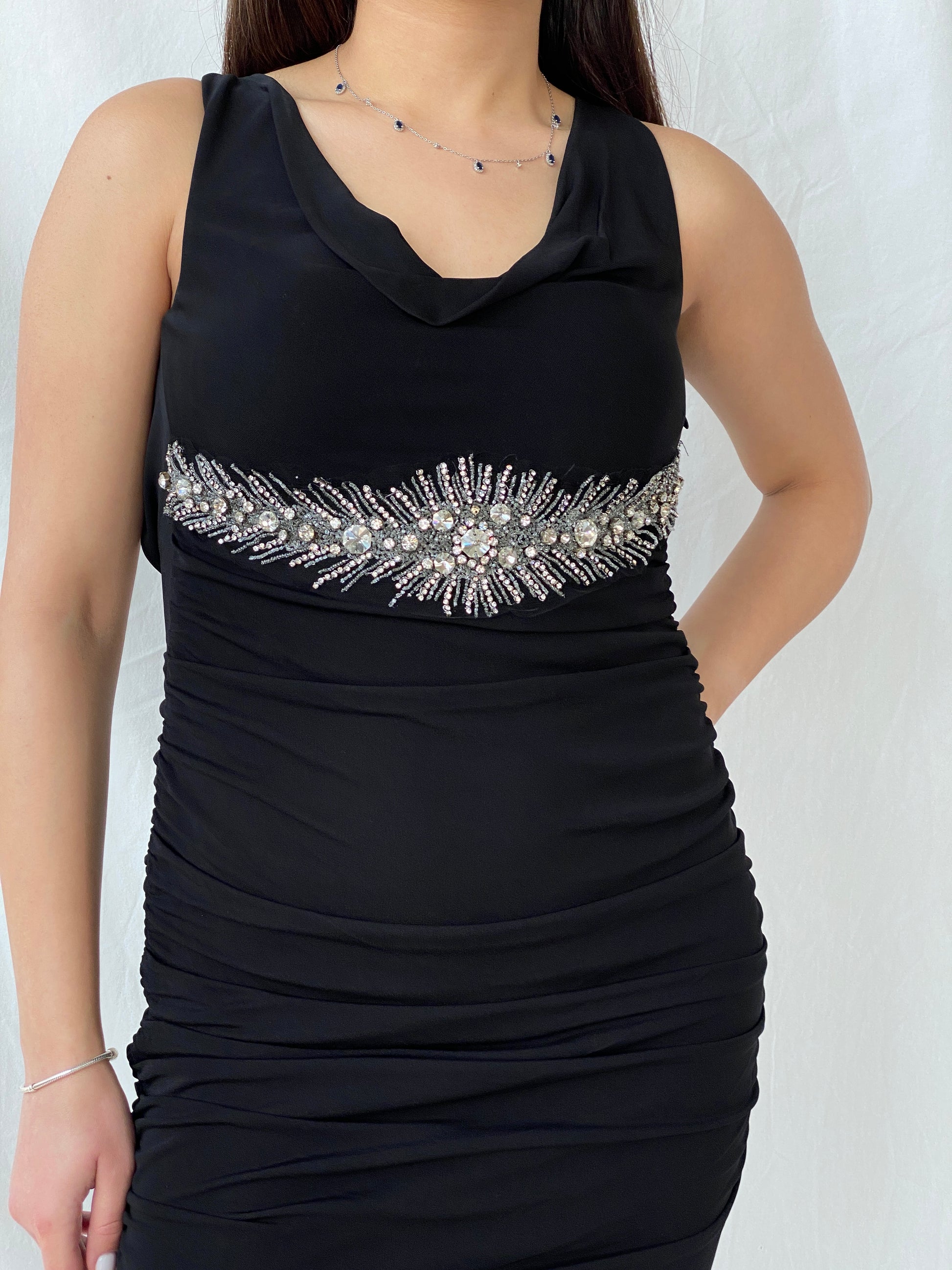 فستان نيكول باكتي Y2K بدون أكمام أسود ضيق مفتوح الظهر متوسط الطول فضي مزين - مقاس صغير