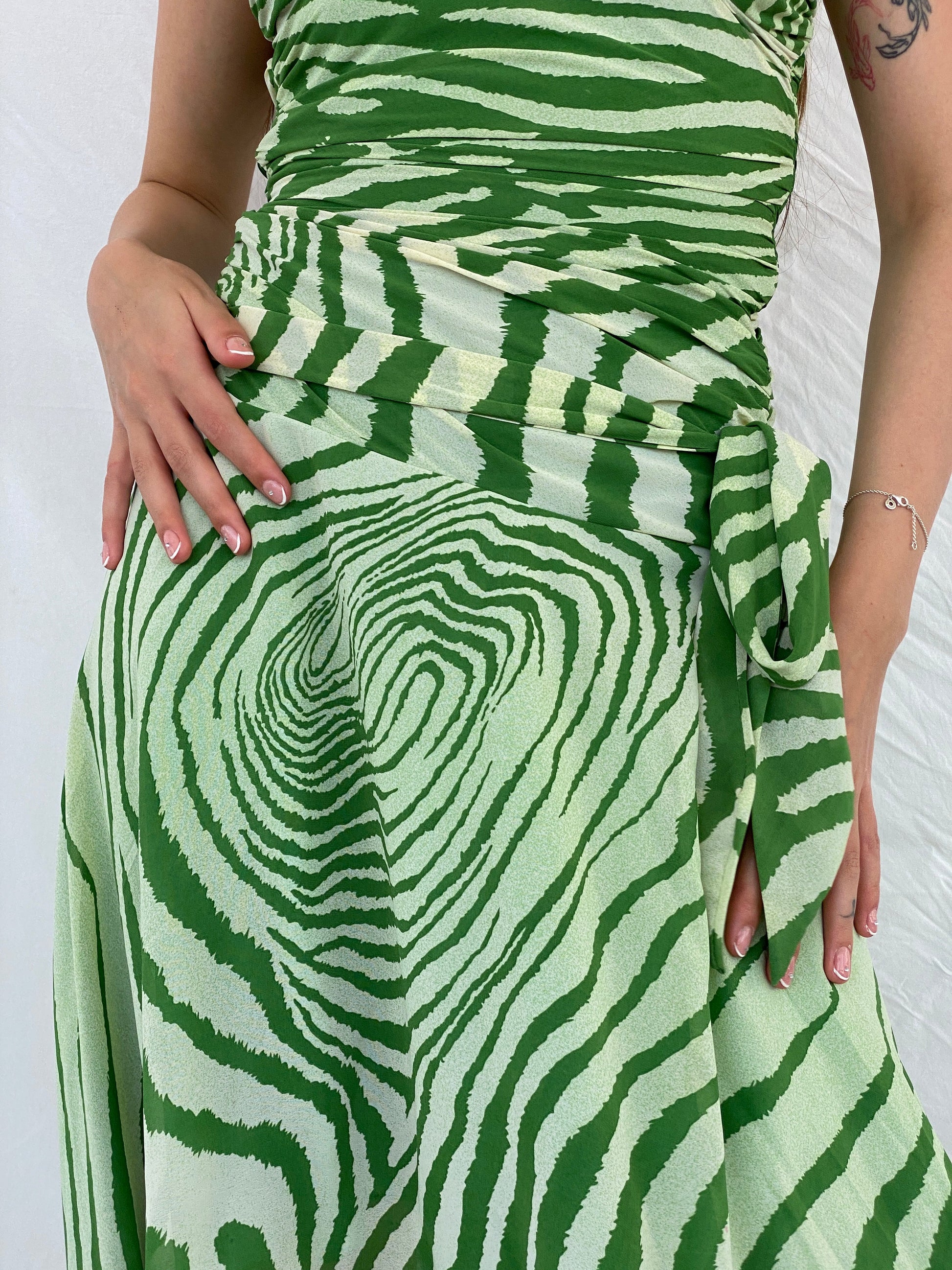 فستان بيجريم الأخضر غير المتماثل بطبعة حمار وحشي مع سحاب على الخصر وربطة على الخصر - مقاس صغير