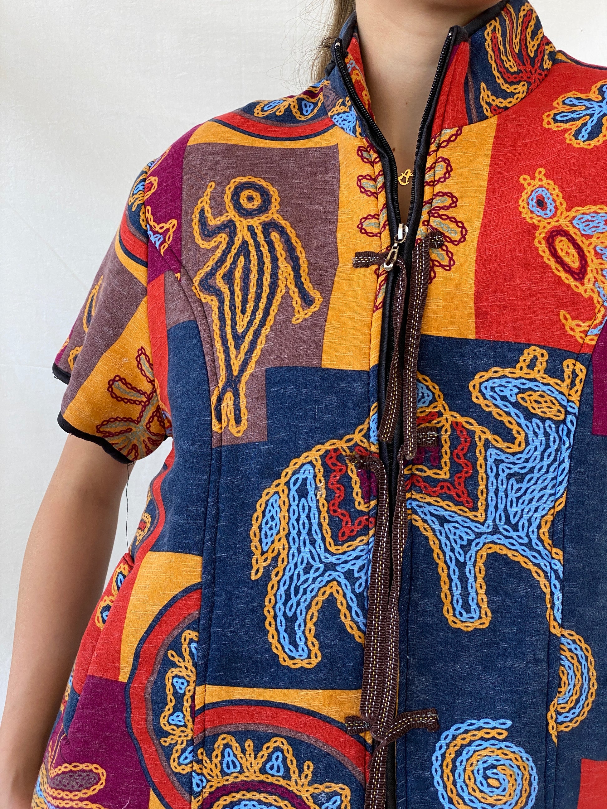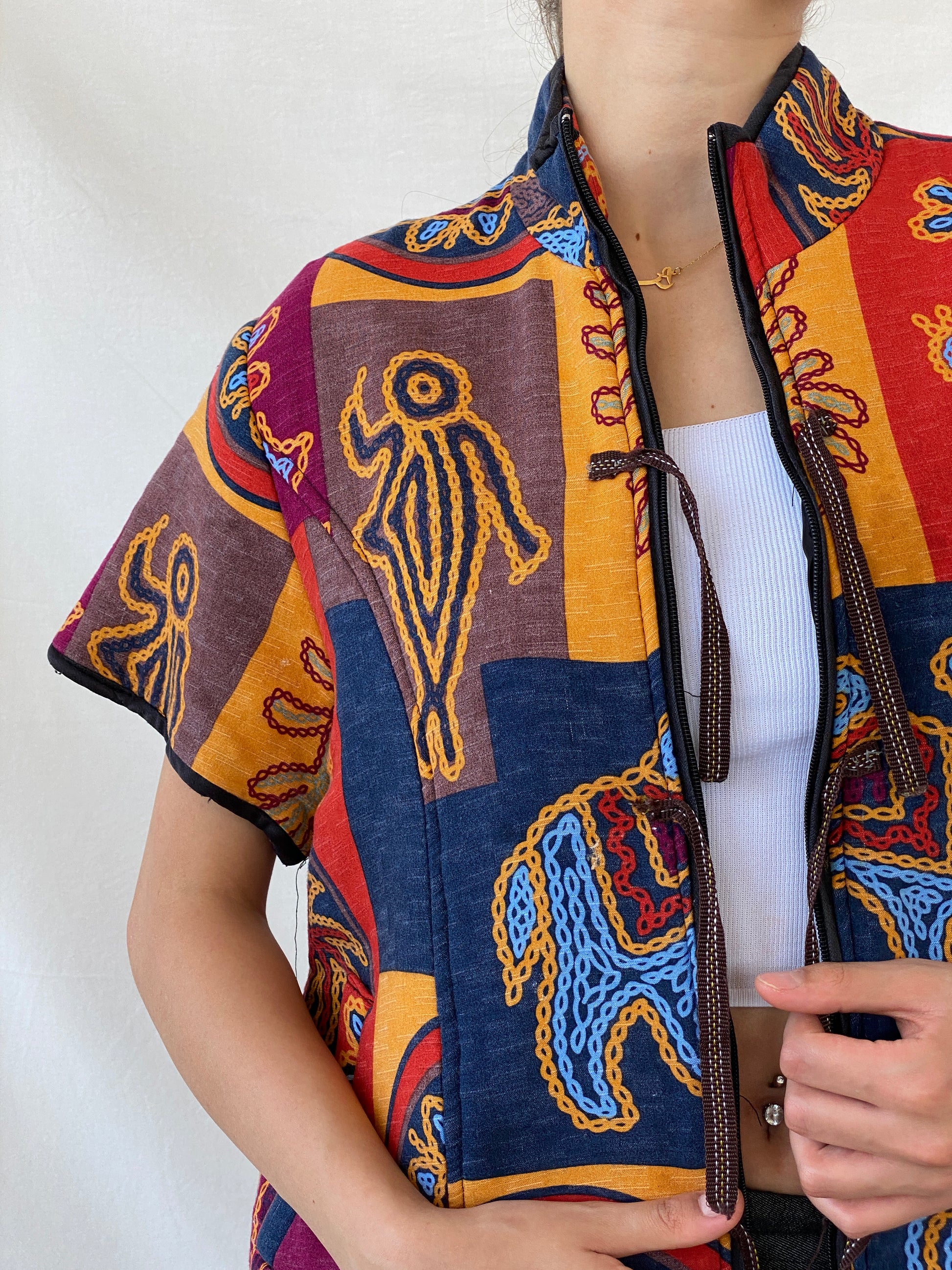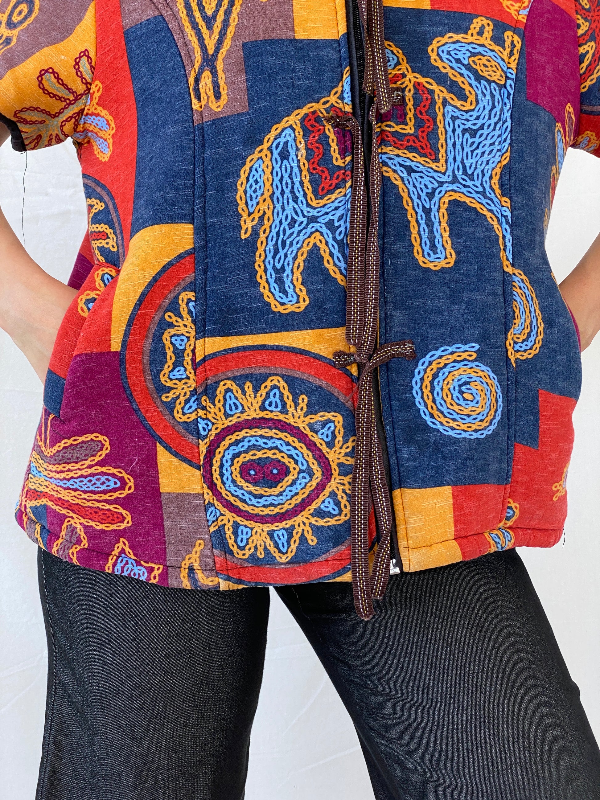 سترة بوليرو يابانية مبطنة متعددة الألوان بتصميم قبلي عرقي، قطعة مميزة تجمع بين تصميم الكيمونو الياباني التقليدي وطبعة قبلية جريئة وفريدة. تصميمها المبطن يضفي عليها الدفء والراحة، مما يجعلها مثالية لأي مناسبة. تألقي بأناقتكِ وتميزي مع هذه السترة الفريدة.