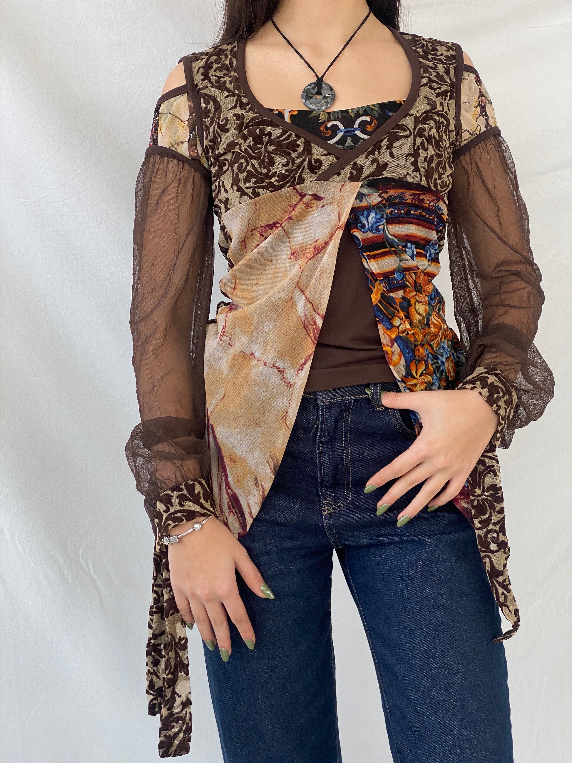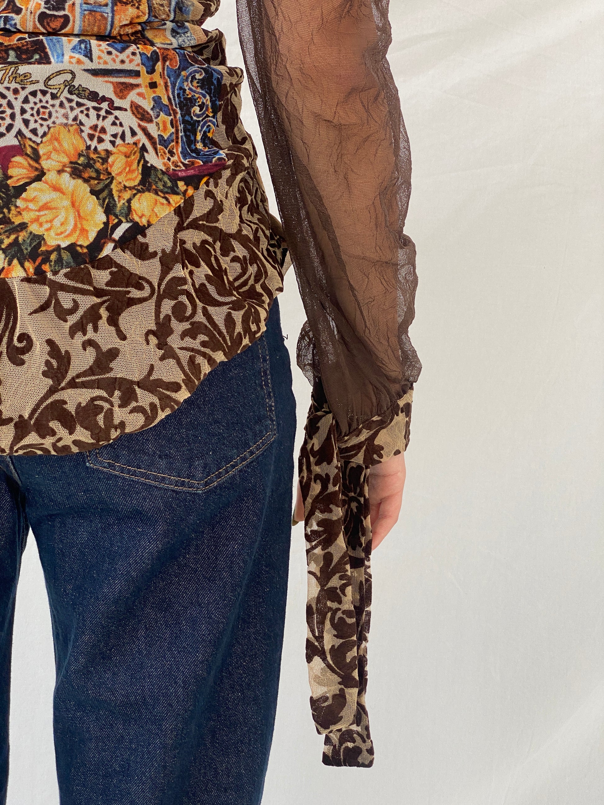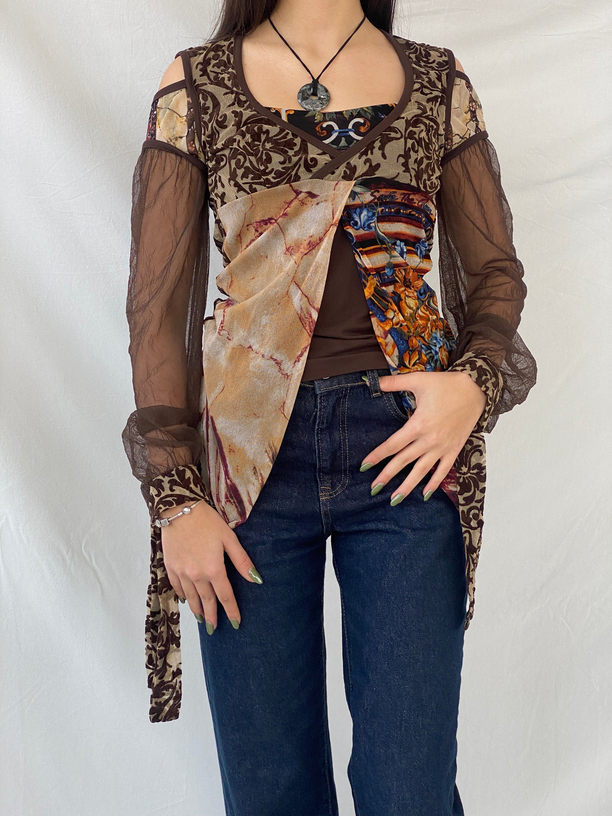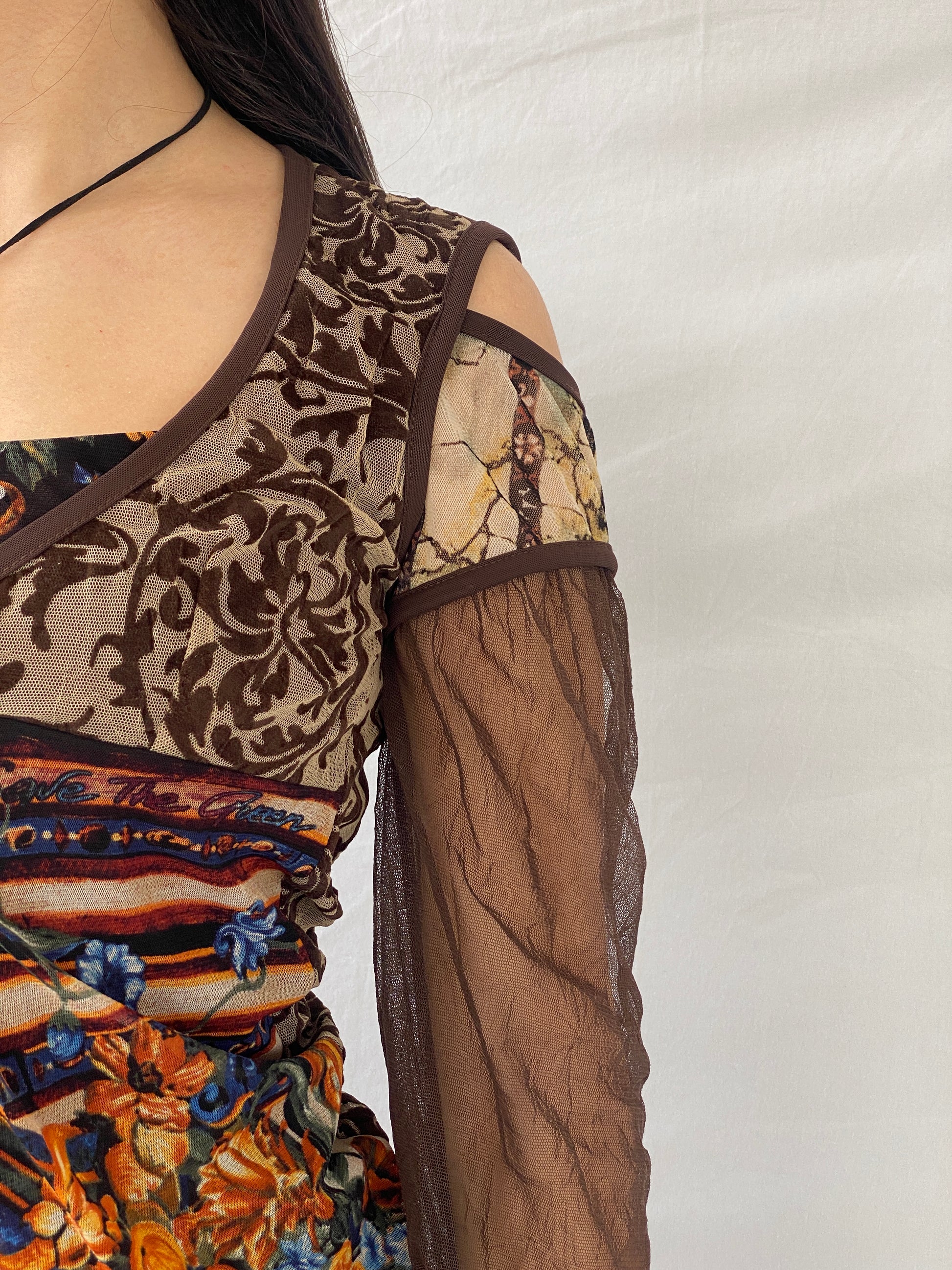 بلوزة "أنقذوا الملكة" بنية اللون بأكمام طويلة شفافة غير متماثلة - مقاس متوسط