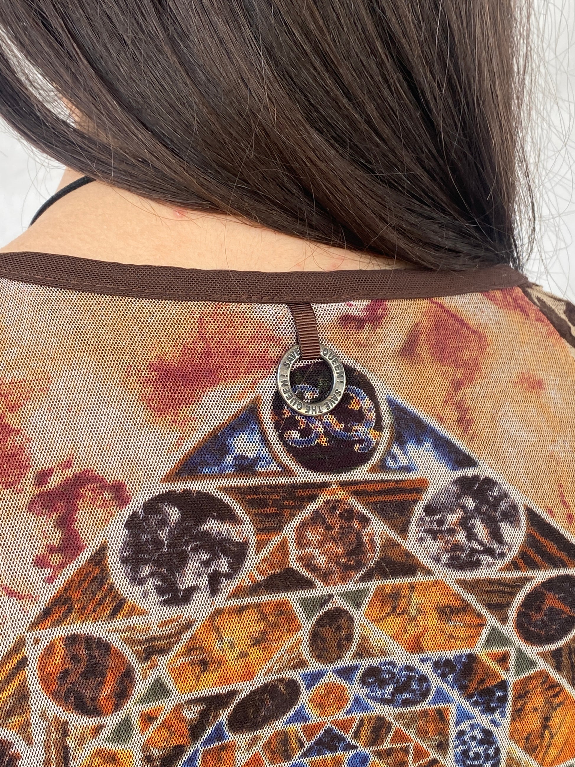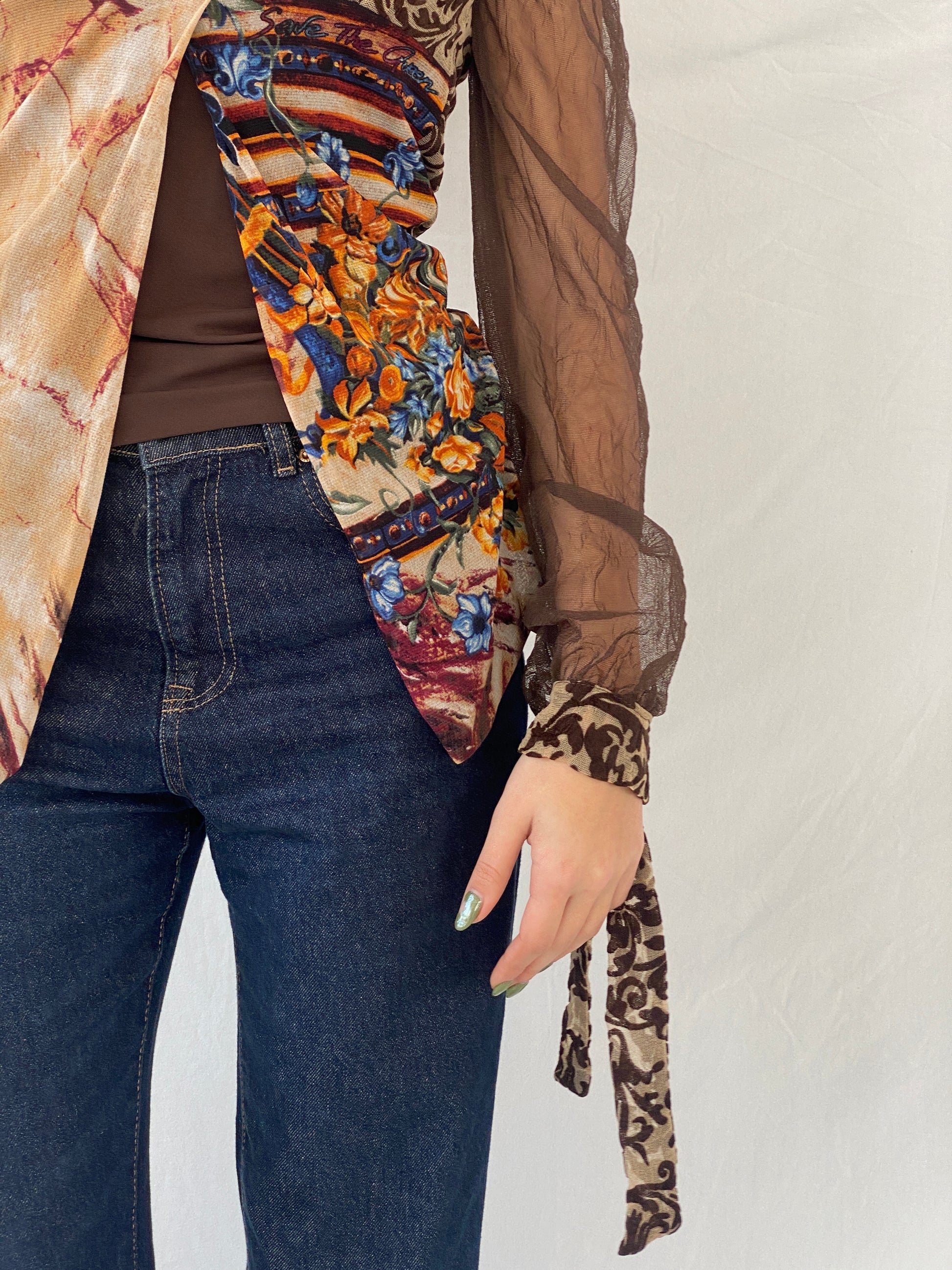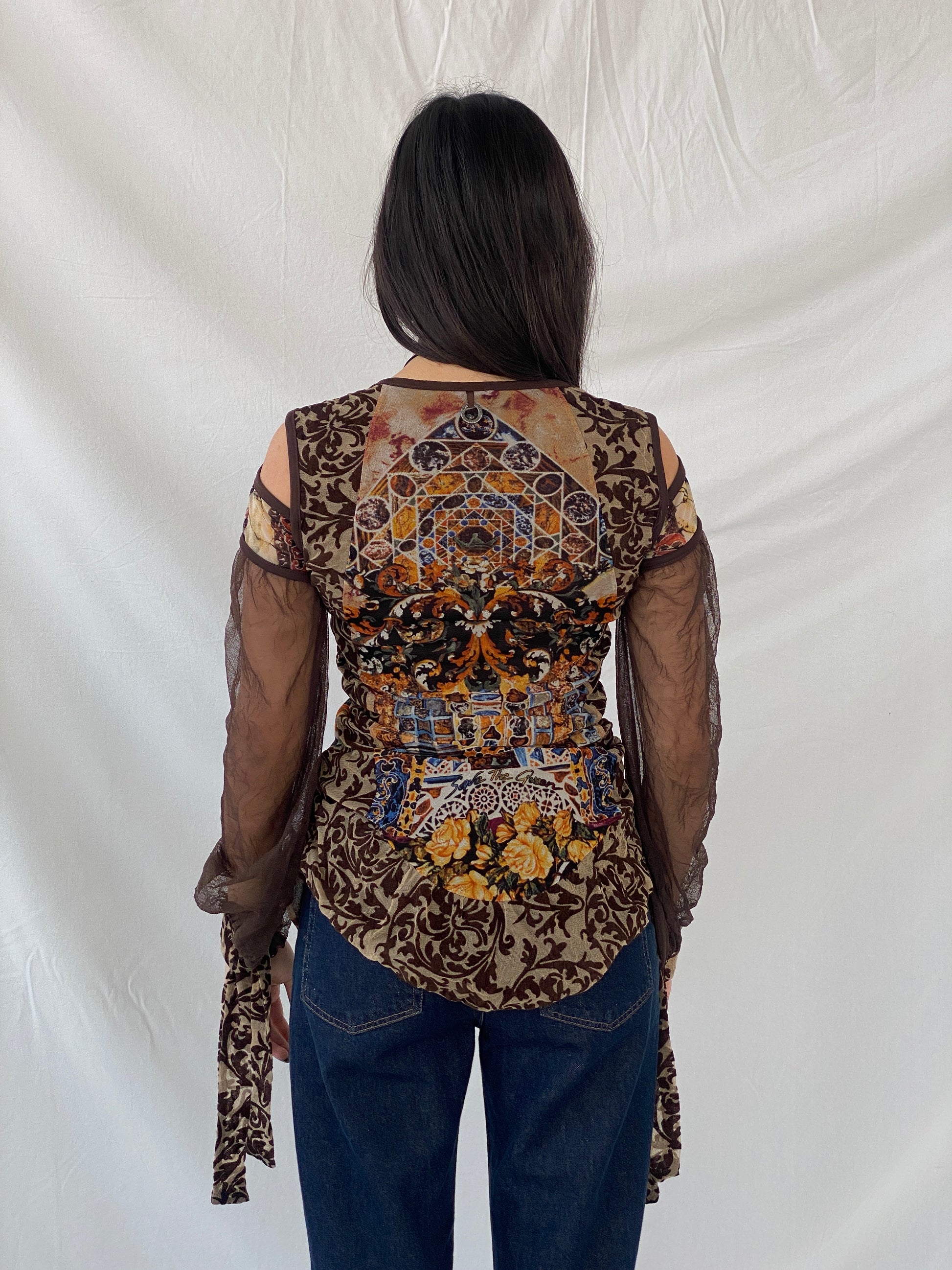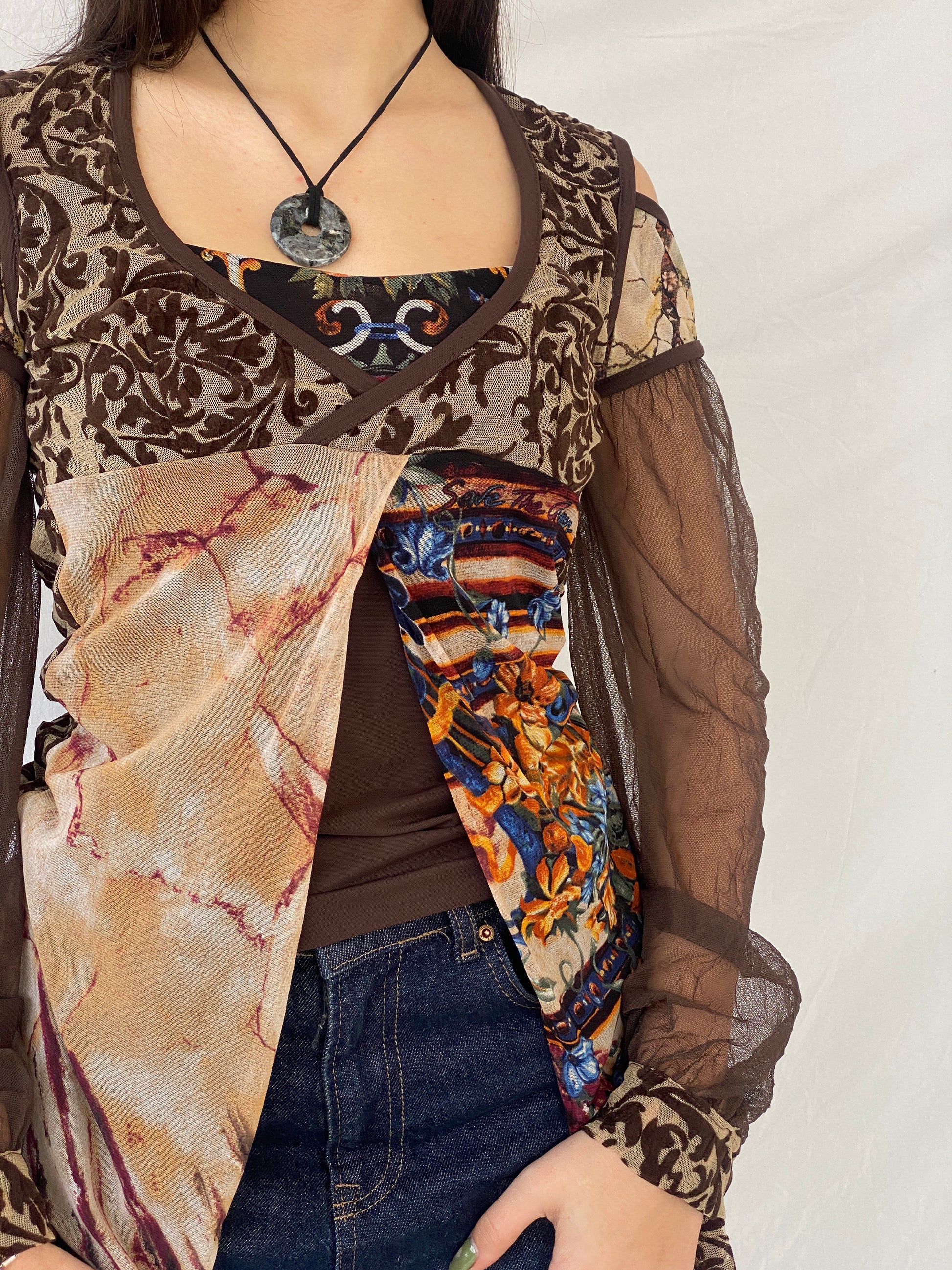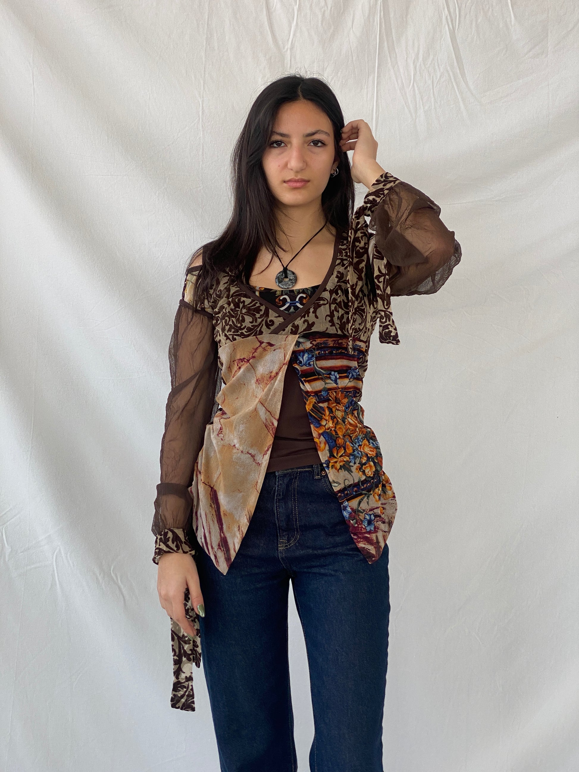 بلوزة "أنقذوا الملكة" بنية اللون بأكمام طويلة شفافة غير متماثلة - مقاس متوسط