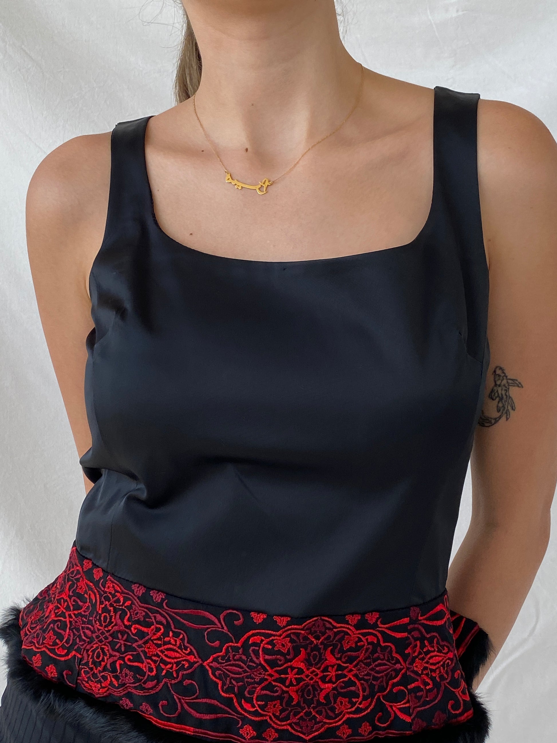 Sinéquanone Paris بلوزة مفتوحة الظهر باللون الأسود والأحمر مطرزة بحواف من الريش - مقاس M