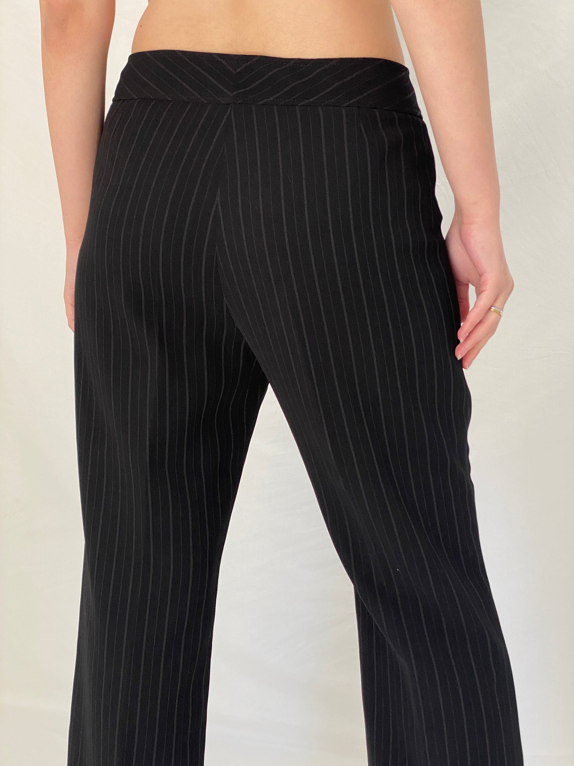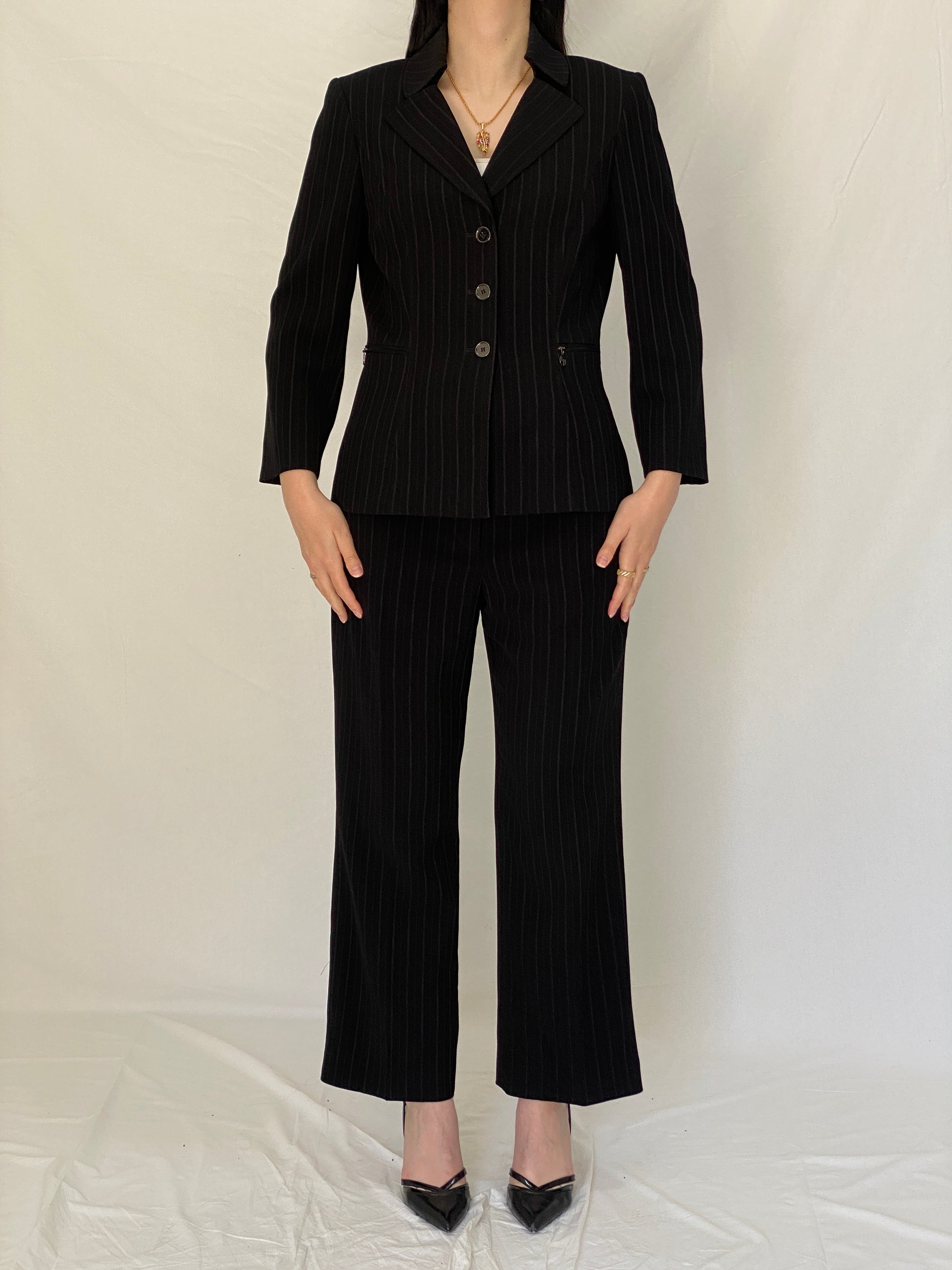 A sharp and timeless vintage Tahari Arthur S. Levine office suit featuring a tailored black pinstripe blazer paired with matching straight-leg trousers. Designed with a flattering, structured silhouette, this set embodies classic office core elegance with a powerful yet feminine feel.